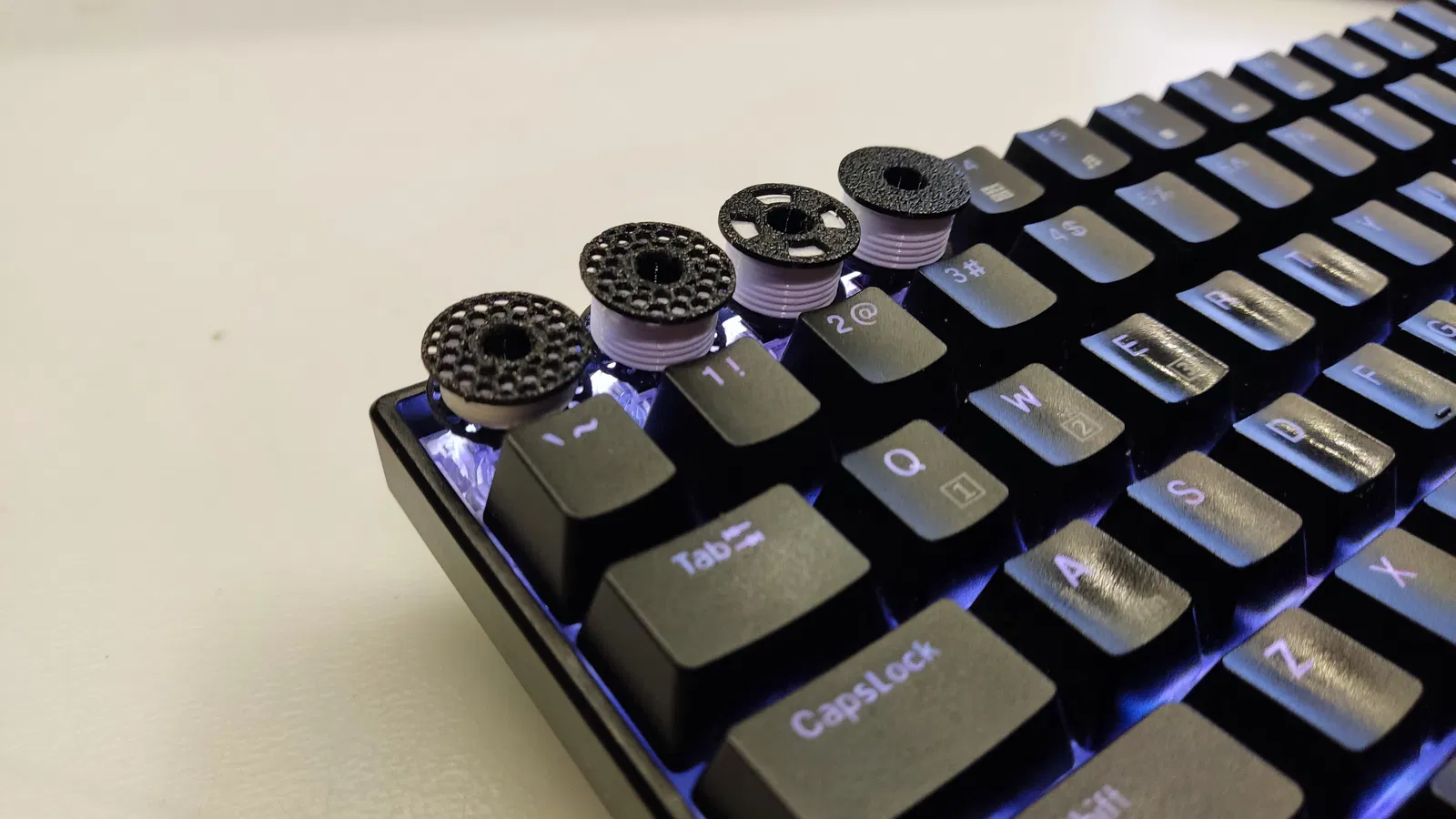 Có ba loại cuộn chỉ (spool) khác nhau để bạn có thể tạo ra keycap cuộn chỉ này. Có loại có hoa văn lục giác, loại có bốn khe và loại có hai mặt kín, tùy theo thương hiệu filament bạn thích.