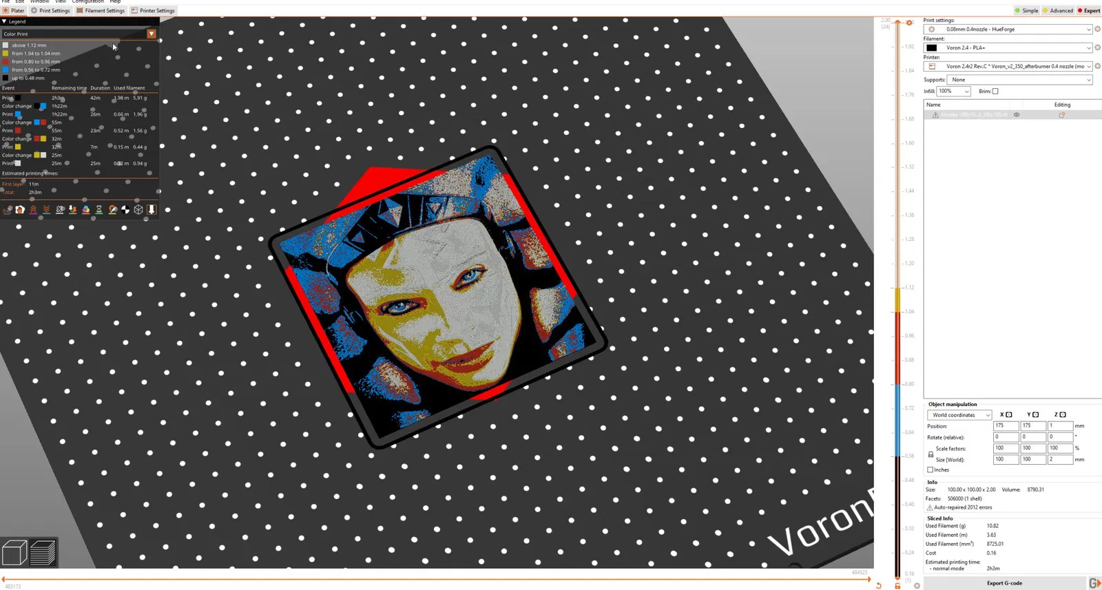 Hướng dẫn thay đổi: Bắt đầu với ĐEN Tại lớp #6 (0.56mm) chuyển sang XANH DƯƠNG Tại lớp #9 (0.8mm) chuyển sang ĐỎ Tại lớp #12 (1.04mm) chuyển sang VÀNG Tại lớp #13 (1.12mm) chuyển sang TRẮNG cho phần còn lại.