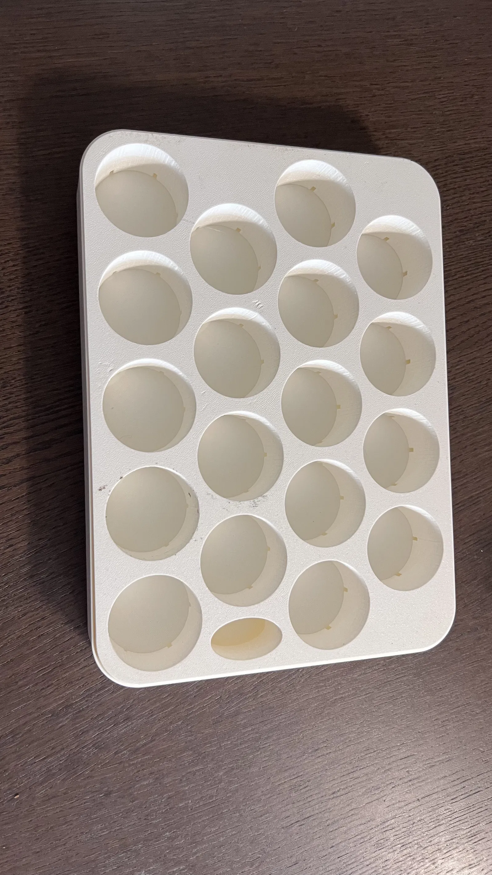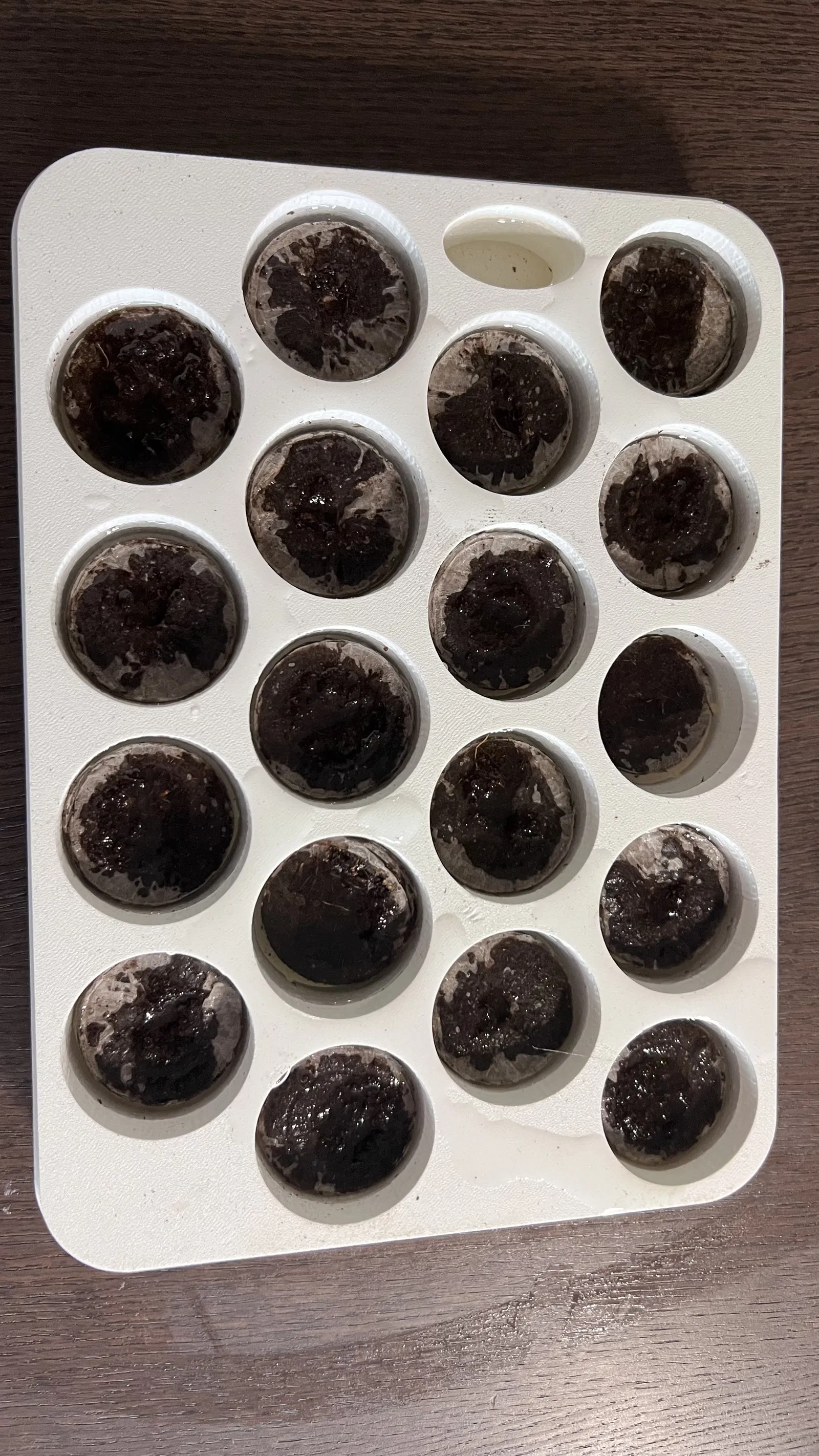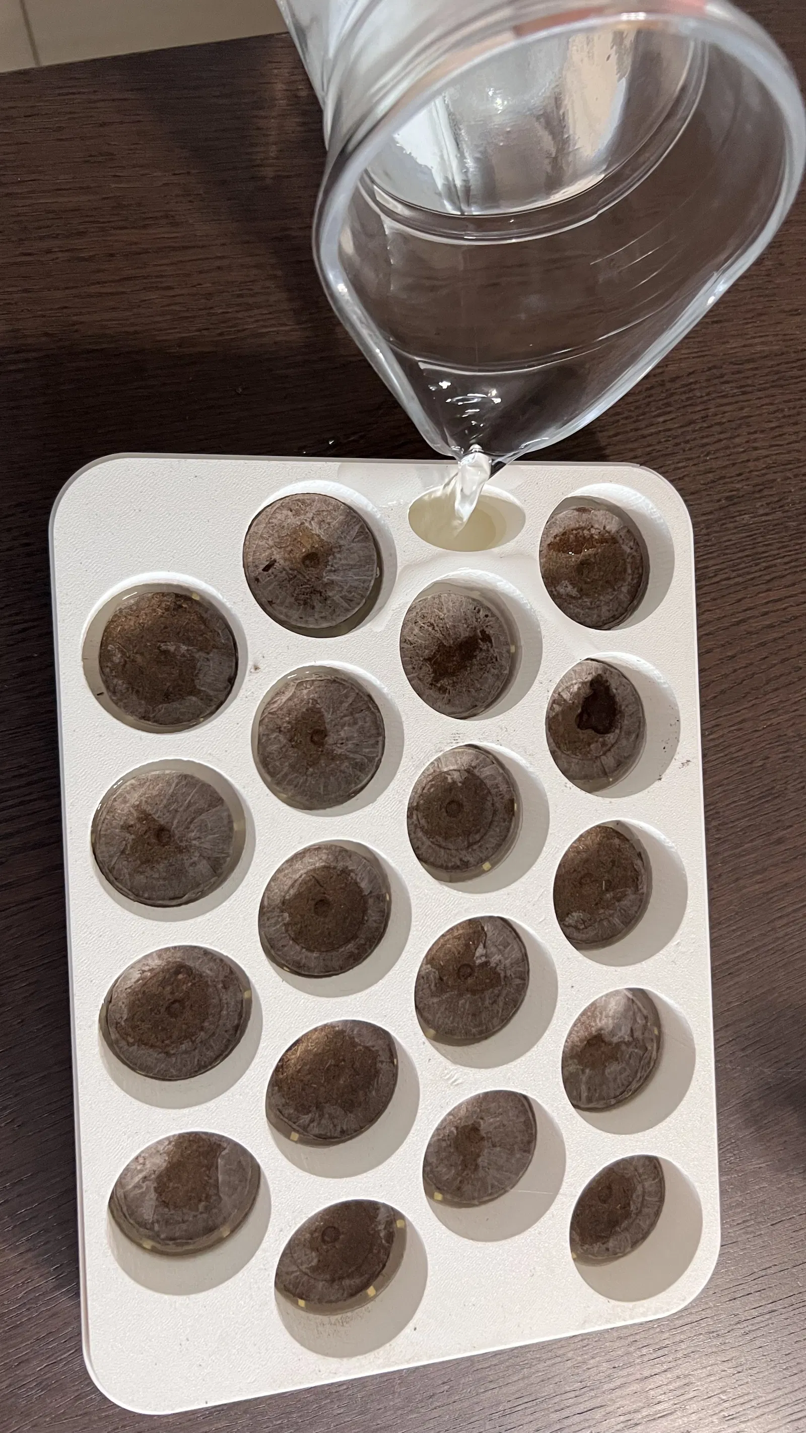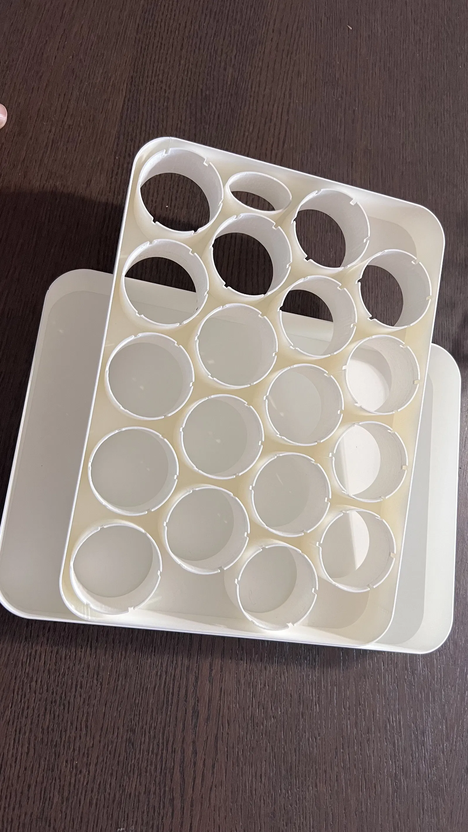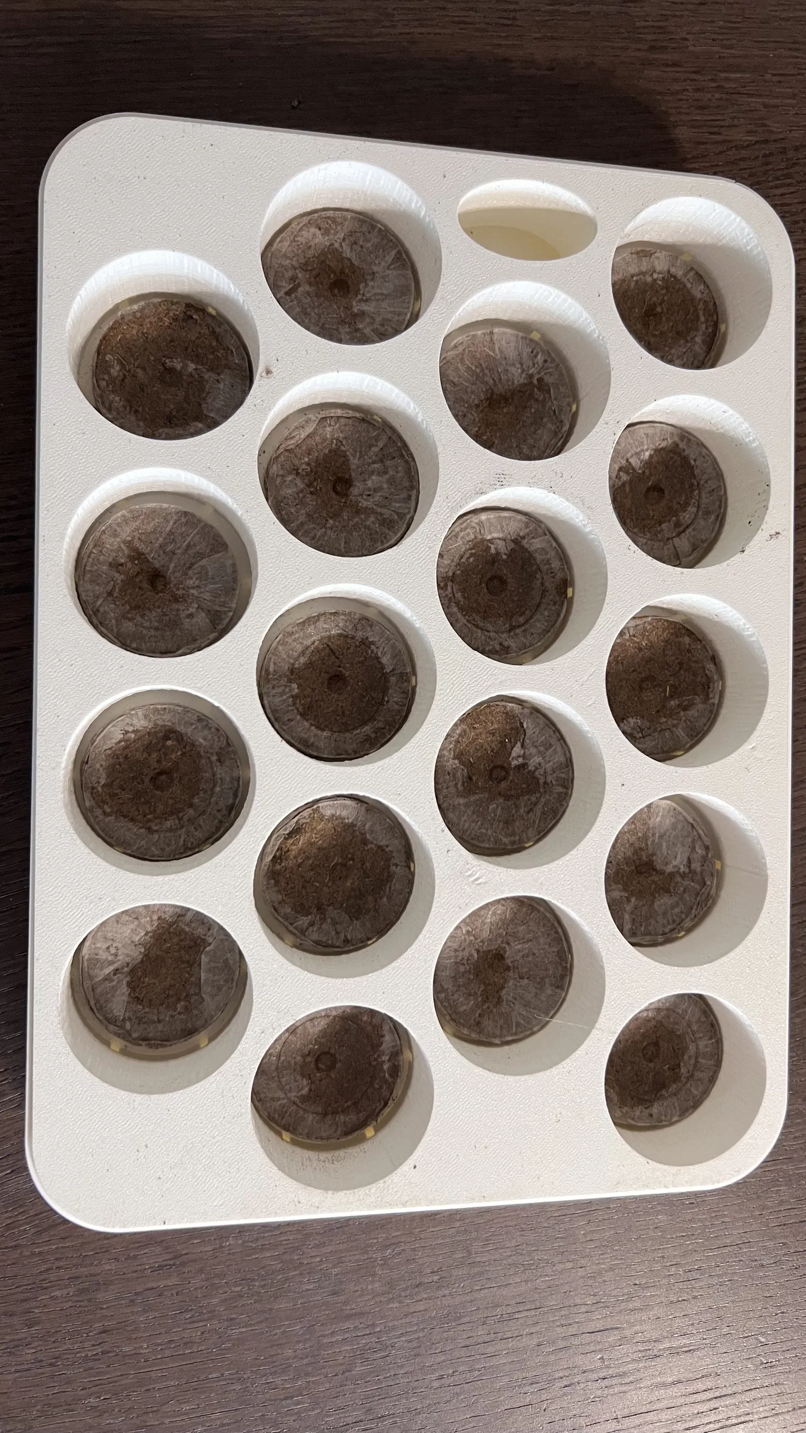 Phần ruột, được đặt vào trong phần vỏ, có 18 lỗ tròn dành cho viên nén Jiffy và một lỗ bầu dục để tưới nước.