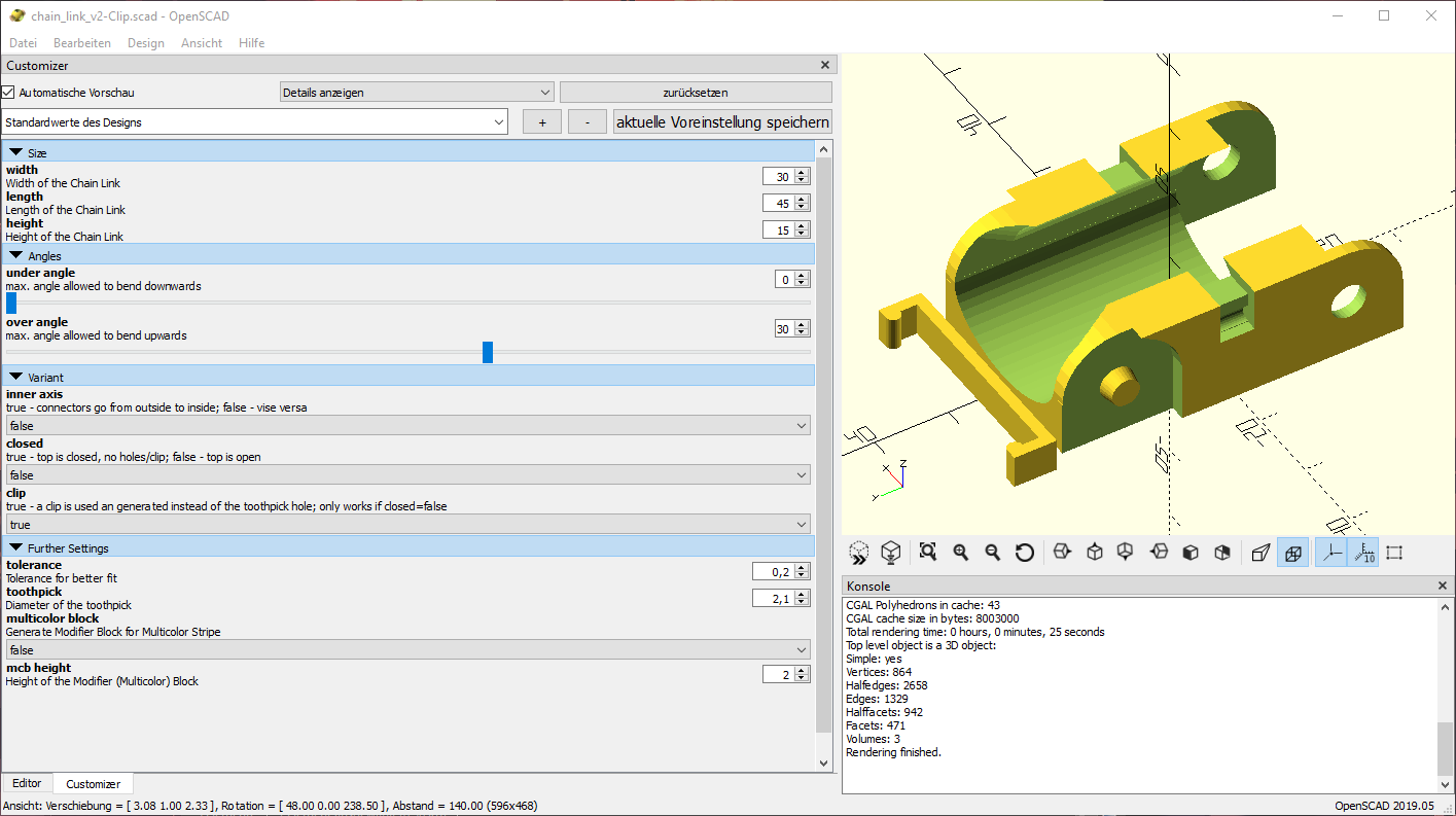 Model này có thể sửa đổi về Chiều rộng, Chiều dài và Chiều cao. Ngoài ra, bán kính uốn cong tối đa và tối thiểu có thể được chỉ định. Các chốt kết nối có thể được đặt ở bên ngoài hoặc bên trong và Mắt xích có thể là Đóng hoặc Mở. Nếu Mắt xích được định nghĩa là mở, thì có tùy chọn sử dụng Kẹp hoặc tăm để đóng phần trên sau đó. Kẹp được tạo tự động và gắn vào, còn tăm được luồn qua hai lỗ và bẻ gãy bằng phẳng. Độ dung sai và đường kính tăm cũng có thể được chọn. Ngoài ra còn có tùy chọn tạo Khối sửa đổi để cho phép Thay đổi màu sắc ở giữa.