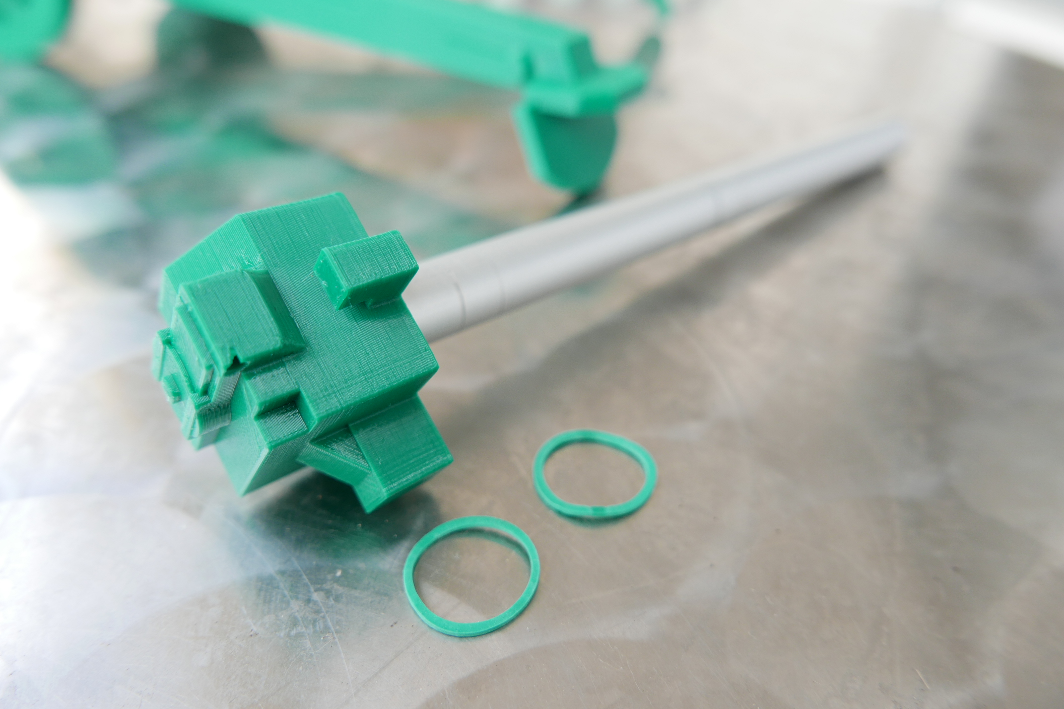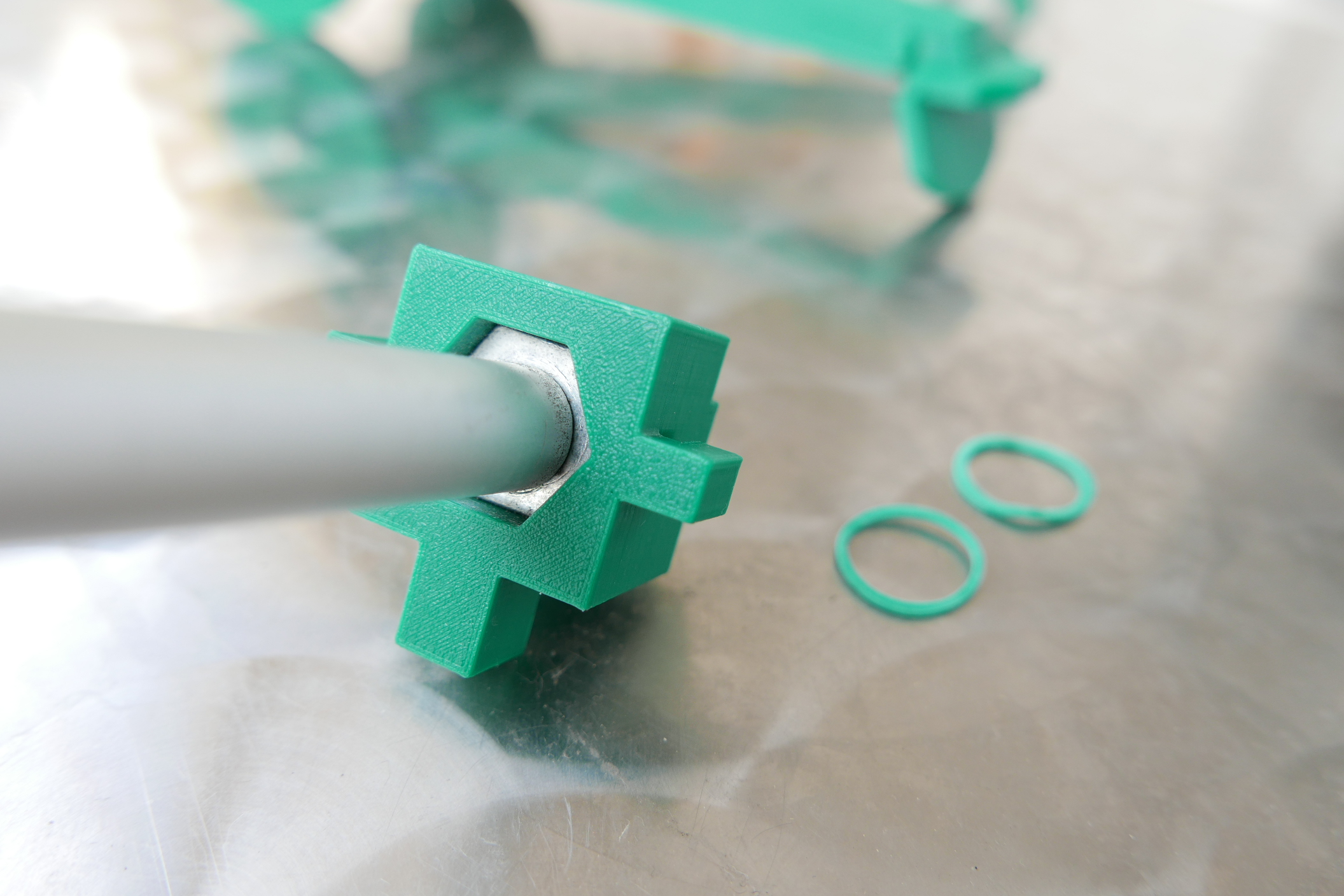 - KHÓA NÒNG – đổ đầy 90%, thời gian in khoảng 3 giờ, có giá đỡ trên đế. Luồn nòng pháo (hình lục giác) vào lỗ lục giác trên khóa nòng. Nếu chặt, hãy dùng lực/cú va đập hoặc mài nhẹ/mở rộng lỗ lục giác. Trong trường hợp lỗ lục giác bằng nhựa, bạn có thể mài nhẹ. Cố định khóa nòng vào pháo bằng dây chun văn phòng (ví dụ: của hãng Herlitz), ví dụ đường kính khoảng 15mm hoặc 45mm (chéo-kép), tùy thuộc vào mức độ phản lực bạn muốn có (tùy thuộc vào sức mạnh của pháo nổ/lực giật).