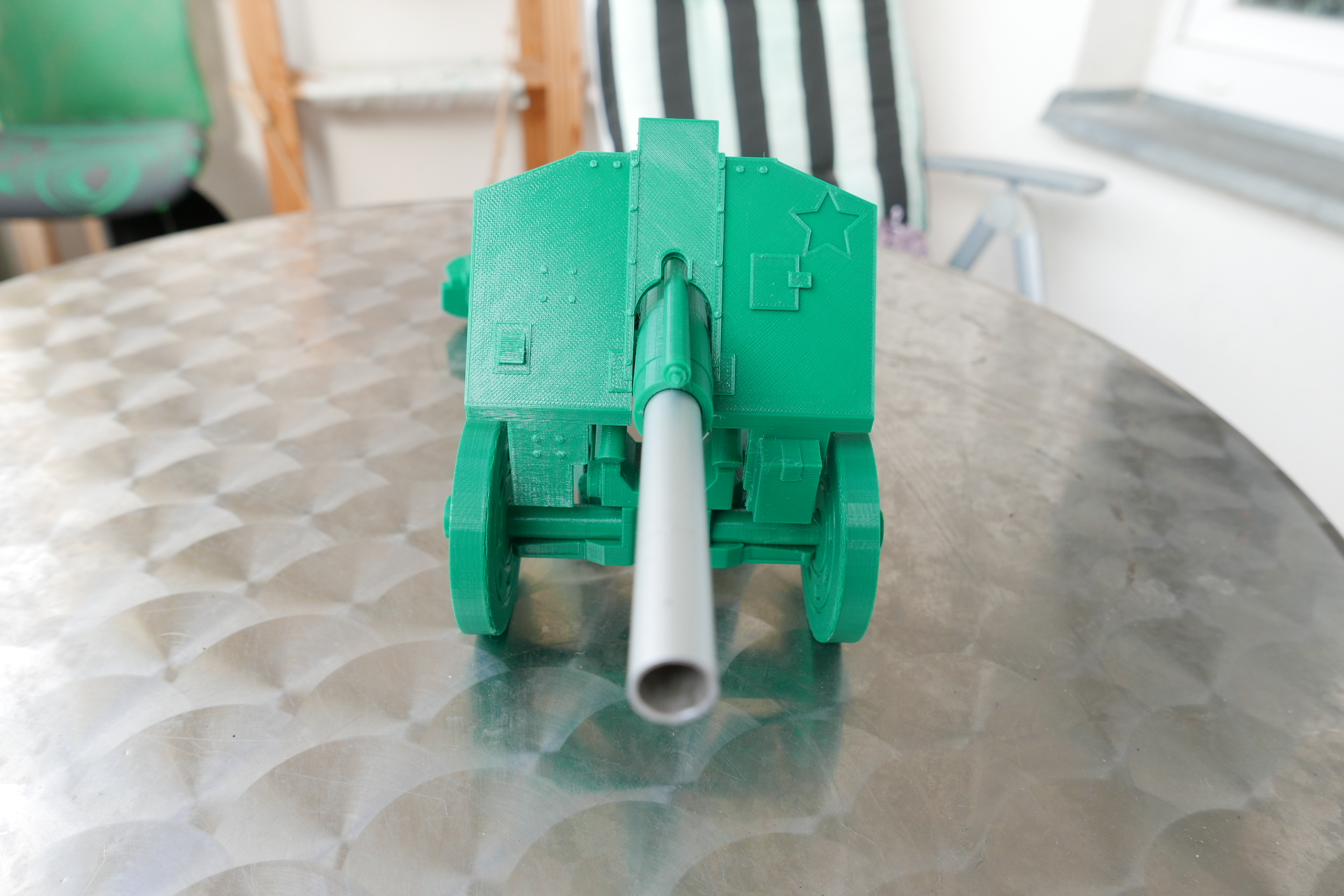 - PHÁO – đổ đầy 90%, thời gian in khoảng 8 giờ. Để gắn pháo vào bánh xe xoay, sử dụng vít 3x40 với đai ốc và bốn vòng đệm. Việc lắp vòng đệm giữa pháo và bánh xe xoay rất khó khăn, trước khi lắp pháo vào bánh xe xoay, tôi đã dán các vòng đệm bên trong vào pháo bằng keo siêu dính. Tôi đã dán một miếng băng dính mềm vào mặt sau của pháo để giảm chấn khi nòng pháo giật lùi về phía trước.