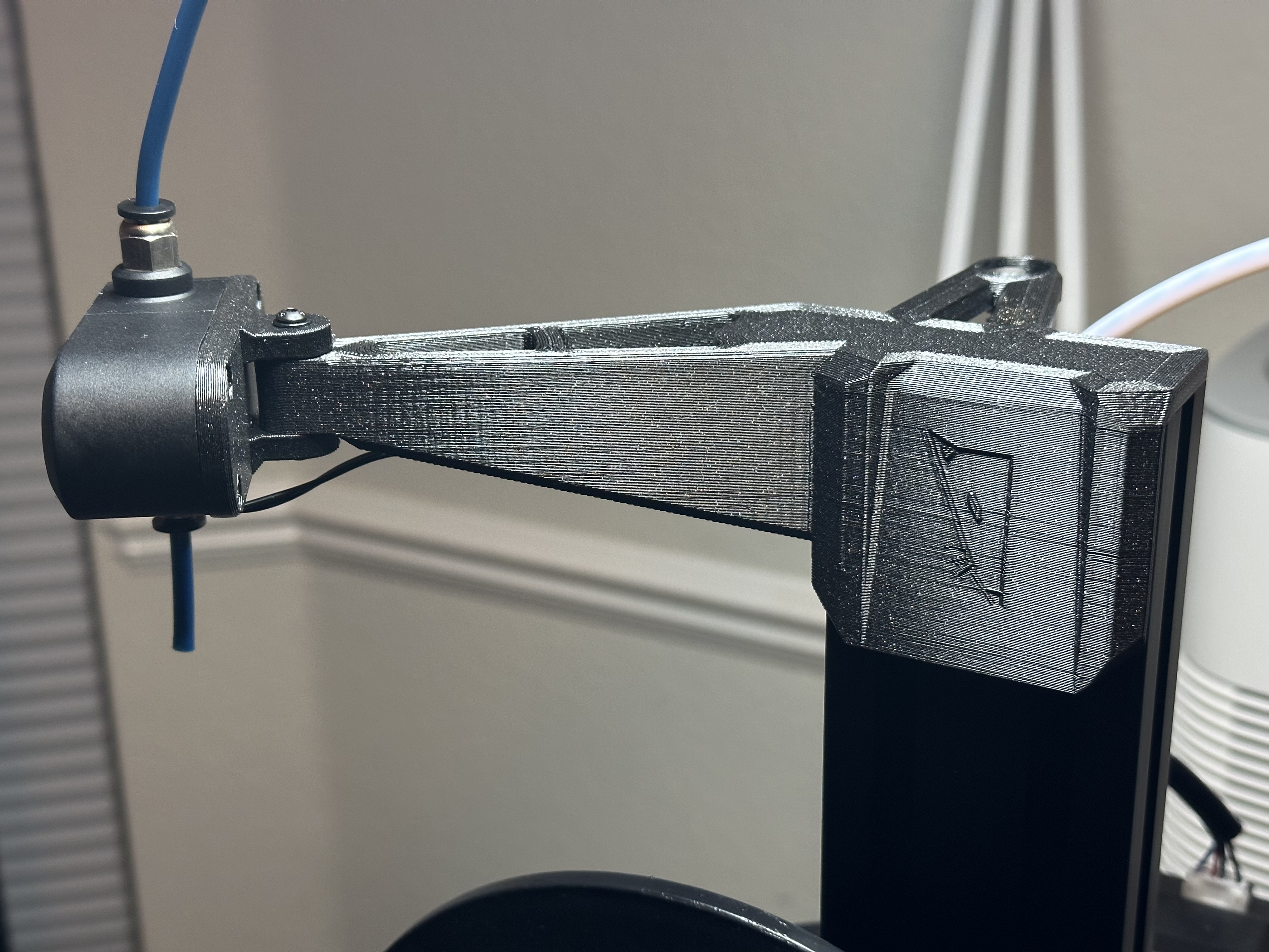 - Tích hợp một cánh tay rất cứng để gắn Cảm biến Filament Thông minh BTT (BTT SFS) phía trên cuộn dây. Dựa trên thiết kế của edbdii. Cánh tay dày hơn cho phép bạn sử dụng 2 x ốc định nhiệt M3, trên và dưới, để gắn SFS (nếu muốn).