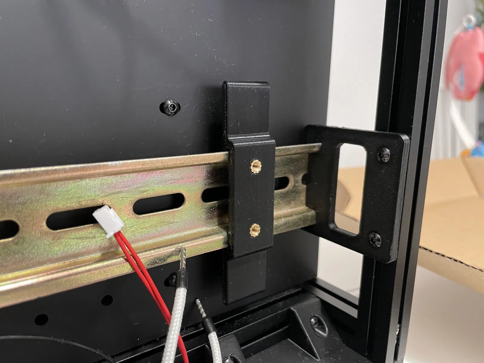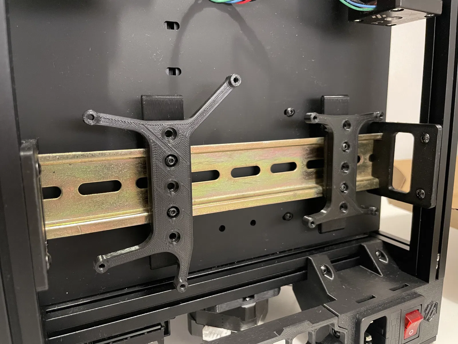 - Ray DIN nằm phẳng với các thanh nhôm ngang của máy in để có thể thêm một thanh dọc (cho mục đích sắp xếp cáp).