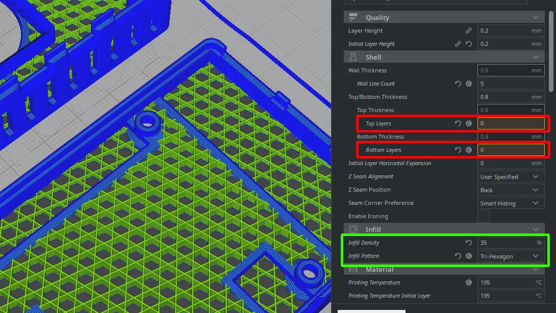 Số lượng đường tường = 4, Lớp trên & dưới = 0, Tốc độ in = 40, Tốc độ lớp đầu tiên = 10