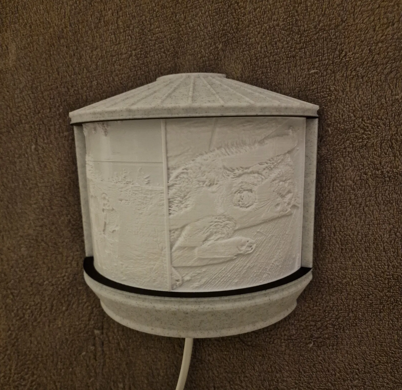 Mô hình Đèn Lithophane để gắn lên tường. Hỗ trợ hai ảnh 1:1 hoặc một ảnh 2:1. Sử dụng bóng đèn E14. Hướng dẫn chi tiết cách in và lắp ráp không cần hỗ trợ, với các tùy chọn chốt và khuyến nghị dán để tăng độ cứng.