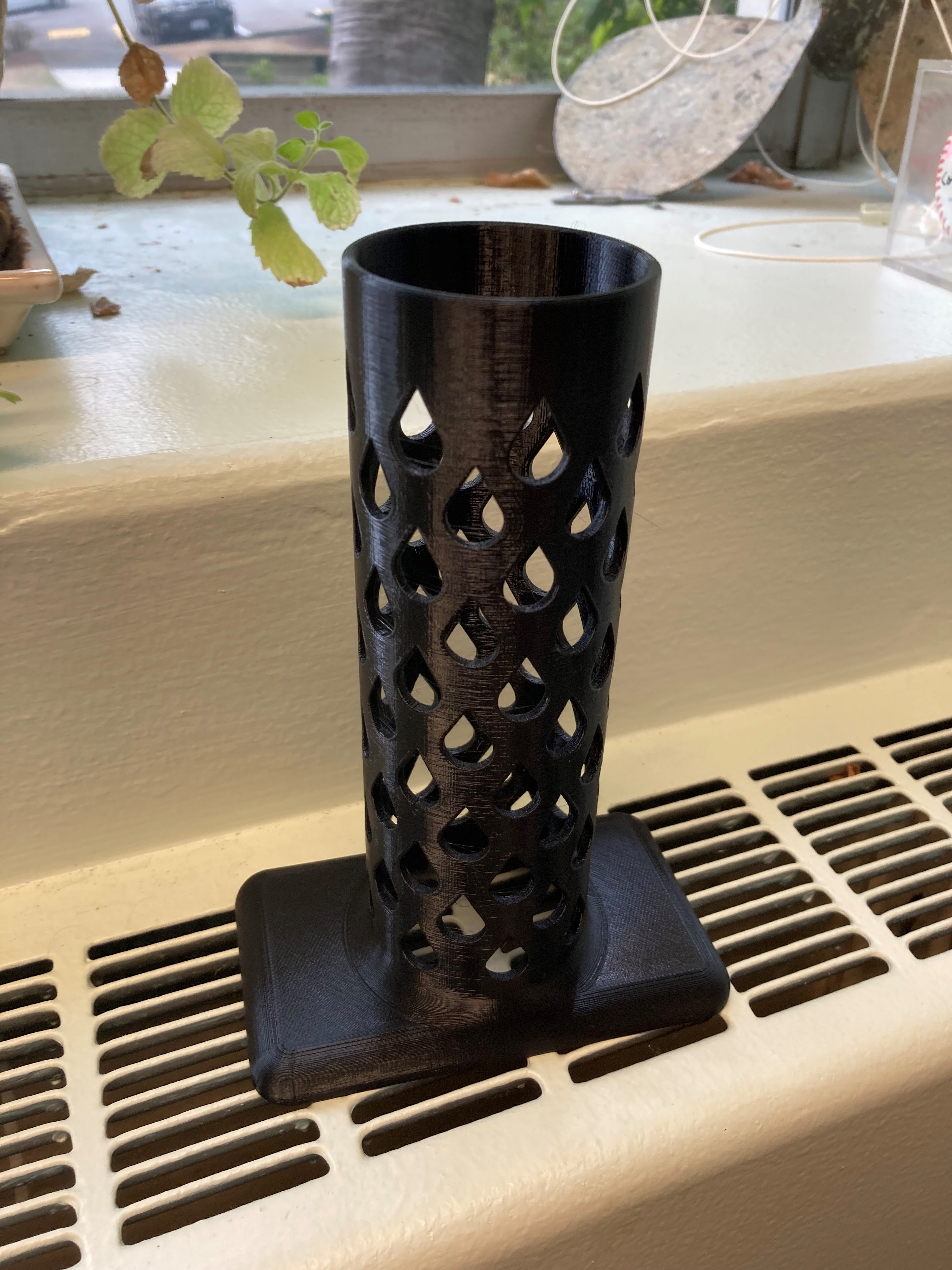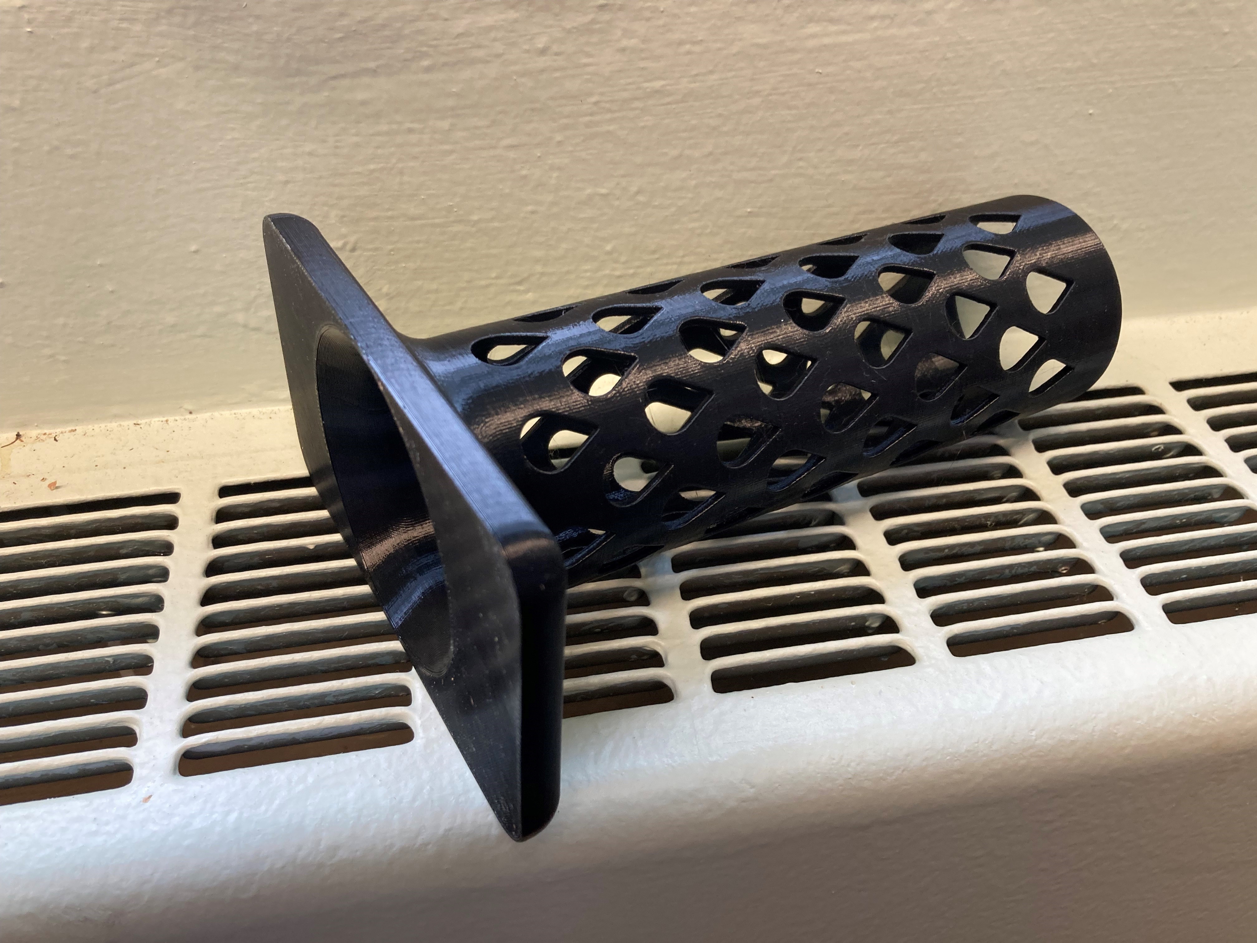 Tôi bắt đầu bằng cách xem qua các thiết kế máy sấy găng tay đã có trên printables.com. Tôi tìm thấy một số tính năng hay được sao chép, đặc biệt là các lỗ mở hình dạng mưa. Nhưng không có thiết kế nào có một nền tảng vuông và một ống trung tâm để kênh nhiệt lên khi đặt trên một thứ ấm áp. Do đó, tôi thiết kế theo ý muốn. Hình ảnh với nền tảng mịn là một in 3D bằng PLA, máy sấy găng tay trong văn phòng của tôi chỉ vừa ấm áp. Hình ảnh với nền tảng gờ là một in 3D bằng PETG. Thiết kế này có một bức tường cao hơn để chuyển tiếp trên và thêm một số lỗ 5mm đường kính nghiêng để kênh một ít không khí ra ngoài găng tay.