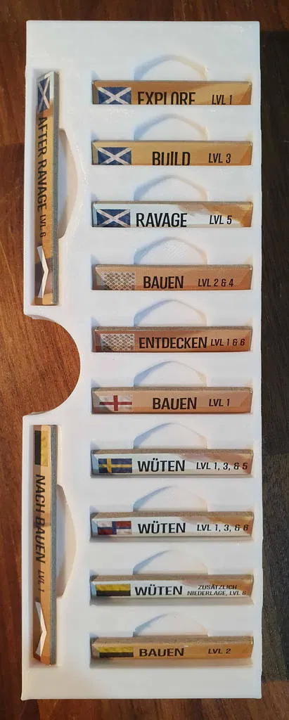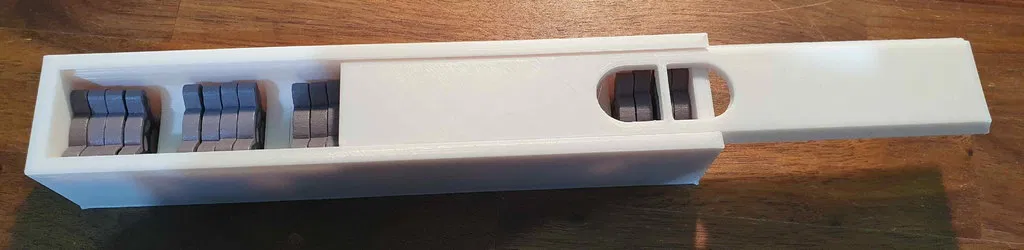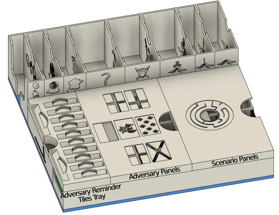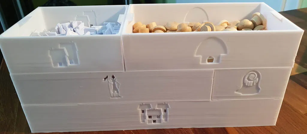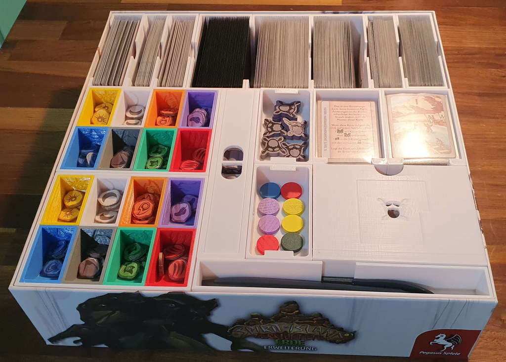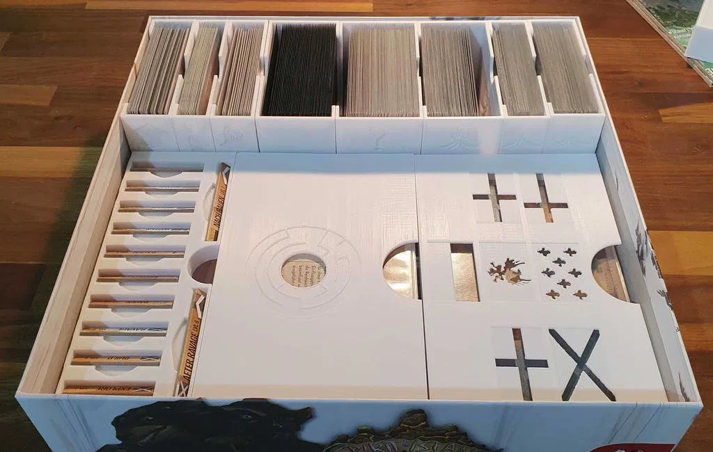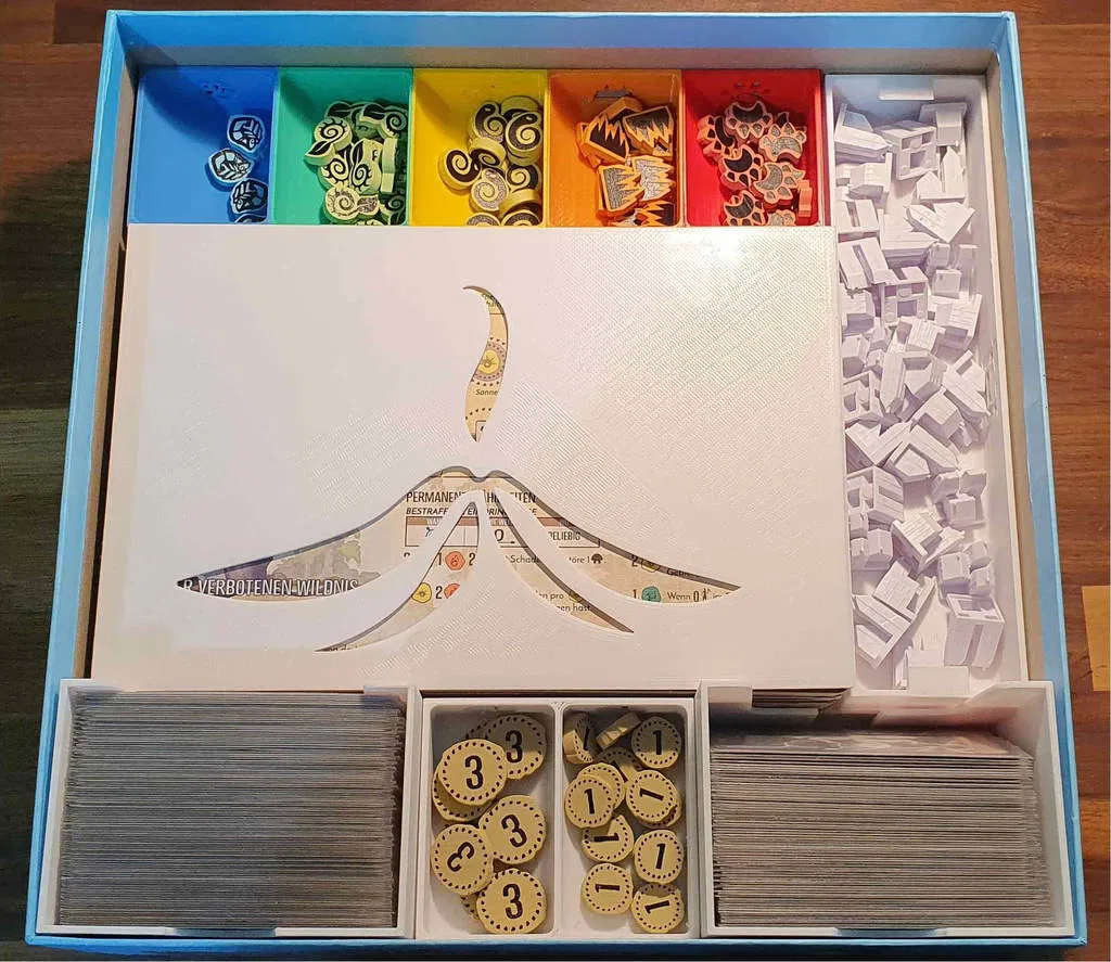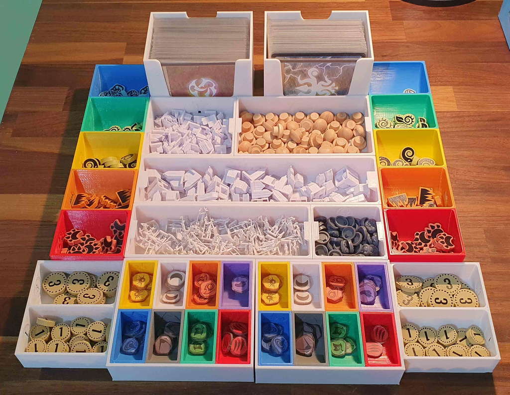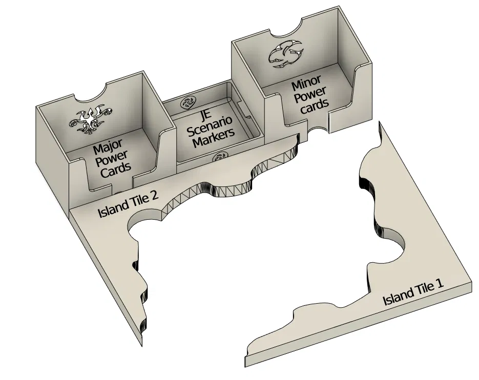 Có một phiên bản mới cho bộ insert này, bao gồm cả Nature Incarnate. Bạn có thể tìm thấy nó ở đây. Bạn vẫn có thể sử dụng cái này nếu muốn. Bộ insert này được thiết kế để chứa tất cả nội dung có sẵn của Spirit Island cho đến Jagged Earth (bao gồm game gốc, Branch & Claw, Jagged Earth, Feather and Flame) với thẻ có bọc chất lượng tốt trong hộp game gốc và hộp Jagged Earth. Bộ insert được tối ưu hóa cho việc chơi nhiều người, với các khay đựng năng lượng, nguyên tố và các token khác có sẵn theo cặp. Trong tên tệp có ghi rõ bạn cần in tệp đó bao nhiêu lần. Khay nguyên tố và khay đựng các token thú, vùng đất xấu, hoang dã, bệnh tật và xung đột có thể được in riêng theo màu tương ứng, hoặc in toàn bộ trong một màu. Khay sợ hãi với nắp trượt có sẵn trong phiên bản dành cho các token sợ hãi cao cấp và phiên bản dành cho các token sợ hãi bình thường bằng bìa cứng. Nếu diện tích bàn in của bạn không đủ lớn để in giá đỡ khay hiện diện lớn, bạn có thể in giá đỡ khay hiện diện nhỏ hai lần để thay thế giá đỡ khay hiện diện lớn (tổng cộng bạn in 3 lần). Bộ insert cung cấp không gian cho ba khay hiện diện in thêm và các token hiện diện (ví dụ: màu đen, nâu và xám). Khi thiết kế các khay hiện diện, tôi nhận thấy rằng các token hiện diện bằng gỗ có độ rộng rất khác nhau khi đặt cạnh nhau. Tôi đã cung cấp một tệp tải xuống là một khay đủ rộng để tất cả các token hiện diện đều vừa vặn mà không gặp sự cố. Tôi cũng đã cung cấp một tệp Fusion để có thể điều chỉnh các khay hiện diện nếu bạn muốn các token hiện diện vừa khít hơn trong khay. Tất cả các sách hướng dẫn nên được cất giữ trong hộp Jagged Earth và có thể đặt ở dưới đáy hộp nếu không cần thường xuyên, hoặc ở trên cùng nếu cần thường xuyên hơn. Hãy cho tôi biết nếu có bất cứ điều gì có thể cải thiện và nếu bạn in bộ insert này, vui lòng đăng một ảnh chụp sản phẩm hoàn thiện! ### Tín dụng * Bộ đệm Bảng Đảo 1 và 2 dựa trên Spirit Island + BC + JE Organizer của Anemic trên Thingiverse