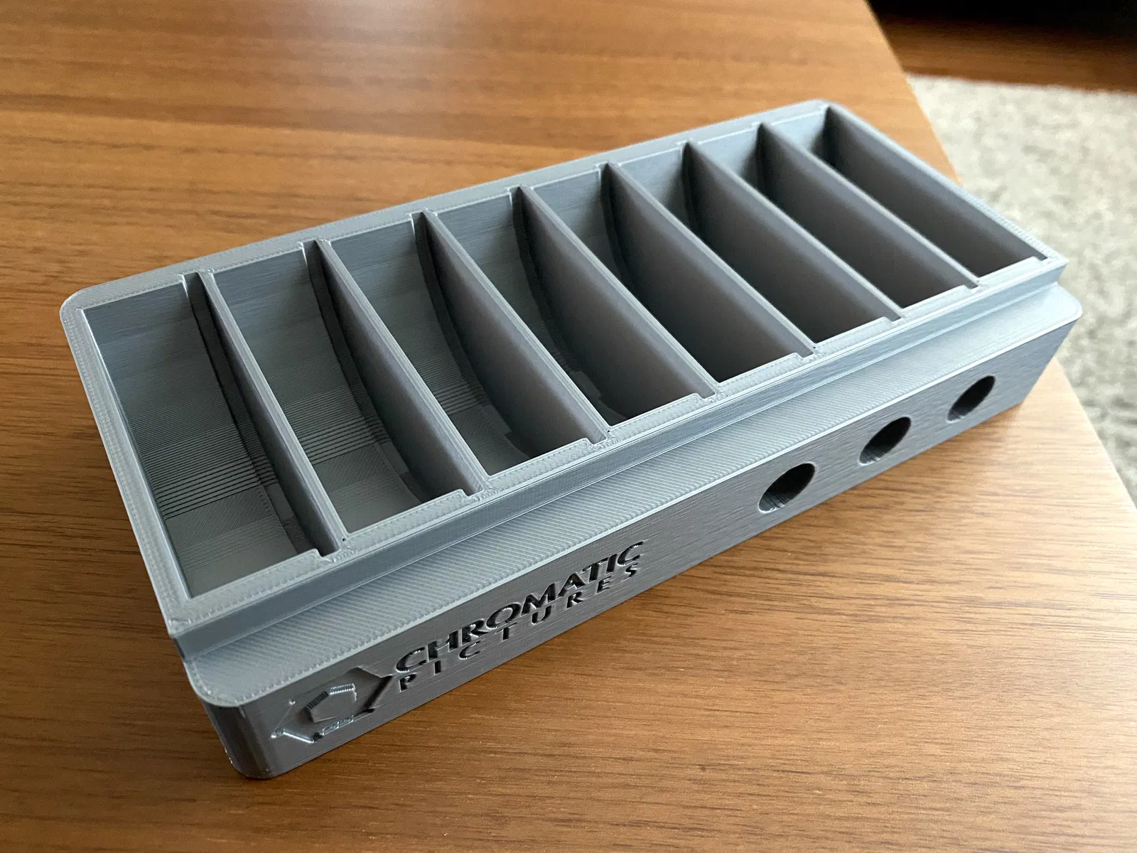 Giá đỡ Iris kênh đơn Preston, chứa được 8 vòng Iris, có chỗ dán nhãn phía trước. Được thiết kế dày dặn để in PLA, thời gian in khoảng 13 giờ. Kích thước 7.6" x 3.5" x 1.3".