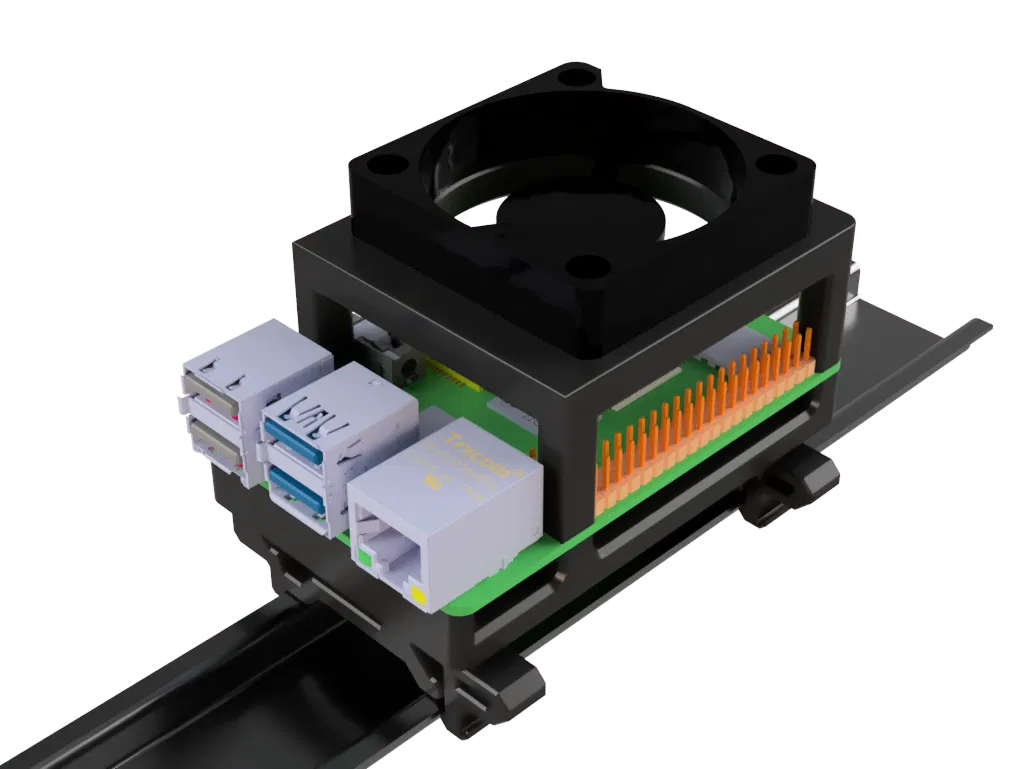 Đây là Giá đỡ Din-Rail của tôi cho Raspberry Pi 3/4, giá đỡ này được trang bị quạt 5010 để làm mát Pi.