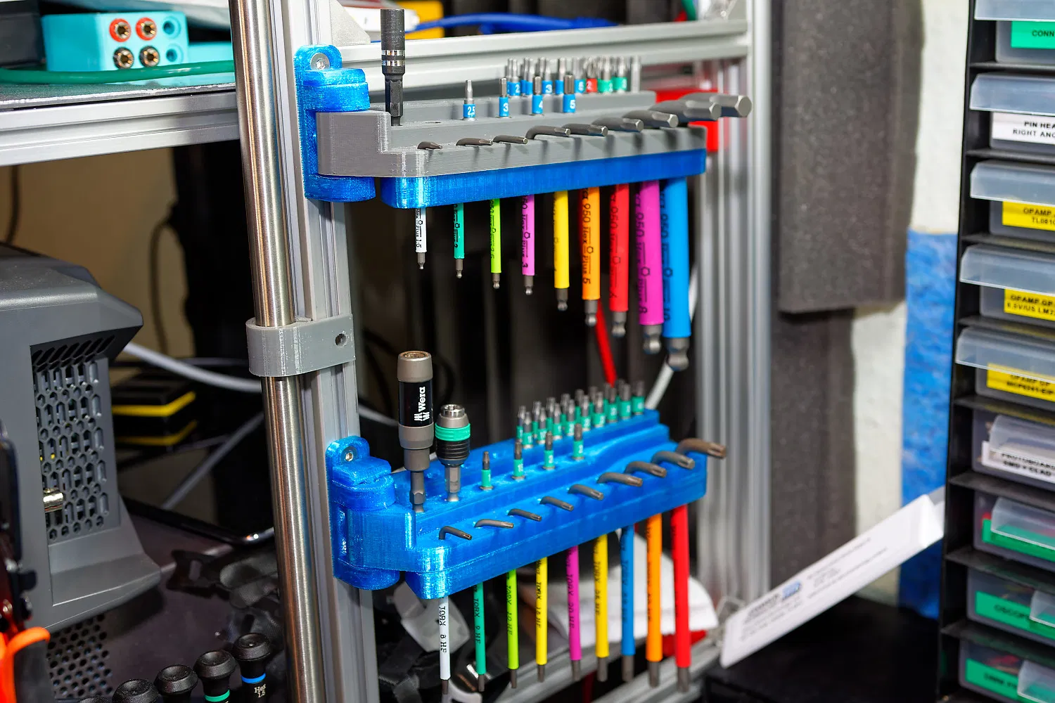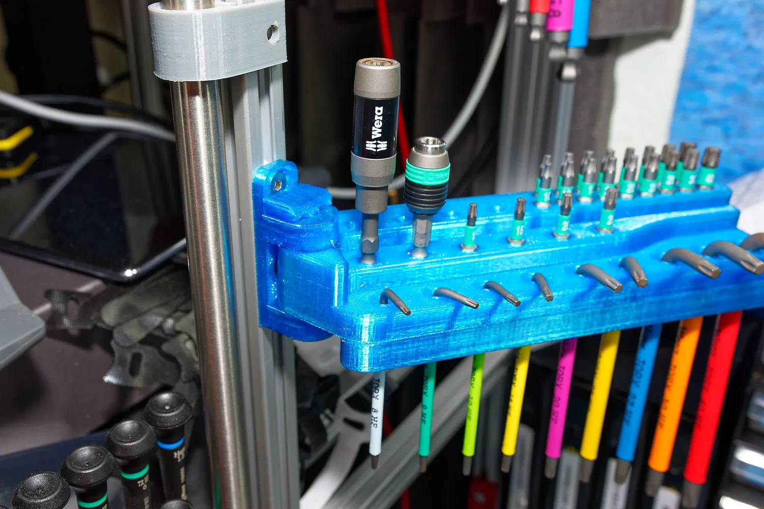 Giá đỡ bộ chìa lục giác Wera Hex Plus xoay ra. Giữ bộ 9 chìa lục giác đa sắc màu Wera, có thể gắn vào thanh nhôm định hình 2020. Thiết kế xoay giúp lưu trữ gọn gàng hoặc dễ dàng truy cập.