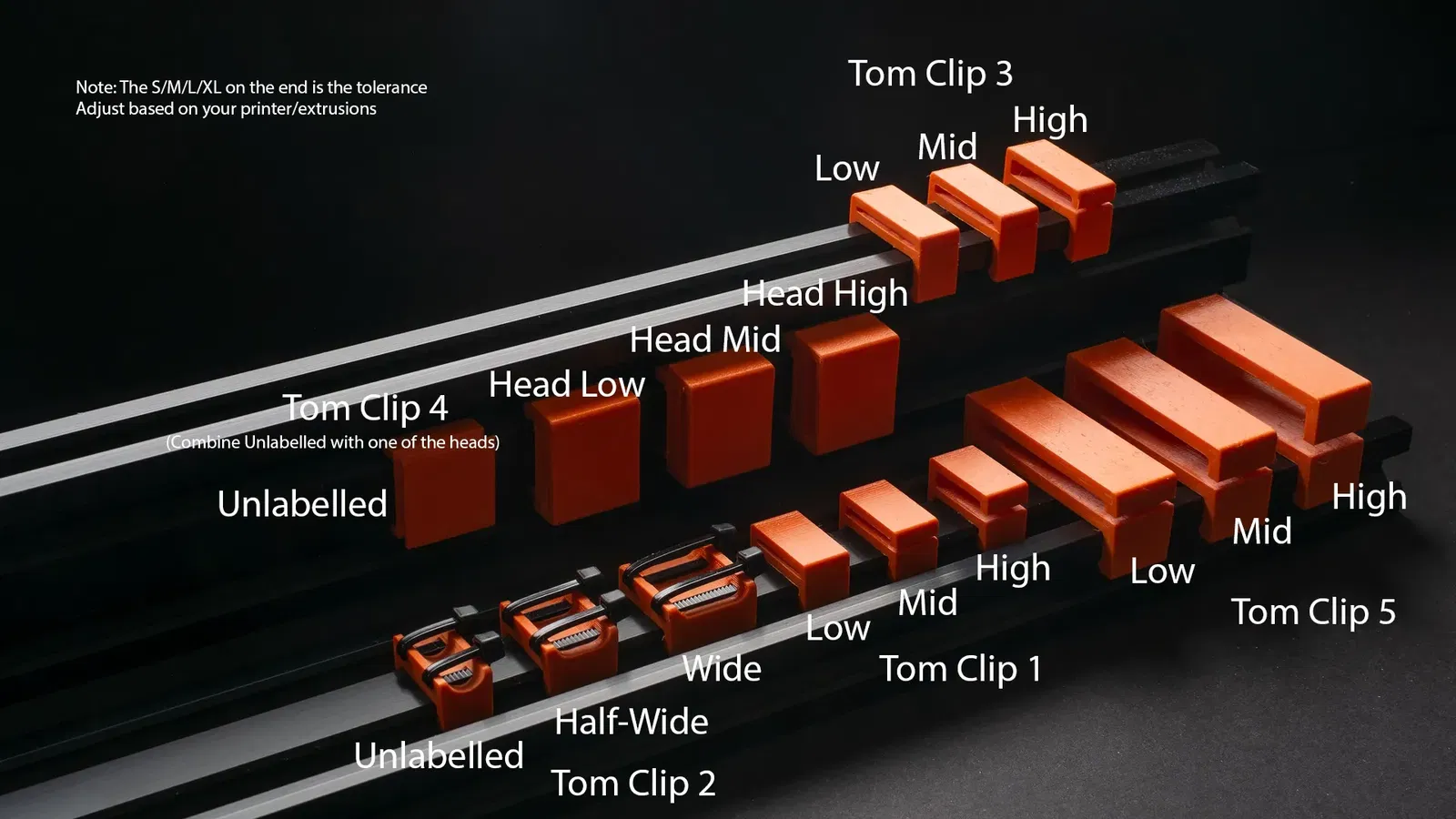 Thật không may, không có tiêu chuẩn nào cho các thanh nhôm này và chúng khác nhau về kích thước 3-4(!)/10mm tùy thuộc vào nhà sản xuất/lô hàng. Đó là lý do tại sao tất cả các kẹp đều có sẵn 3(4) độ rộng (s/m/l/(xl)) với khoảng hở 1/10mm nhiều hơn/ít hơn khi gắn. Nếu điều này vẫn chưa đủ, tôi đã thêm các tệp .dxf hoặc .step để mọi người có thể dễ dàng điều chỉnh. Tất nhiên, bạn cũng có thể đơn giản thay đổi tỷ lệ toàn bộ kẹp lên hoặc xuống trong slicer.