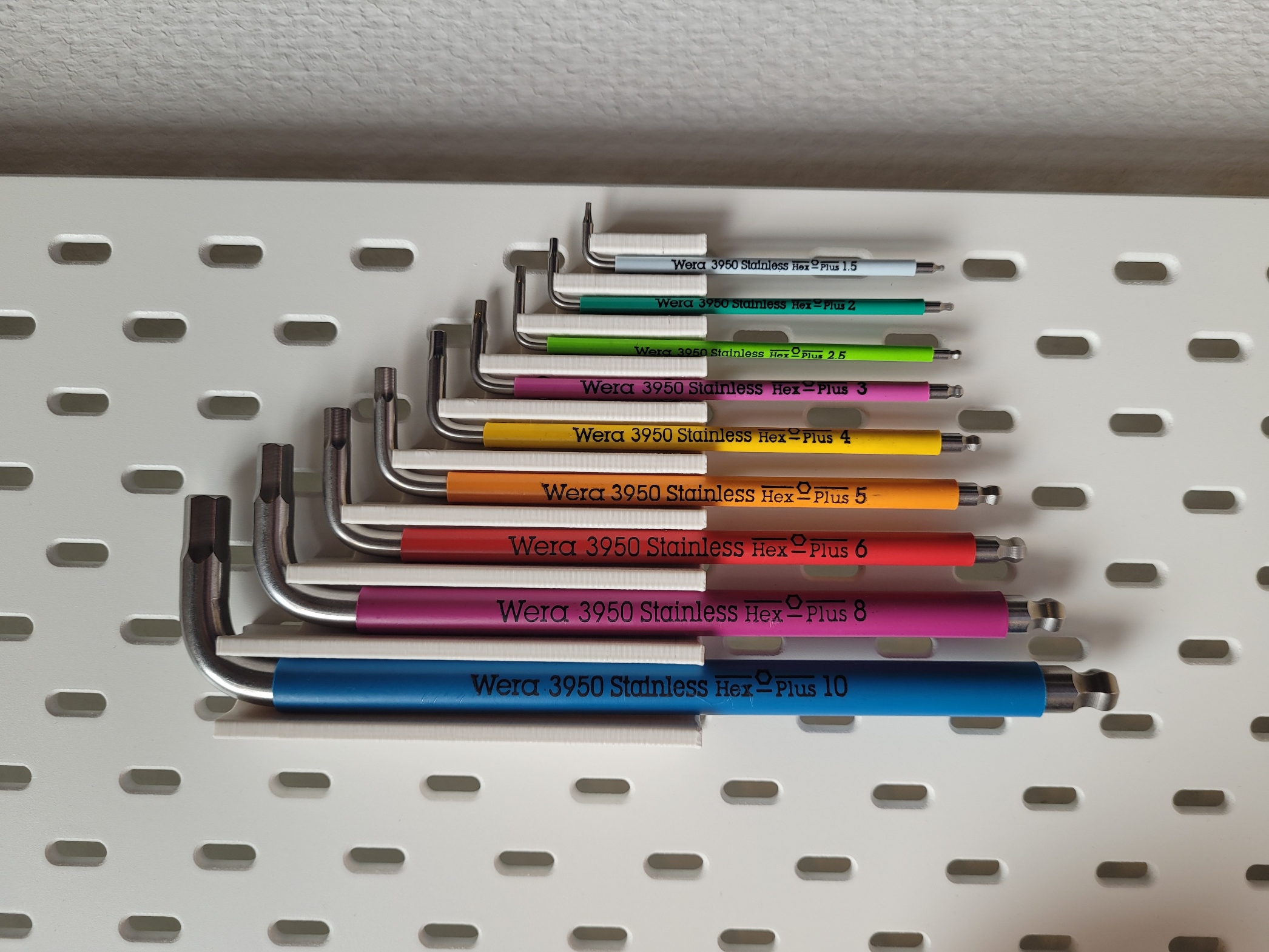 Giá đỡ nam châm tùy chỉnh cho bảng ghim Ikea Skadis, được thiết kế để giữ các chìa khóa lục giác Allen (đặc biệt là Wera Hex-plus). Dễ dàng lắp đặt với nam châm, chỉ cần một ít keo nếu cần. Được in bằng ABS và đã thử nghiệm độ khít với bảng Skadis.