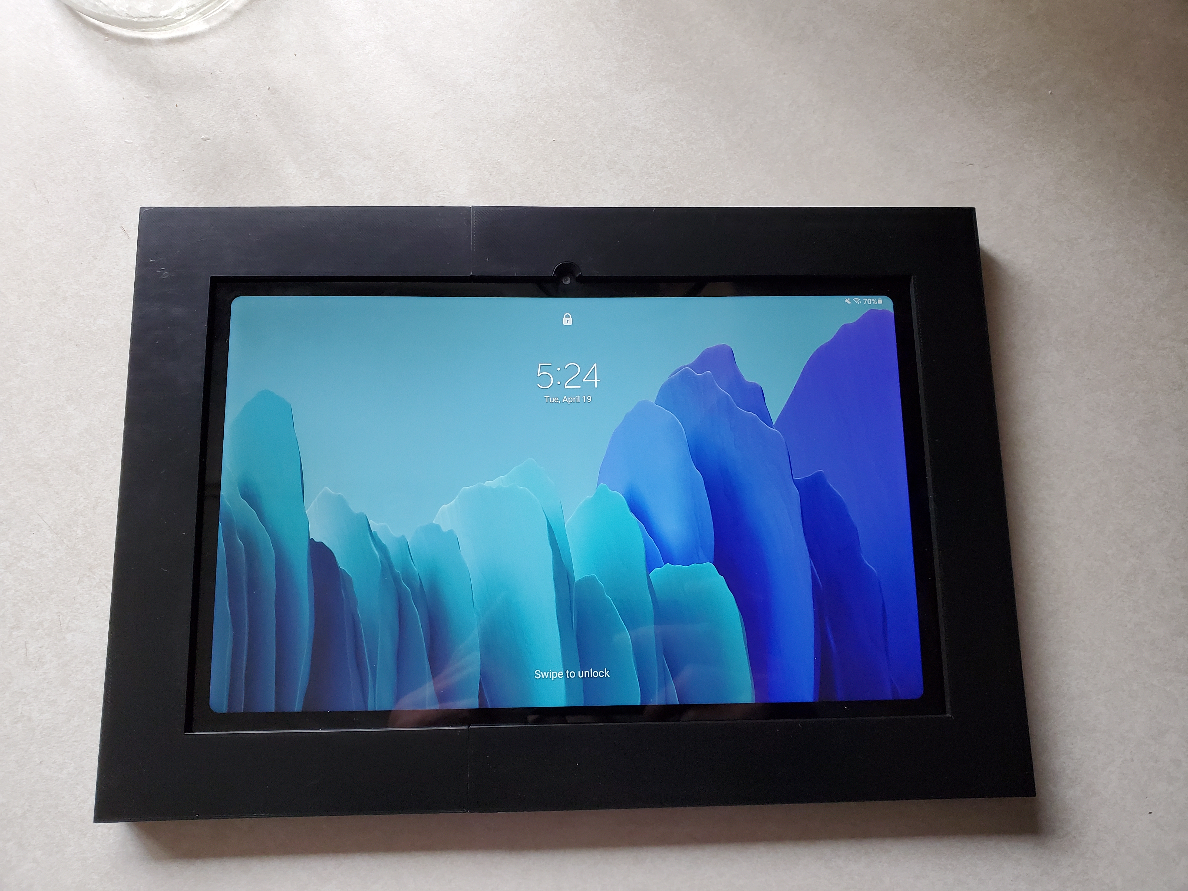 Giá treo tường cho máy tính bảng Samsung Galaxy Tab A7 ở chế độ kiosk, cho phép bạn chạy ứng dụng Home Assistant. Thiết kế bốn mảnh dễ dàng tháo lắp máy tính bảng khỏi tường.