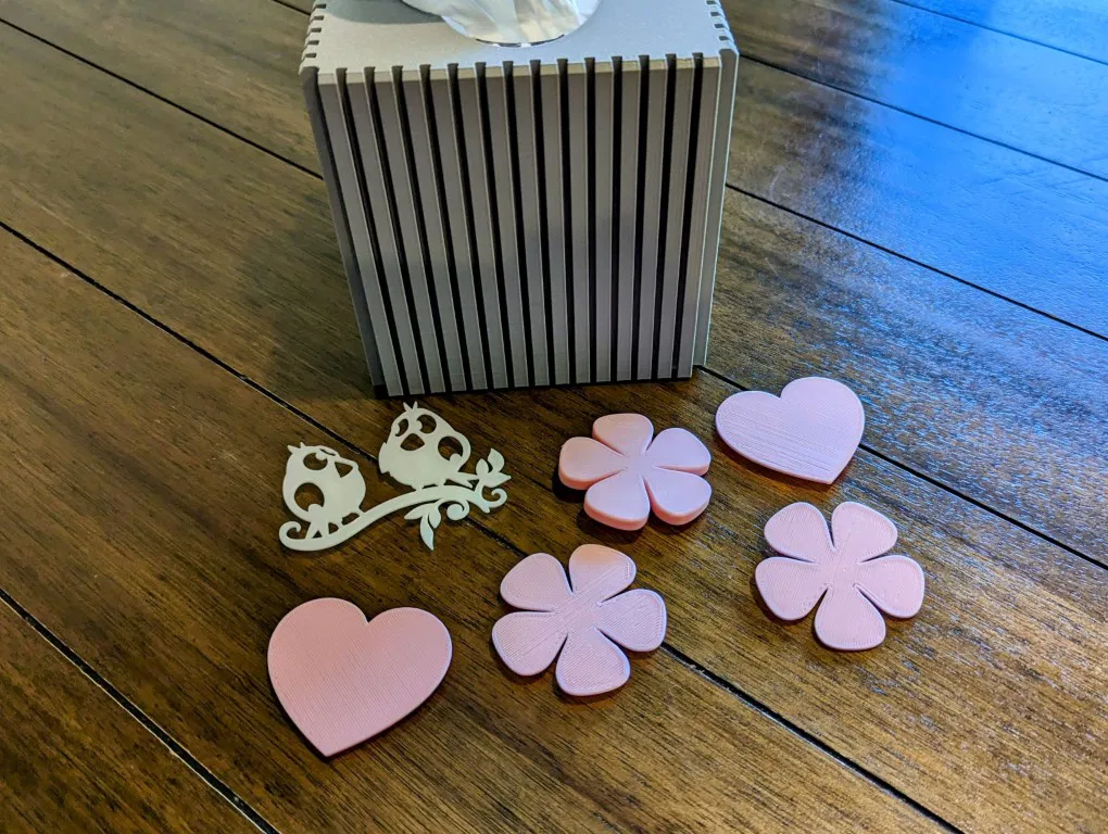 Bạn có thể trang trí bằng thiết kế của riêng mình. Chỉ cần tạo hoặc tải xuống một mô hình và thêm chốt đi kèm vào mặt sau. Nếu cần nhiều hơn một chốt, hãy đảm bảo khoảng cách giữa chúng khớp với các khe của hộp khăn giấy. Các khe cách nhau 8mm theo tâm, vì vậy hãy nhân khoảng cách giữa chốt thứ hai với chốt đầu tiên với 8mm.