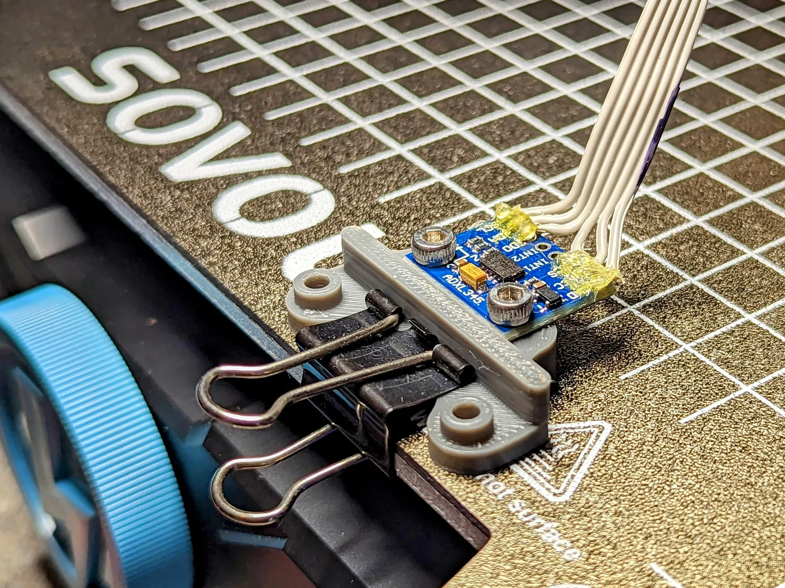 Đây là một giá đỡ ADXL345 duy nhất có thể được gắn chắc chắn và gọn gàng vào động cơ bước extruder để đo tần số cộng hưởng X của bạn hoặc vào khay trục Y bằng kẹp giấy để đo tần số cộng hưởng Y của bạn.