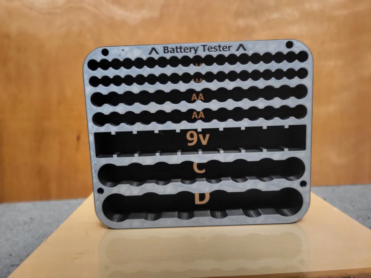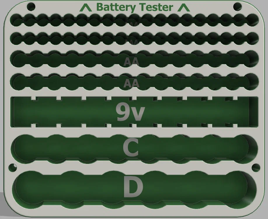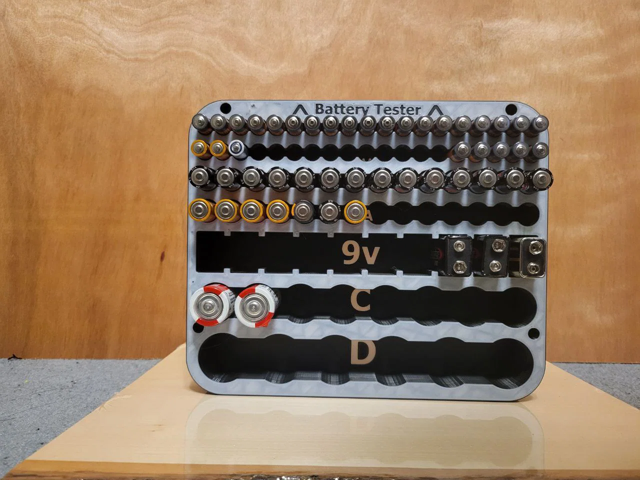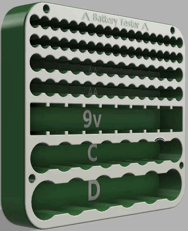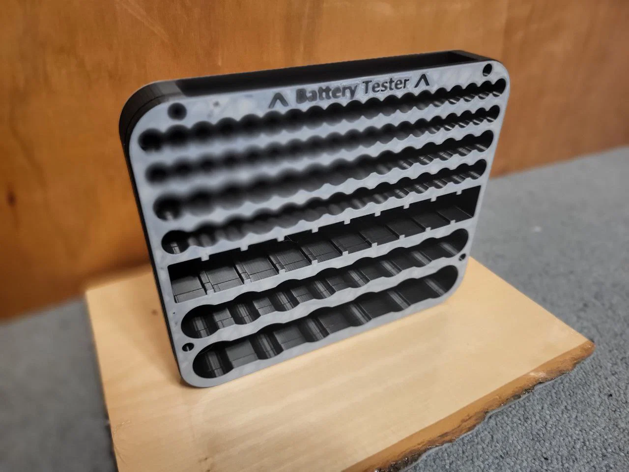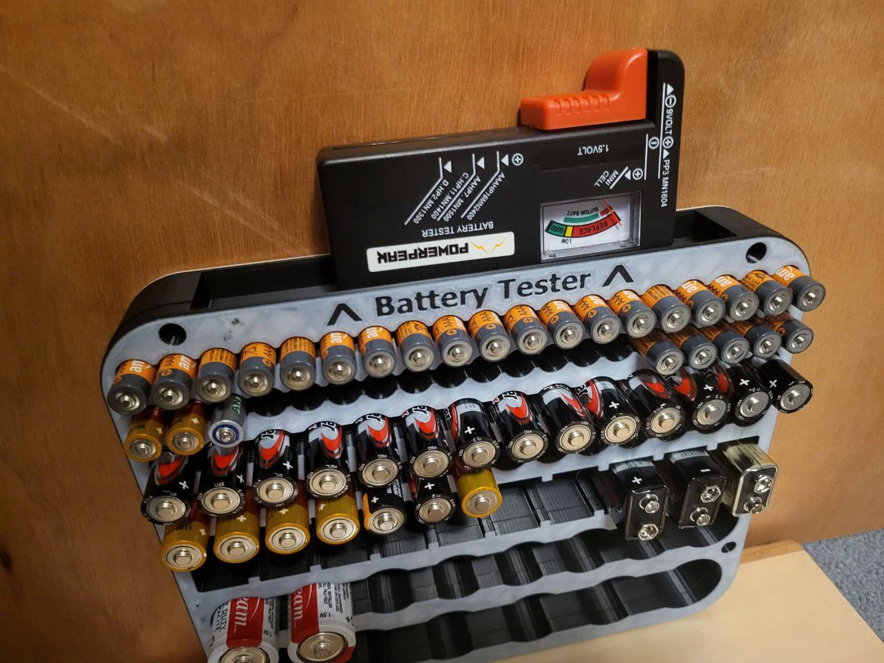 Hộp đựng pin có thể chứa 90 (hoặc 66) viên pin và máy kiểm tra pin (hoặc pin rời). Mô hình này được gắn tường, có hai kích thước và được thiết kế để in cứng cáp với nhiều loại pin khác nhau.
