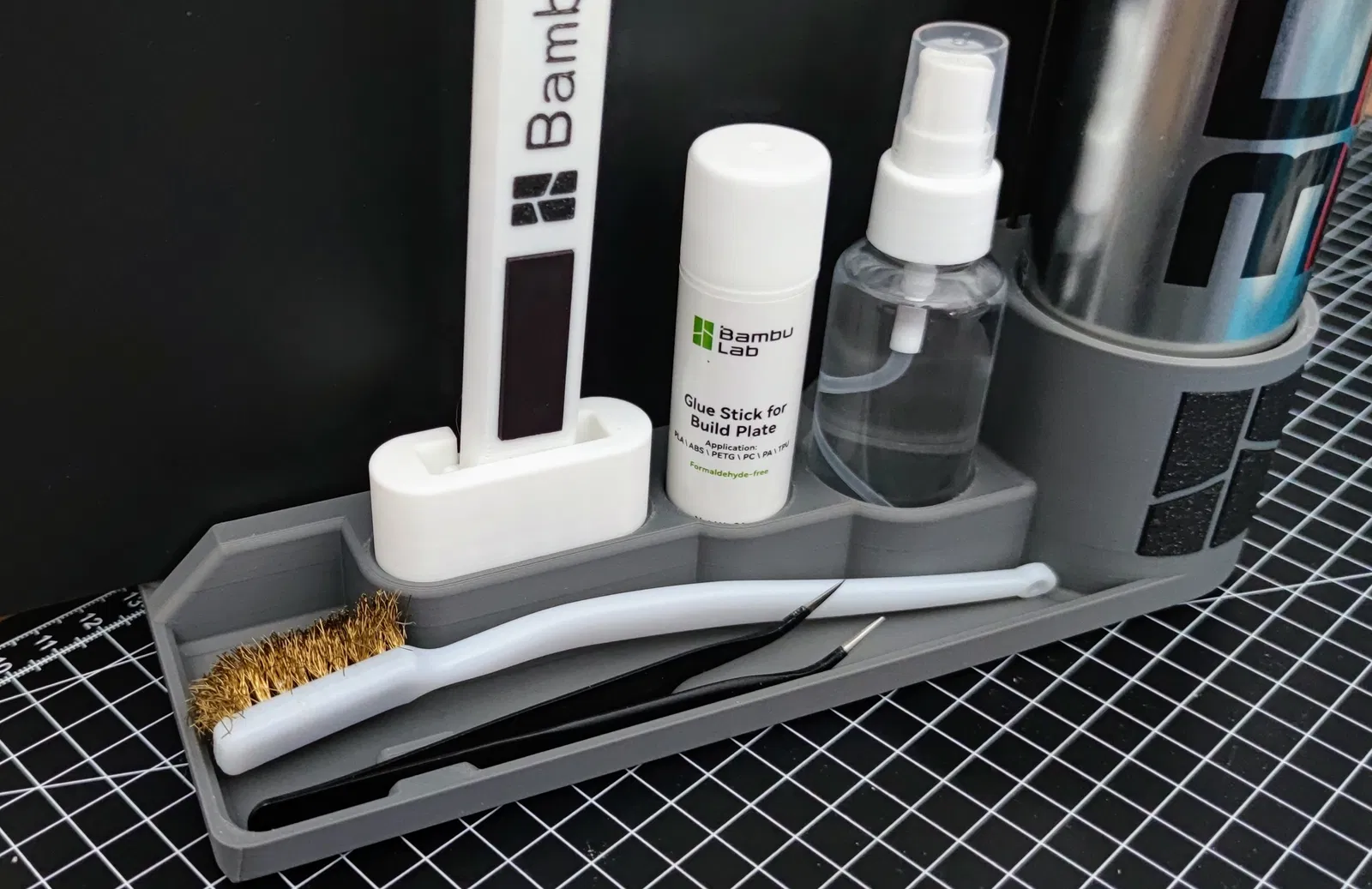 Bản Remix này của giá đỡ Tấm và Keo dán Bambu Lab X1C còn phù hợp với Bình xịt 3DLAC lớn hơn và Dụng cụ gạt gốc. Nó cũng có thể giữ Keo dán Bambu Lab và các bình xịt khác.