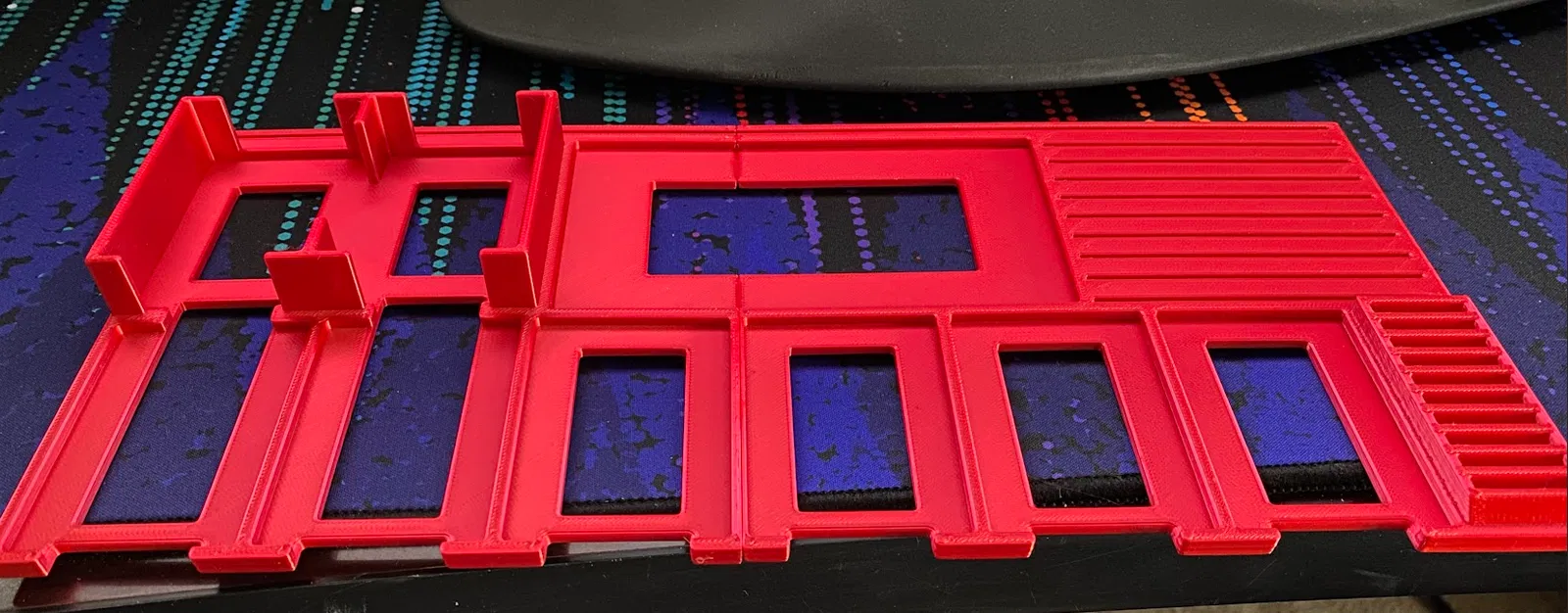 Chỉnh sửa từ bảng điều khiển người chơi LOTR Journeys in Middle Earth mà tôi đã tìm thấy. Được mô hình hóa lại từ đầu trong fusion360 để thêm các khe giữ thẻ người chơi, đủ các giá đỡ token, và hoạt động tốt với các loại bao bọc thẻ nhỏ. Tôi đã phải chia đôi nó bằng PrusaSlic3r để vừa với máy prusamk3 của tôi và dùng keo siêu dính, nhưng hoạt động rất tốt! Nếu bạn chia đôi nó, hãy thử thực hiện ở vị trí tương tự và dán các tab này để tăng cường độ bền: