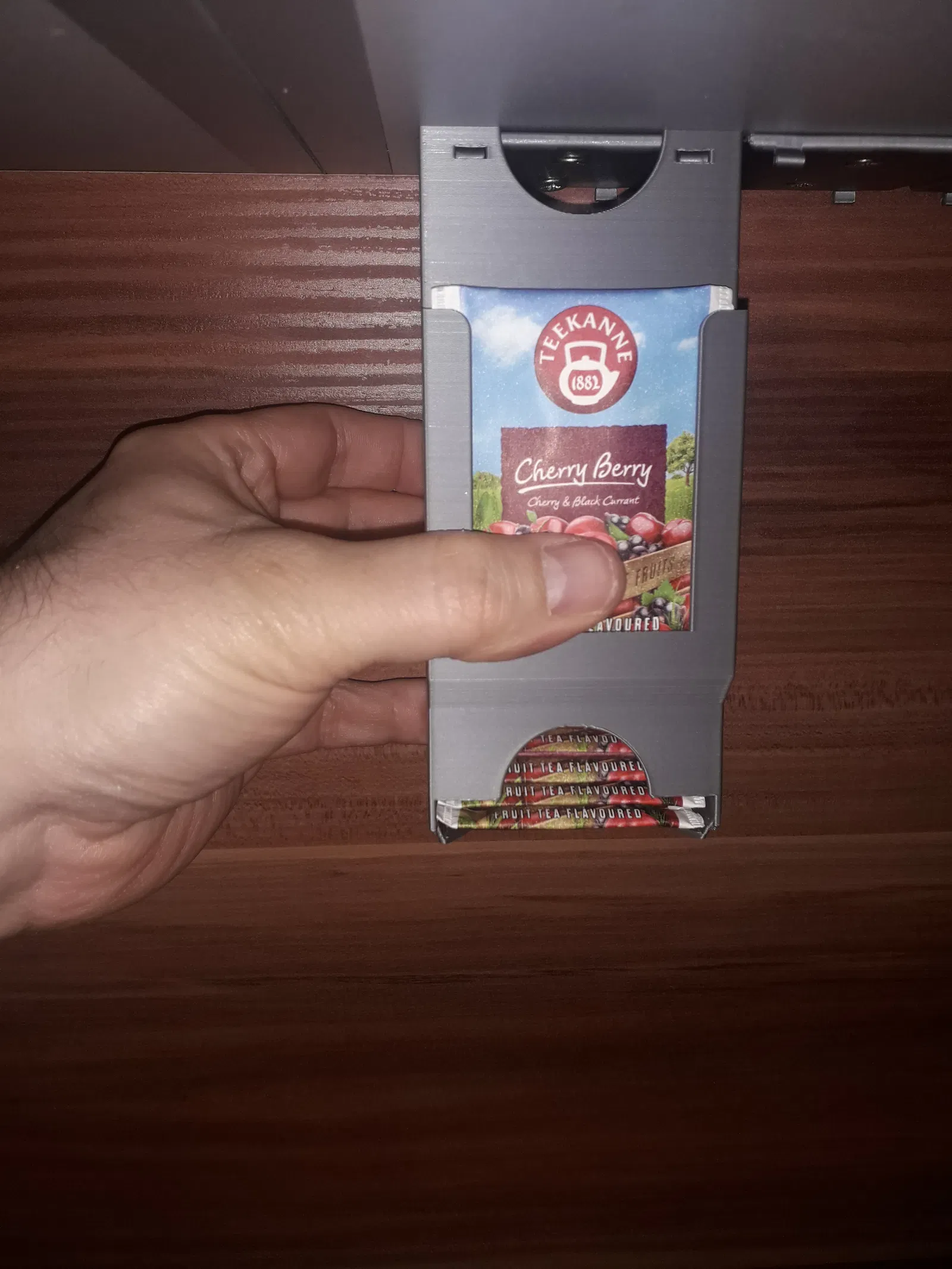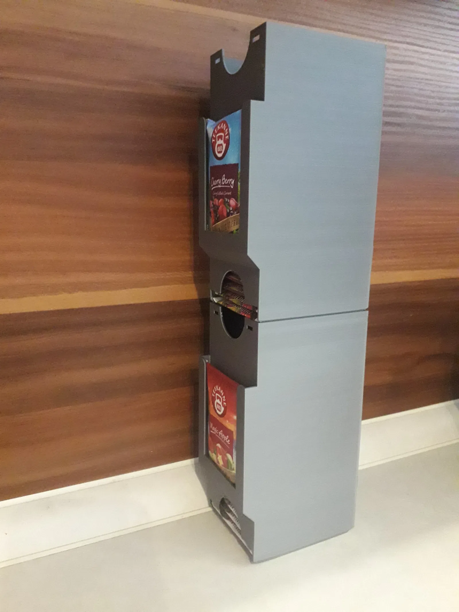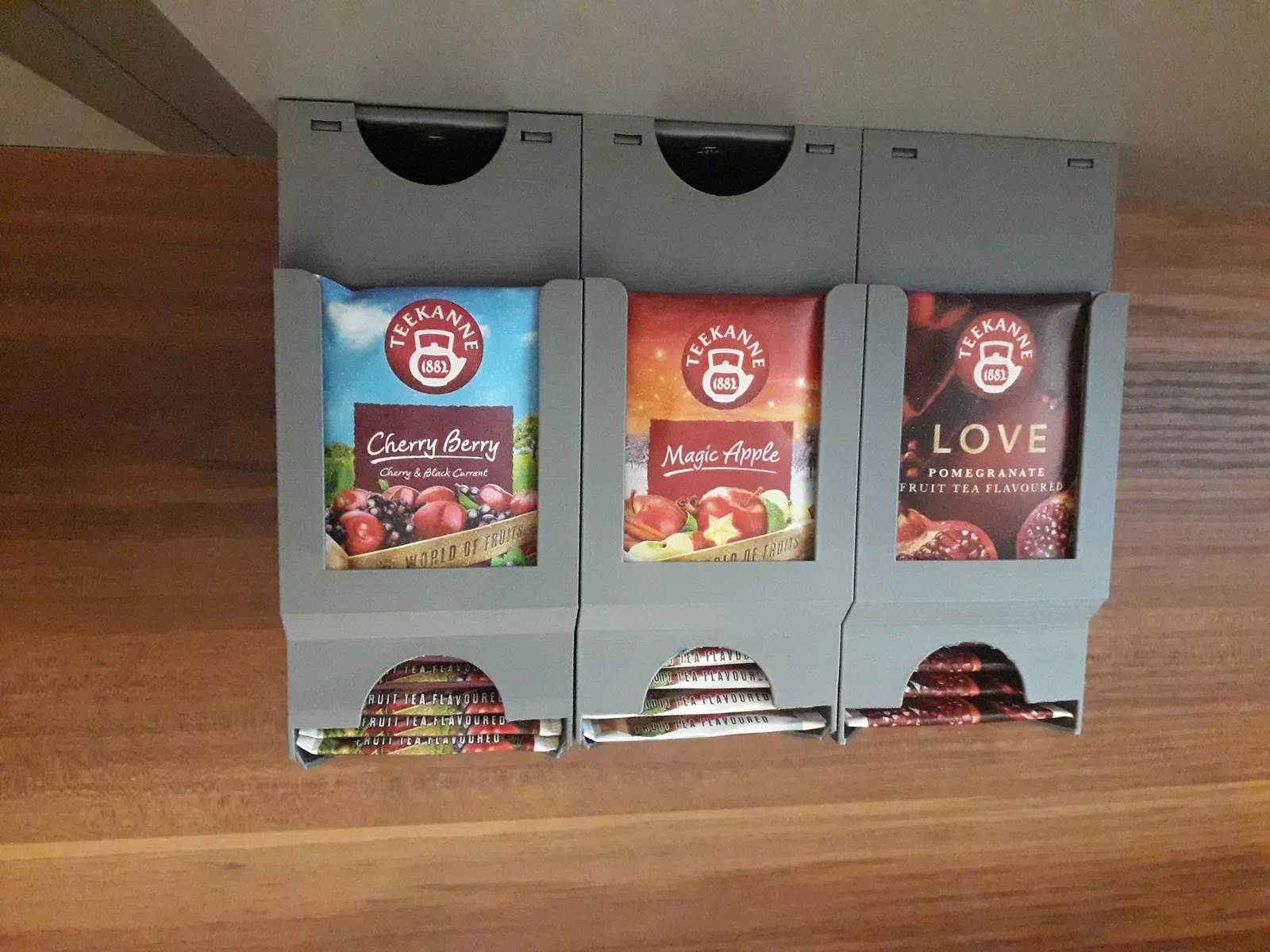 Hộp đựng trà có thể gắn trên mặt bàn hoặc xếp chồng lên nhau (phiên bản I.). Giữ cố định dưới kệ bằng 2 vít gỗ 4,0x16 mm, chiều dài tùy thuộc vào độ dày của kệ.