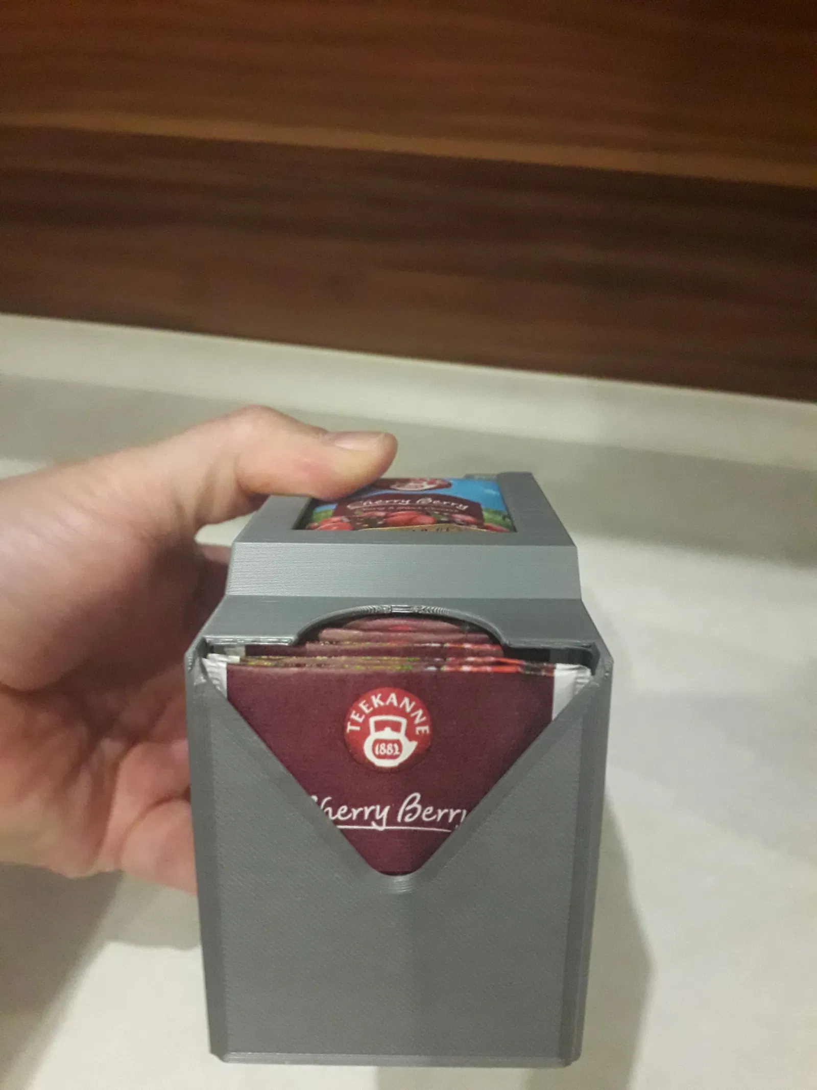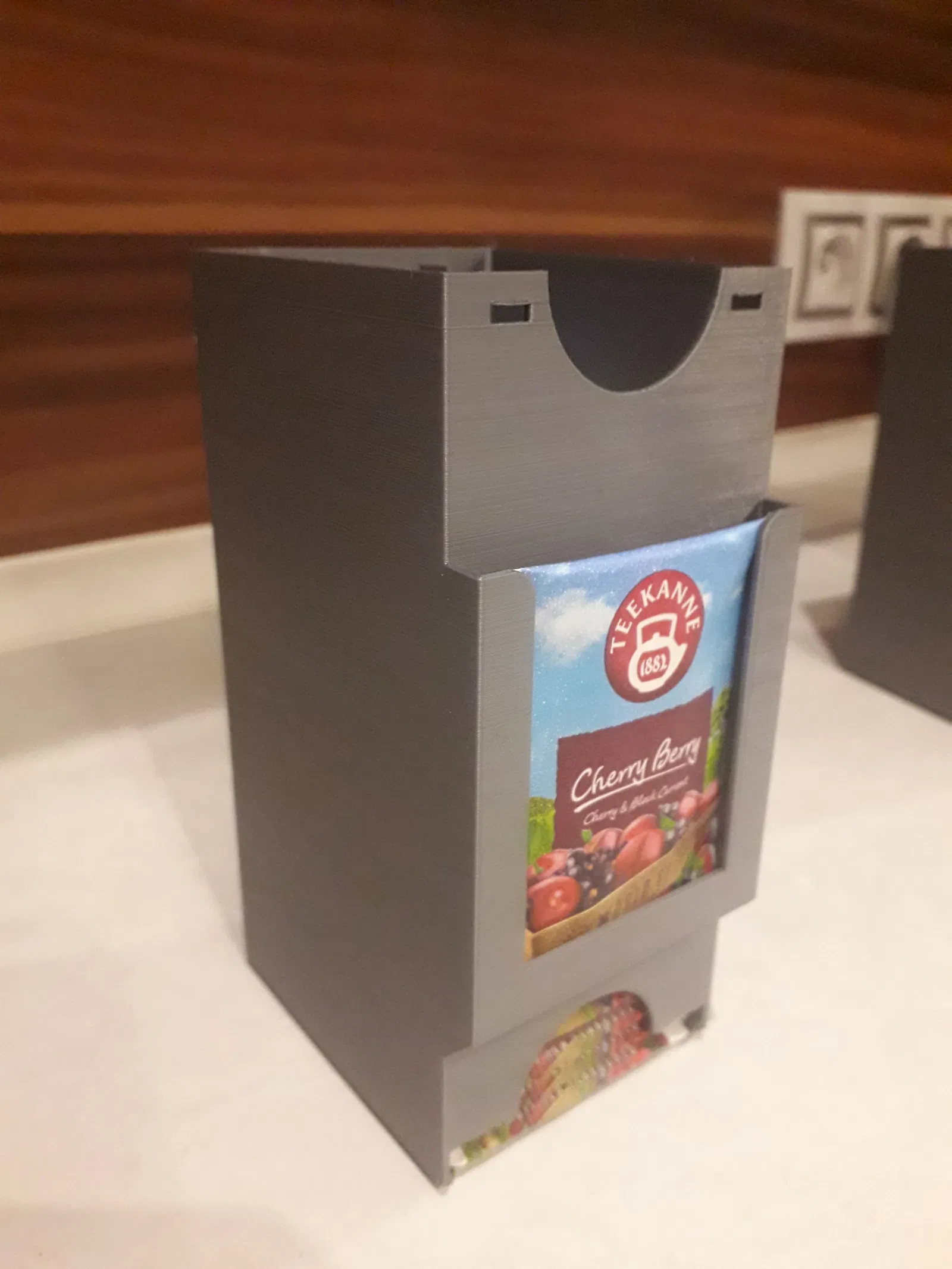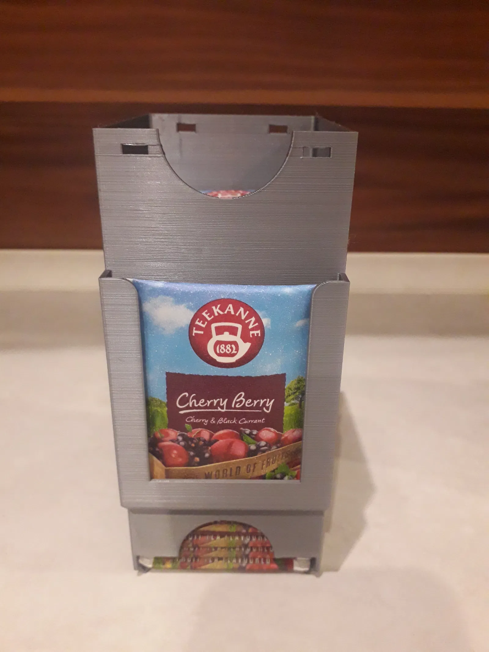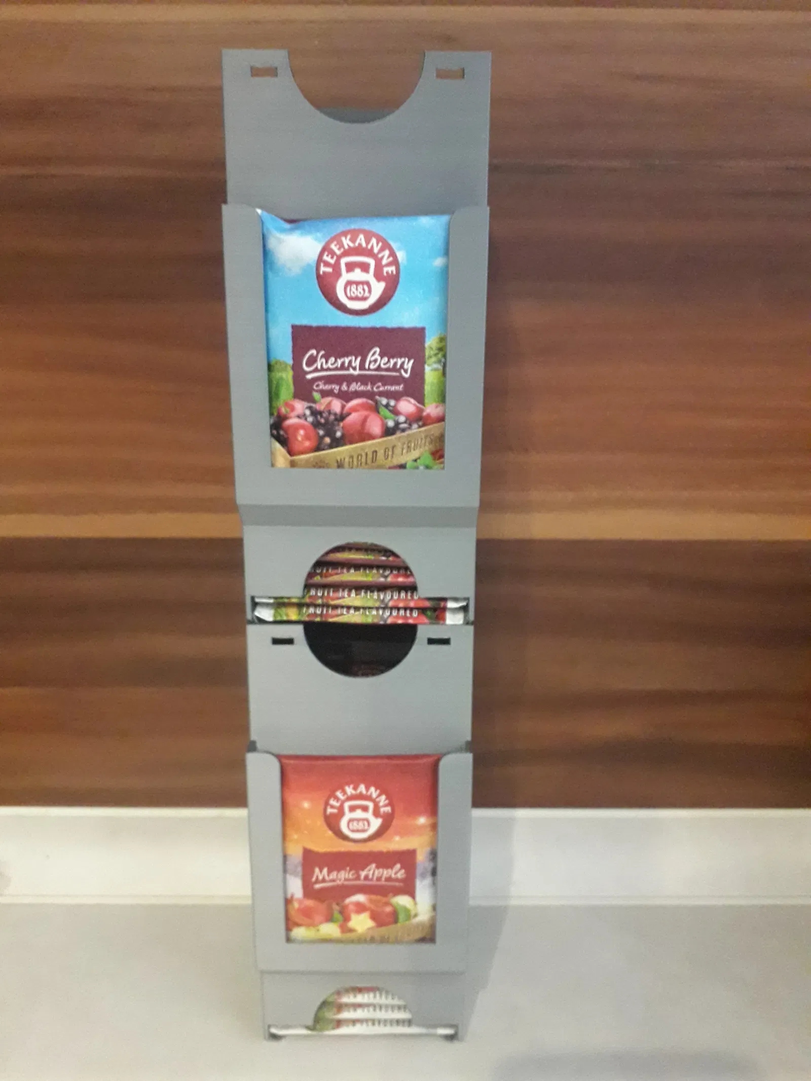 Hộp đựng trà có thể gắn trên mặt bàn hoặc xếp chồng lên nhau (phiên bản I.). Giữ cố định dưới kệ bằng 2 vít gỗ 4,0x16 mm, chiều dài tùy thuộc vào độ dày của kệ.