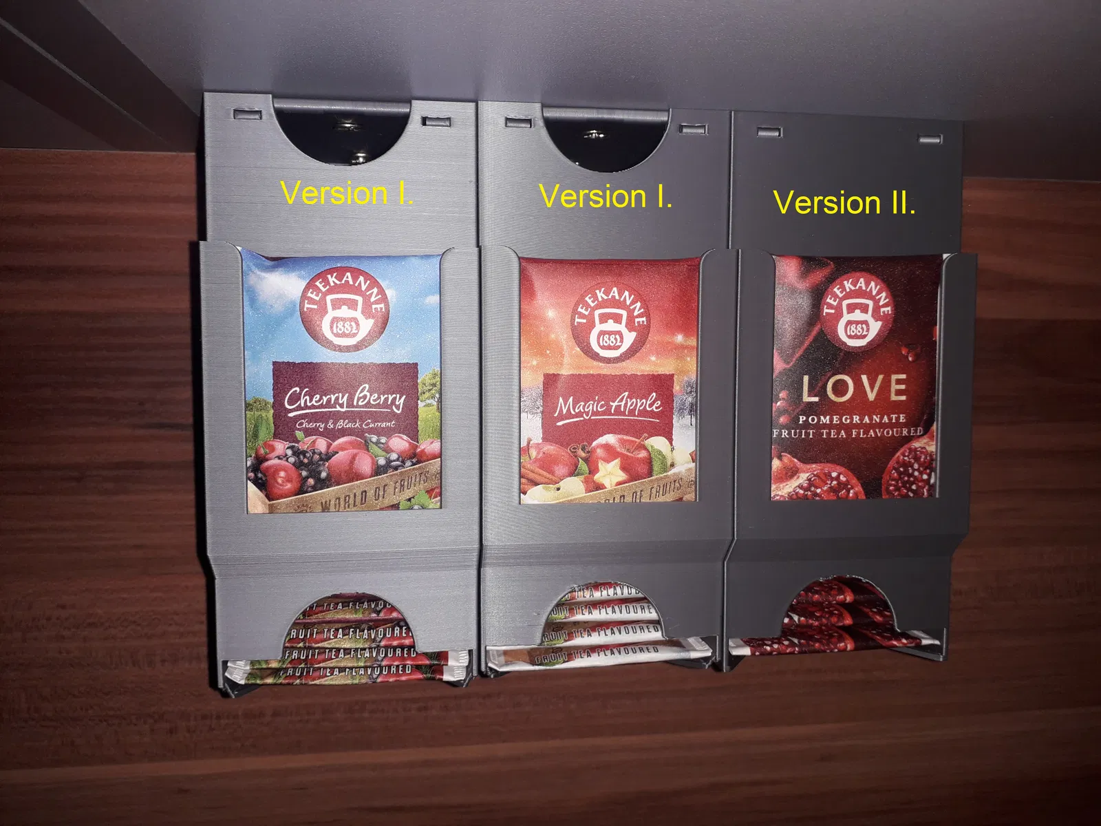Hộp đựng trà phiên bản I và II có thể gắn trên hoặc xếp chồng lên nhau. Hướng dẫn in chi tiết cho hộp và giá đỡ, bao gồm chất liệu PLA, cài đặt in và các lưu ý quan trọng. Hỗ trợ tác giả qua PayPal.