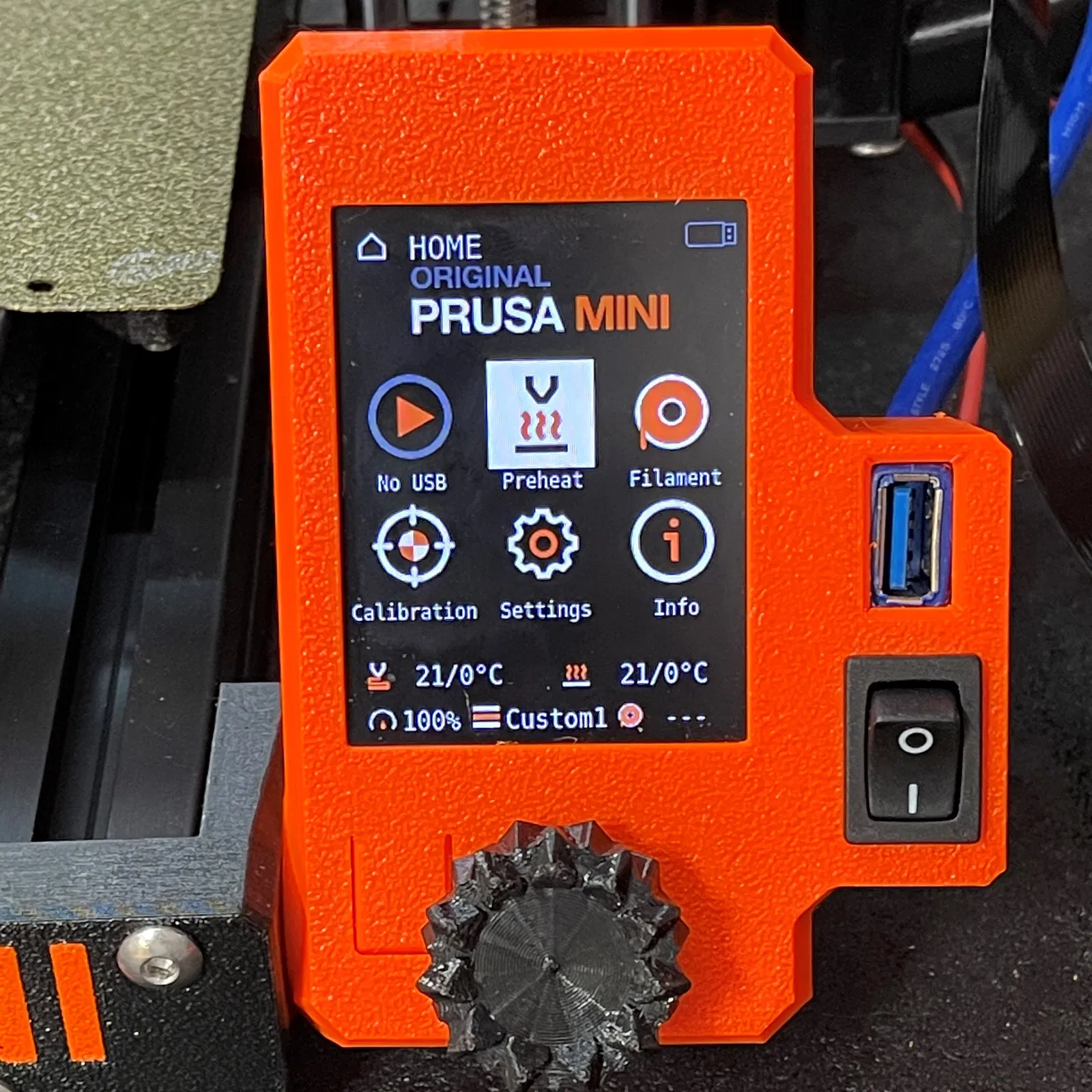 Cái này bổ sung một công tắc nguồn cho của tôi. Cả cổng USB và công tắc nguồn giờ đây đều có thể dễ dàng tiếp cận từ phía trước máy in. Nó hoàn toàn tương thích với . --- Cập nhật 29/07/2021: Đã thêm một nắp che cho lỗ hổng còn lại trong hộp điện tử. Tôi đã in thử mà không cần hỗ trợ và nó hoạt động tốt. --- File 3mf chứa vỏ máy, chốt giữ cáp USB ("stopper") và nắp che cho lỗ hổng trong hộp điện tử. Nó được thiết lập cho Prusament PETG. Không cần hỗ trợ, mặc dù bạn có thể thêm hỗ trợ cho phần cắt để lắp stopper. #### Lắp ráp Tháo LCD khỏi khung như trong Các bước 2 và 3 của hướng dẫn lắp ráp Mini+, theo thứ tự ngược lại. Tháo LCD ra khỏi giá đỡ. Lắp LCD vào vỏ mới này. Nếu bạn sử dụng , sẽ dễ dàng hơn nếu bạn lắp trước vít M3x20 trước khi lắp vỏ, và sử dụng 4 vít M3x12 để cố định LCD và vỏ sau. ##### Cổng USB Tất cả những gì bạn cần là một cáp USB 2.0/3.0 góc 90° với chiều dài khoảng 30 cm (1 ft). Loại tôi đã mua là https://www.amazon.com/gp/product/B08MKW47QD/.. Cắm đầu có góc vào cổng USB của Mini+, sau đó luồn đầu kia vào phần cắt phía trên của vỏ này từ phía sau. Luồn stopper vào từ bên cạnh để cố định cáp. Tôi đã dùng kìm để cẩn thận đẩy stopper vào cho đến khi cáp không còn di chuyển. ##### Công tắc nguồn Bạn sẽ cần khoảng 30 cm (1 ft) dây điện đôi 16 AWG và bốn đầu nối nhanh cái loại 16-14 gauge (màu xanh dương). Mở hộp điện tử của Mini+ và tháo nắp. Tháo cáp nguồn khỏi bo mạch Buddy và tháo công tắc bật-tắt ra khỏi hộp điện tử bằng cách làm theo các bước 7 đến 9 của hướng dẫn lắp ráp theo thứ tự ngược lại. Để rút công tắc nguồn ra, hãy nhấn vào các lẫy an toàn ở hai bên công tắc. Rút cáp nguồn ra khỏi công tắc. Tuốt một vài mm ở một đầu của dây đôi và bấm hai đầu nối nhanh. Làm việc từ bên trong hộp điện tử, luồn đầu dây không có đầu nối trước qua lỗ từng giữ công tắc nguồn, sau đó qua nắp che lỗ (đảm bảo mặt phẳng hướng ra ngoài). Ấn nắp che lỗ vào vị trí. Kết nối lại dây với bo mạch Buddy (bước 9). Tuốt một vài mm ở các đầu còn lại của dây đôi và bấm hai đầu nối nhanh. Luồn dây qua phần cắt phía dưới của mô hình này và gắn dây mới vào công tắc bằng cách đẩy hai đầu nối nhanh vào các đầu cuối của công tắc. Ấn công tắc vào vị trí trong vỏ. Đóng hộp điện tử lại (các bước 20 và 21). ##### Lắp ráp cuối cùng Gắn lại LCD bằng vít M3x20 vào khung (bước 3). Nếu bạn thích những gì tôi đang làm… … hãy cân nhắc mua cho tôi một ly cà phê hoặc tham gia Câu lạc bộ của tôi.