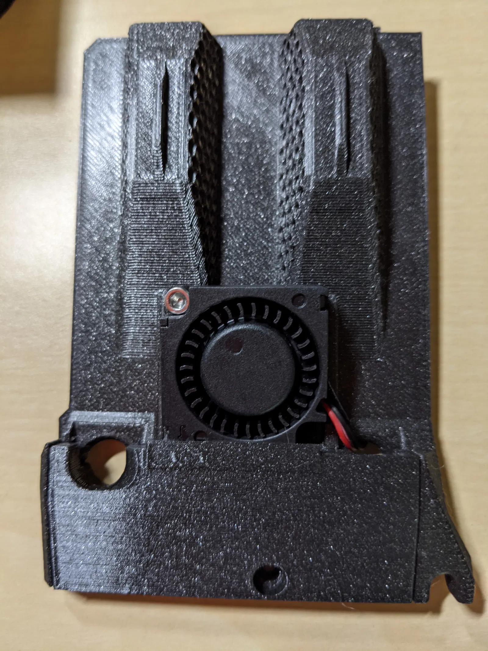 - Nắp trên - thêm một vài gân gia cố trên đỉnh các gờ lỗ thông gió Hex, cùng với một vài khe buộc dây zip để cố định cáp bàn nhiệt.