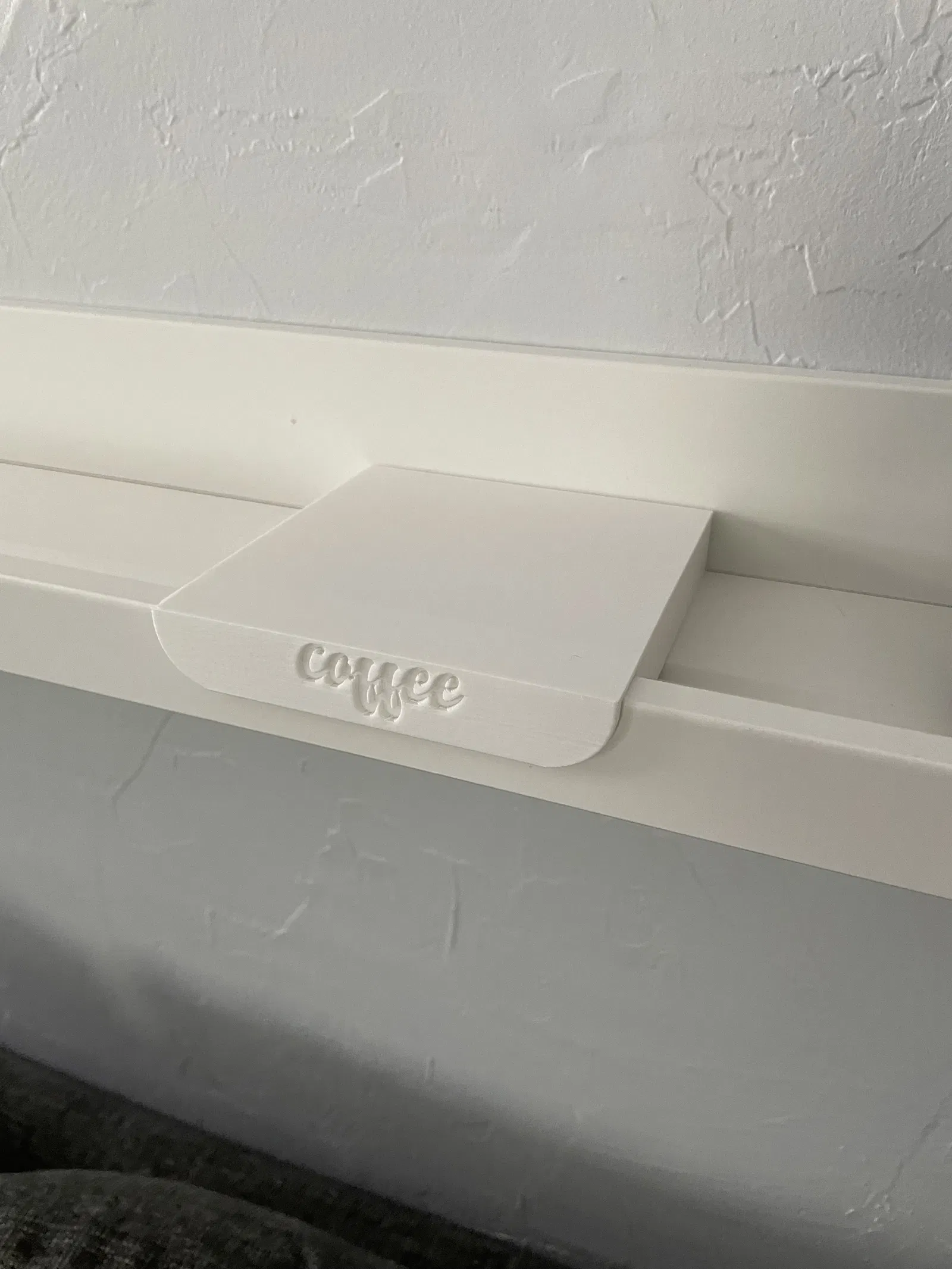 Một chiếc bệ phẳng được thiết kế để vừa vặn trên kệ tranh Ikea, phòng trường hợp cốc cà phê của bạn không vừa vặn thoải mái. Chiếc bệ này giúp đặt cốc cà phê ổn định trên mép kệ, giải quyết vấn đề cốc lớn không vừa.