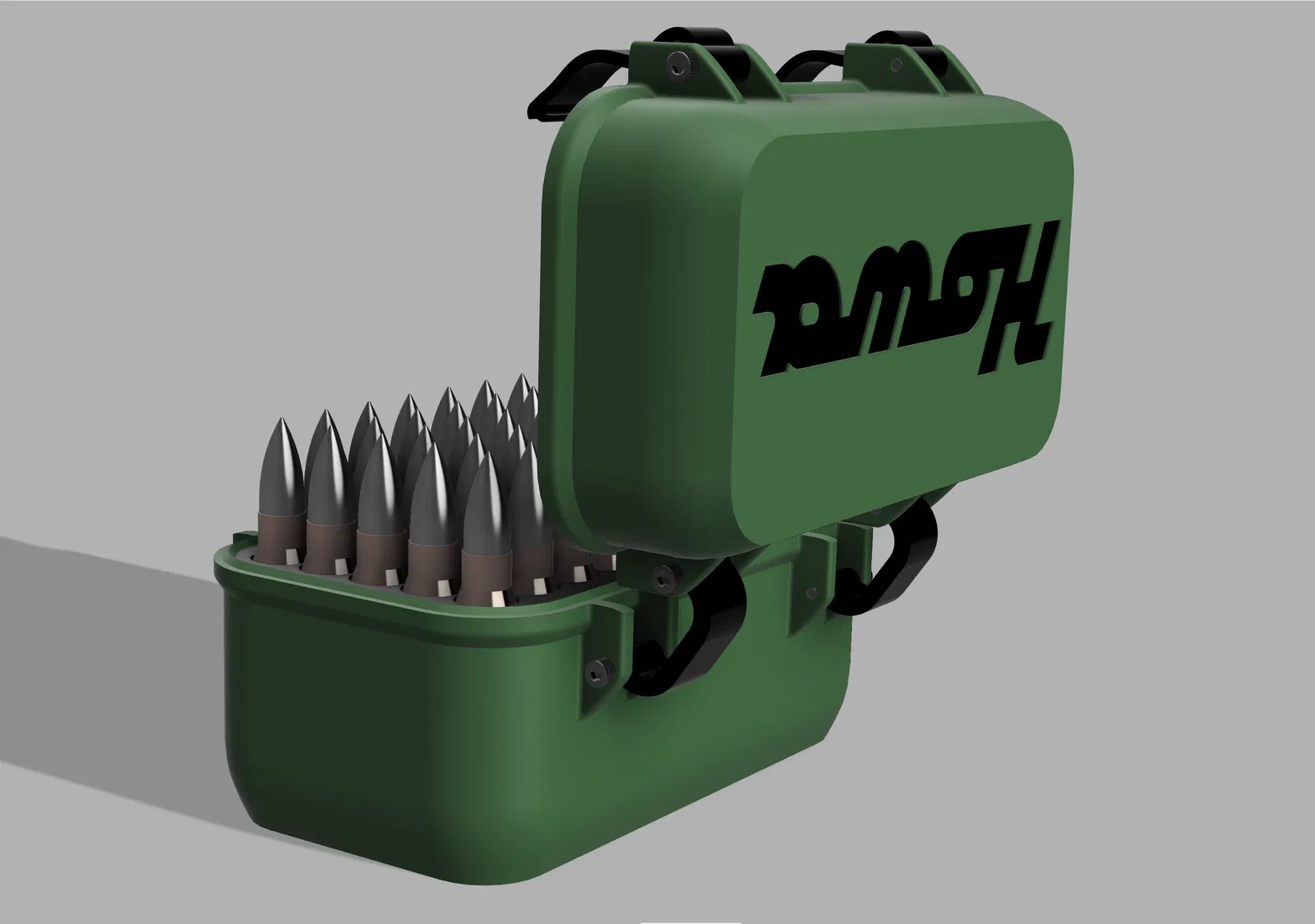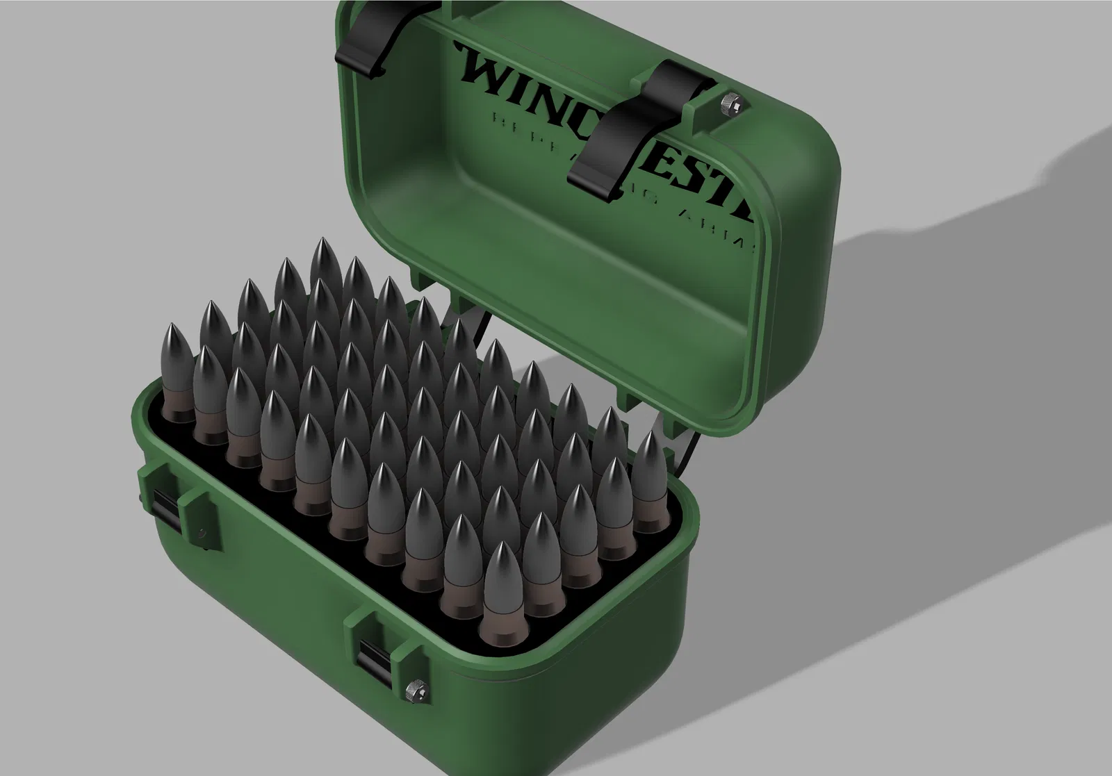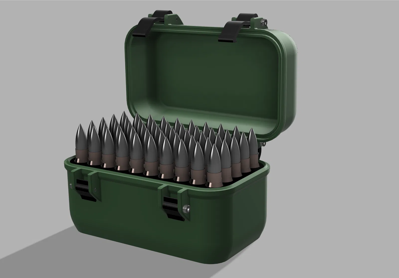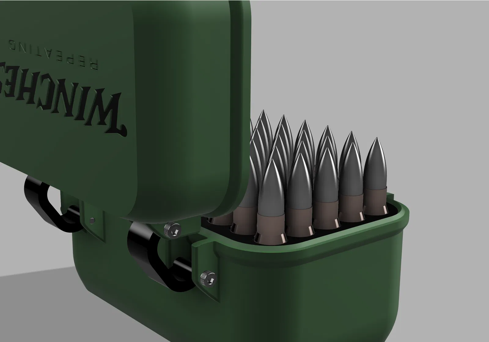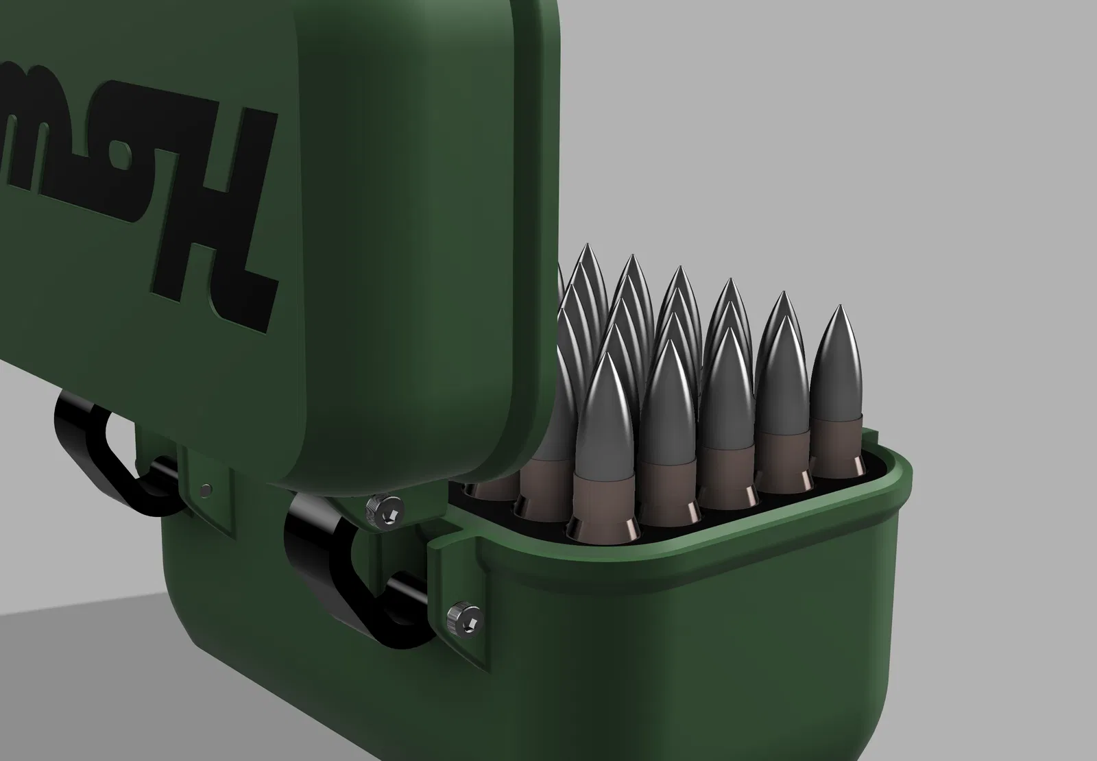 Hộp đựng đạn 30-06 được thiết kế theo yêu cầu với kích thước bên trong 86.10mm x 12.60mm, có nhiều tùy chọn nắp. Phiên bản này có nắp cao hơn và rộng hơn để phù hợp với nhiều loại đạn hơn. Cần 8 vít M3x20mm để lắp ráp.