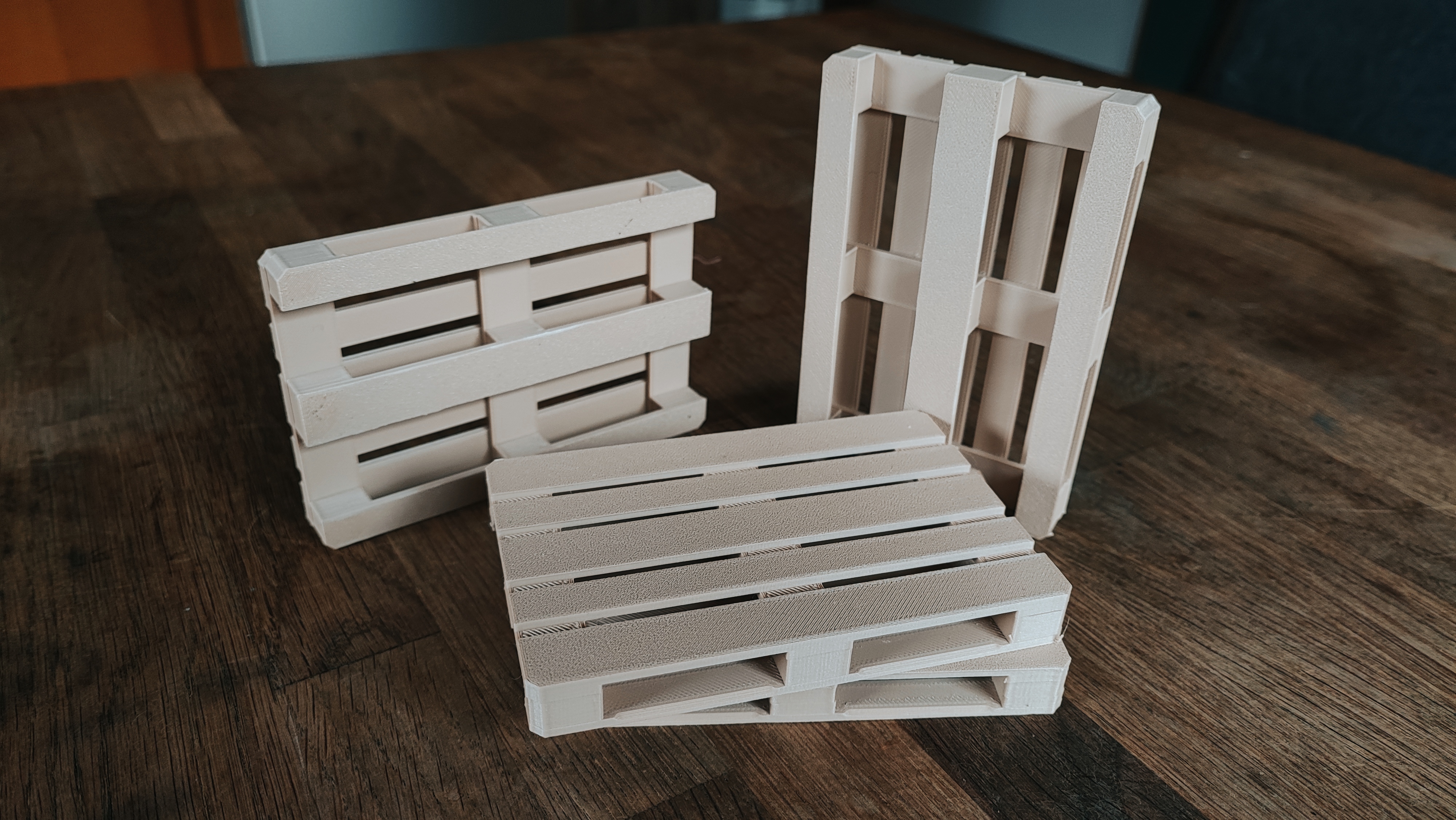 Mô hình pallet EUR tỷ lệ 1/10, hoàn hảo cho Xe nâng pallet tỷ lệ 1/10. Kích thước 120mm x 80mm x 14,4mm. Thiết kế in hai phần giúp dễ dàng lắp ráp mà không cần hỗ trợ. Lớp đáy hỗ trợ căn chỉnh và có thể cắt bỏ sau khi hoàn thiện.