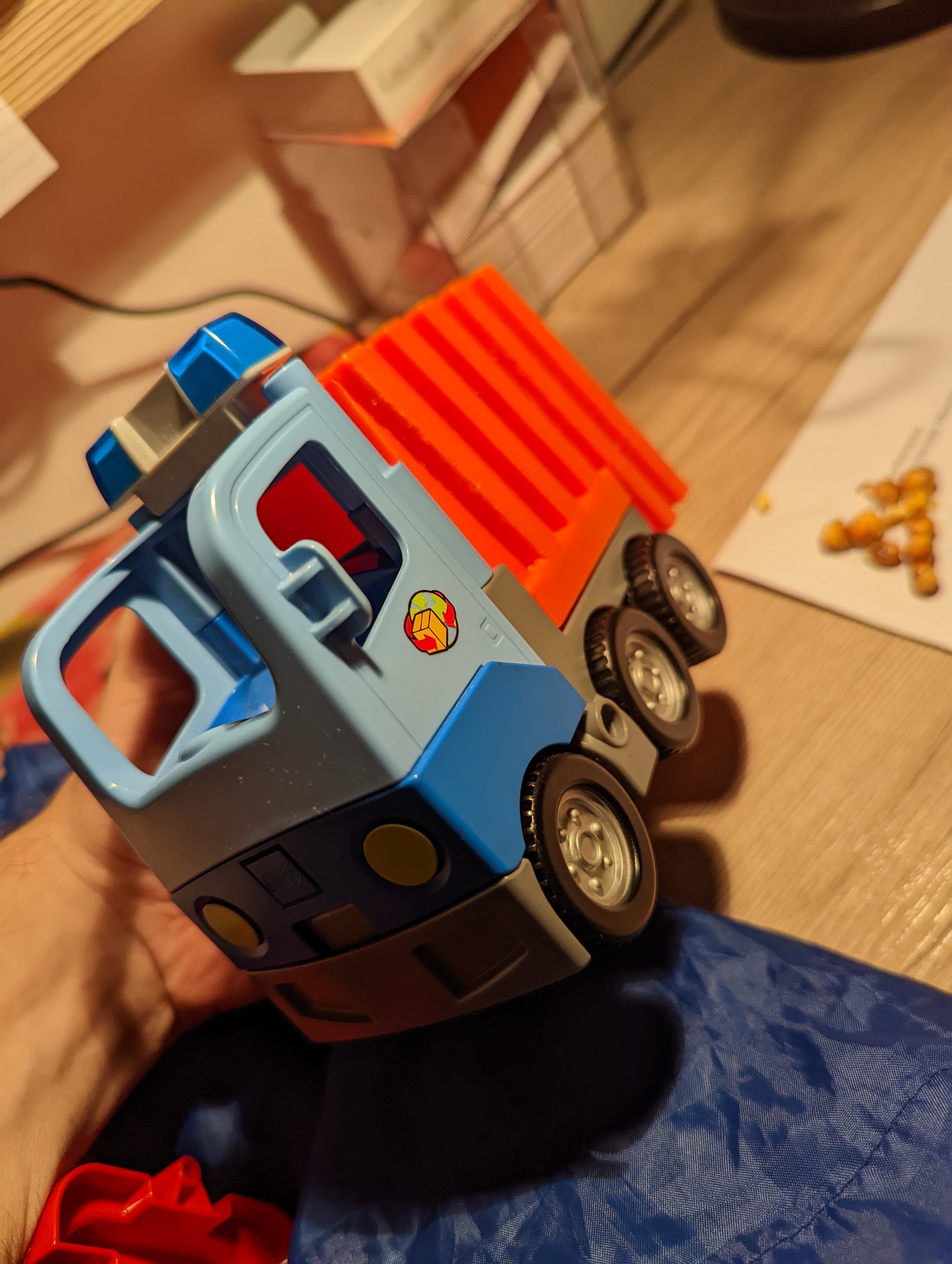 Vì bản gốc không có lỗ để nhét đồ vào (mặc dù bên trong rỗng), tôi đã thêm một cái. Cũng loại bỏ một số vật liệu ở phía sau đáy xe tải (để cải thiện khả năng tương thích và dễ sử dụng). Giờ thì nó cũng vừa với những chiếc xe tải nhỏ hơn, có bệ đỡ dài hơn một chút. Tôi đã sử dụng vật liệu hỗ trợ và bộ chặn hỗ trợ để xác định lại những khu vực thực sự cần hỗ trợ. Mô hình này được in bằng Prusa Orange PLA và geetech Wood Pla. Tôi cũng có một phiên bản có nắp đậy được. Nhưng phiên bản này không hoạt động tốt với những chiếc xe tải Duplo nhỏ hơn. https://www.f3d.vn/3d-model/64318-tieu-de-xe-cho-rac-duc-nap-dong-tom-tat-xin-chao-da-pho
