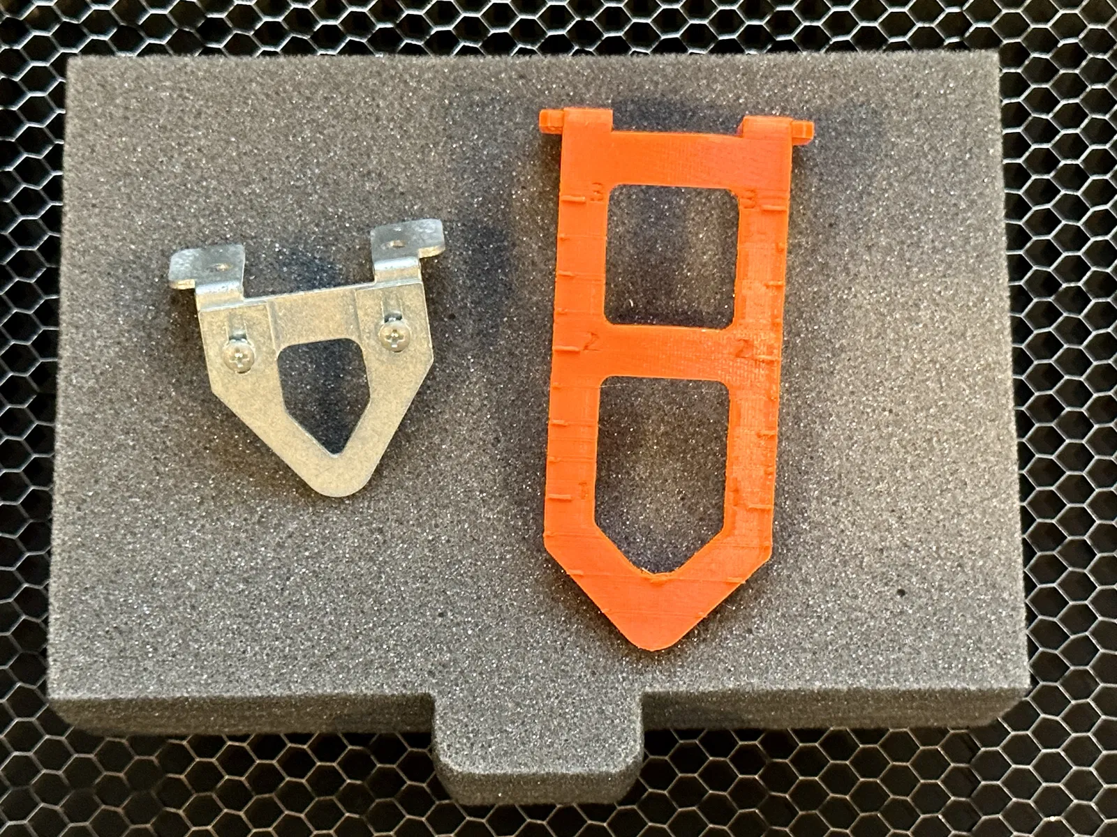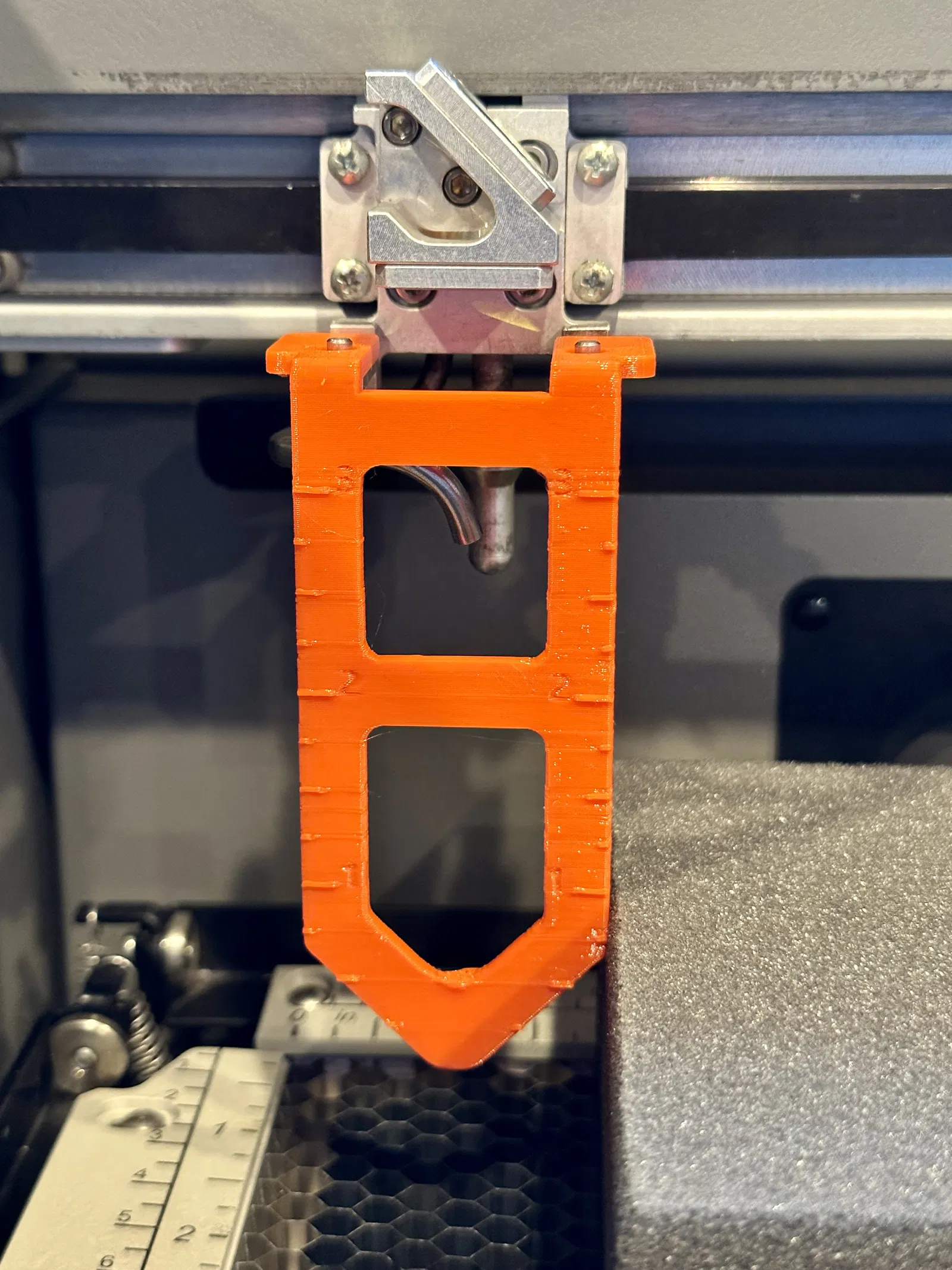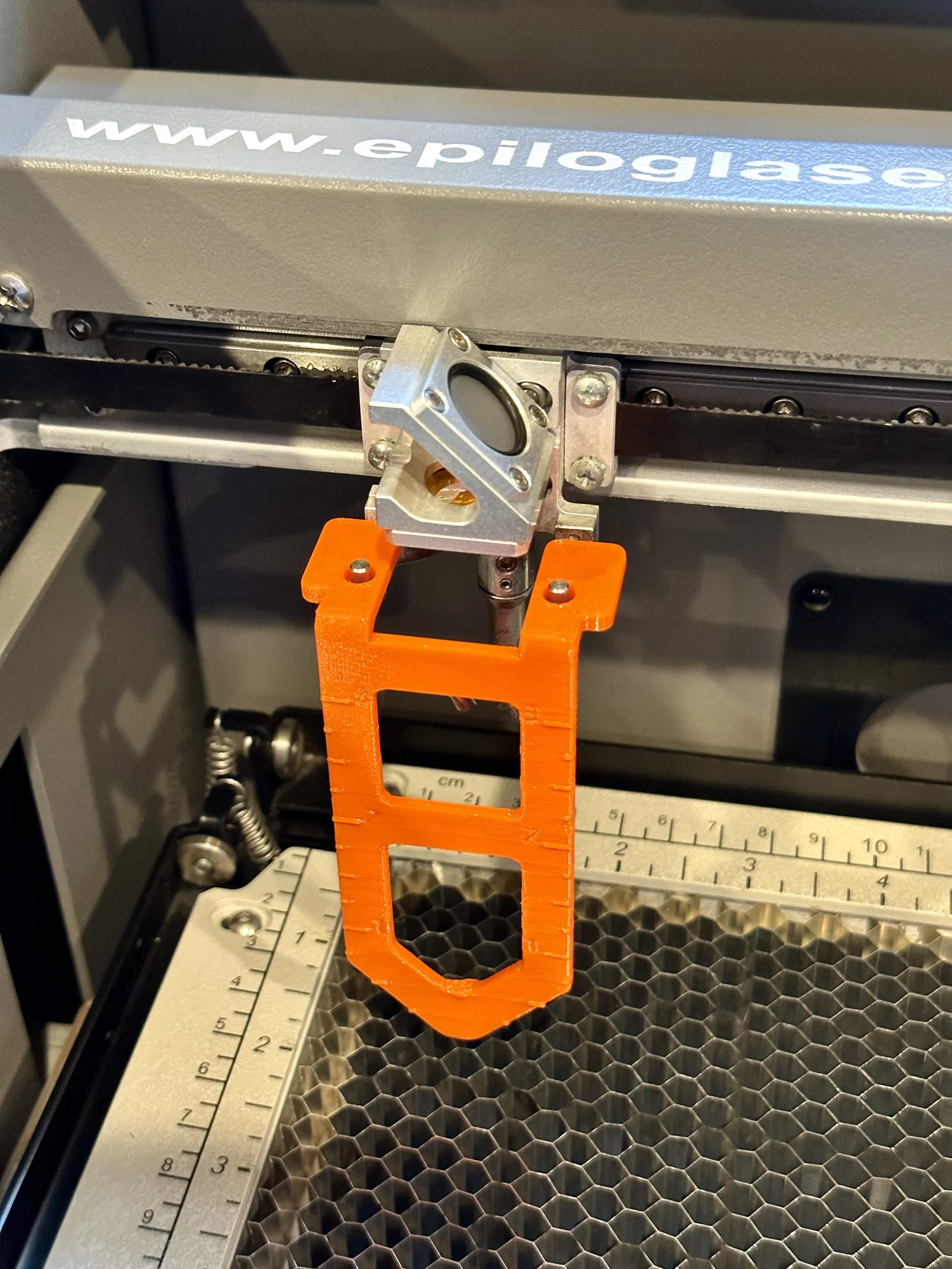 Tôi đã thiết kế thước đo lấy nét 4 inch này để mô phỏng thước đo lấy nét gốc của Epilog. Hai đai ốc lục giác 2-56 được ép vào thước đo để nó có thể dính vào các nam châm hiện có trong xe đẩy của Epilog.