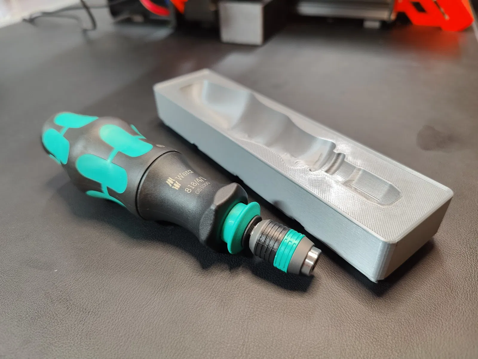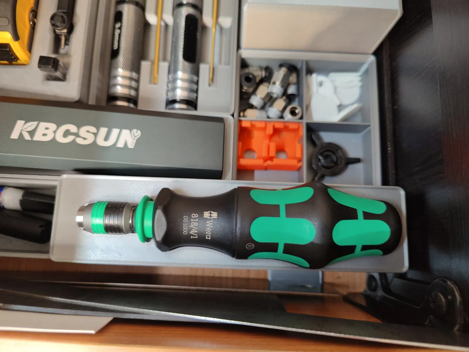 Quan trọng: Điều này phù hợp với Wera 818/4/1. Wera sản xuất nhiều mẫu có hình dạng tương tự nhưng có hình học hơi khác nhau. Vui lòng kiểm tra mẫu của tua vít của bạn trước khi in. Phù hợp nên vừa vặn, nhưng không quá chặt. Hơi hơn một nửa công cụ nhô lên trên nên vẫn rất dễ để cầm. Tôi đã in cái của tôi bằng PLA với 5% Lightning Infill với 2 lớp trên và 2 lớp dưới. Nó nhẹ nhưng đủ mạnh. ### Cập nhật: Có vẻ như có nhiều biến thể kích thước hơn từ công cụ này sang công cụ khác hơn tôi đã nghĩ ban đầu. Tôi đã tải lên một phiên bản mới của mẫu này với độ dung sai nhiều hơn. Phù hợp hơi lỏng hơn một chút, nhưng bây giờ nó nên phù hợp với hầu hết các công cụ. Nếu bạn đang tìm kiếm một giá đỡ cho Wera Torque Screwdriver, aonomus có một cái ở liên kết dưới đây: <