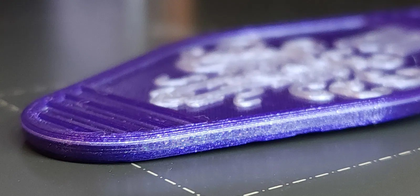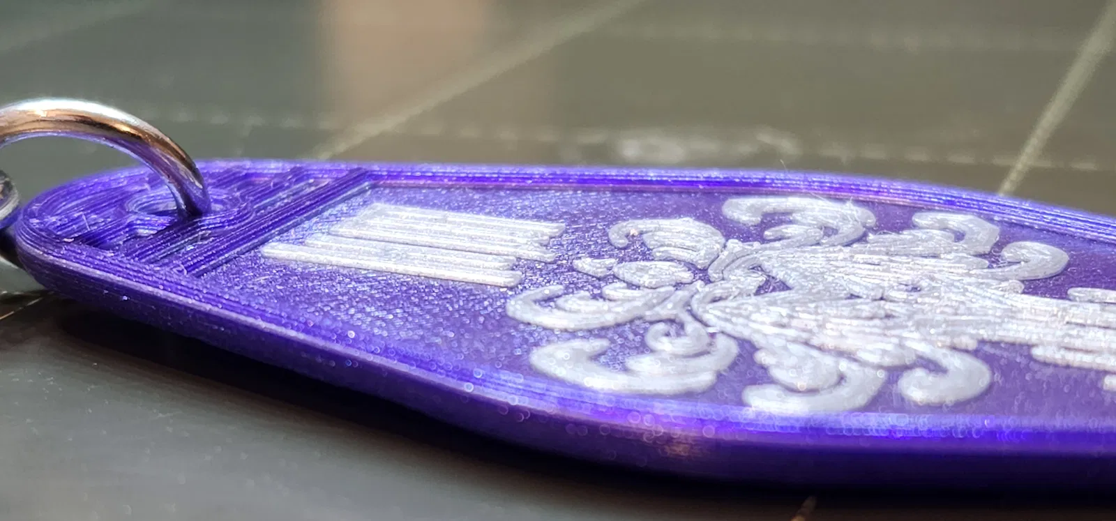 Tôi đã sử dụng Galaxy Purple và Galaxy Silver PLA. Tôi đã thay đổi hai màu: Tím, sau đó là bạc cho 2 lớp, sau đó quay lại màu tím. Tôi muốn hai màu cho móc khóa, nhưng tôi không muốn hình ảnh nổi lên cao hơn các cạnh, vì vậy khi in bằng hai màu, tôi đã có một lớp bạc mỏng xuyên suốt mô hình (xem ảnh). Nó mỏng đến mức dễ dàng bỏ qua nếu bạn muốn làm theo cách này.