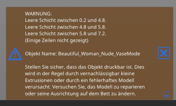 Tải lên lại bản STL của mô hình Phụ Nữ Xinh Đẹp Nude NSFW. Nguyên mẫu ban đầu không thể lát ở chế độ Vase với chiều cao 300mm và gặp lỗi trong Superslicer. Chia sẻ phiên bản STL để người dùng khác có thể thử nghiệm.