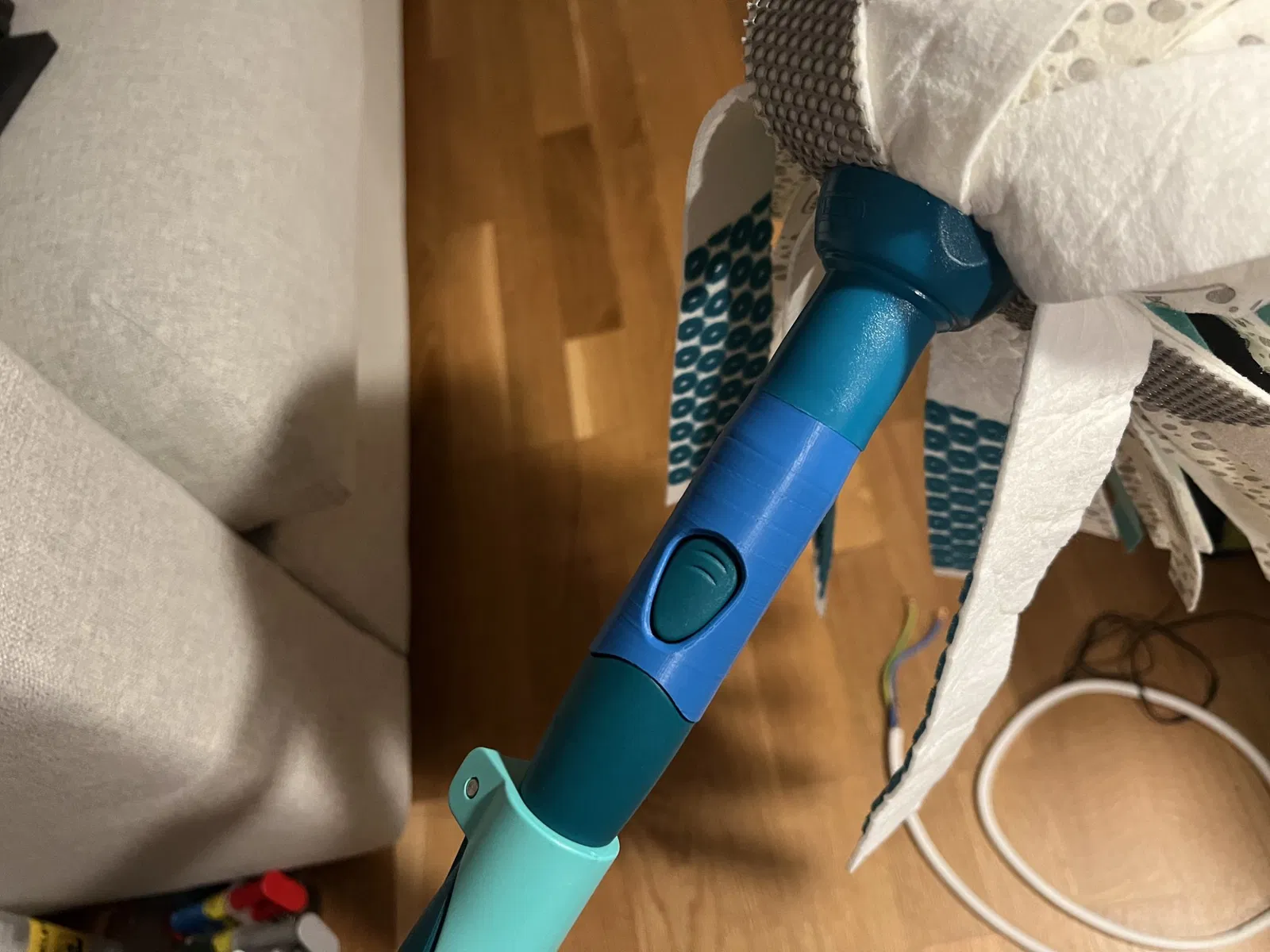 Nên khuyến nghị mạnh mẽ rằng bạn in đầu kết nối của cây lau (cái lớn hơn) rắn, tức là 100% độ đầy. Có rất nhiều lực tác động lên phần này khi chà sàn, và tôi đã gặp trường hợp 20% độ đầy bị gãy chỉ sau vài phút sử dụng.