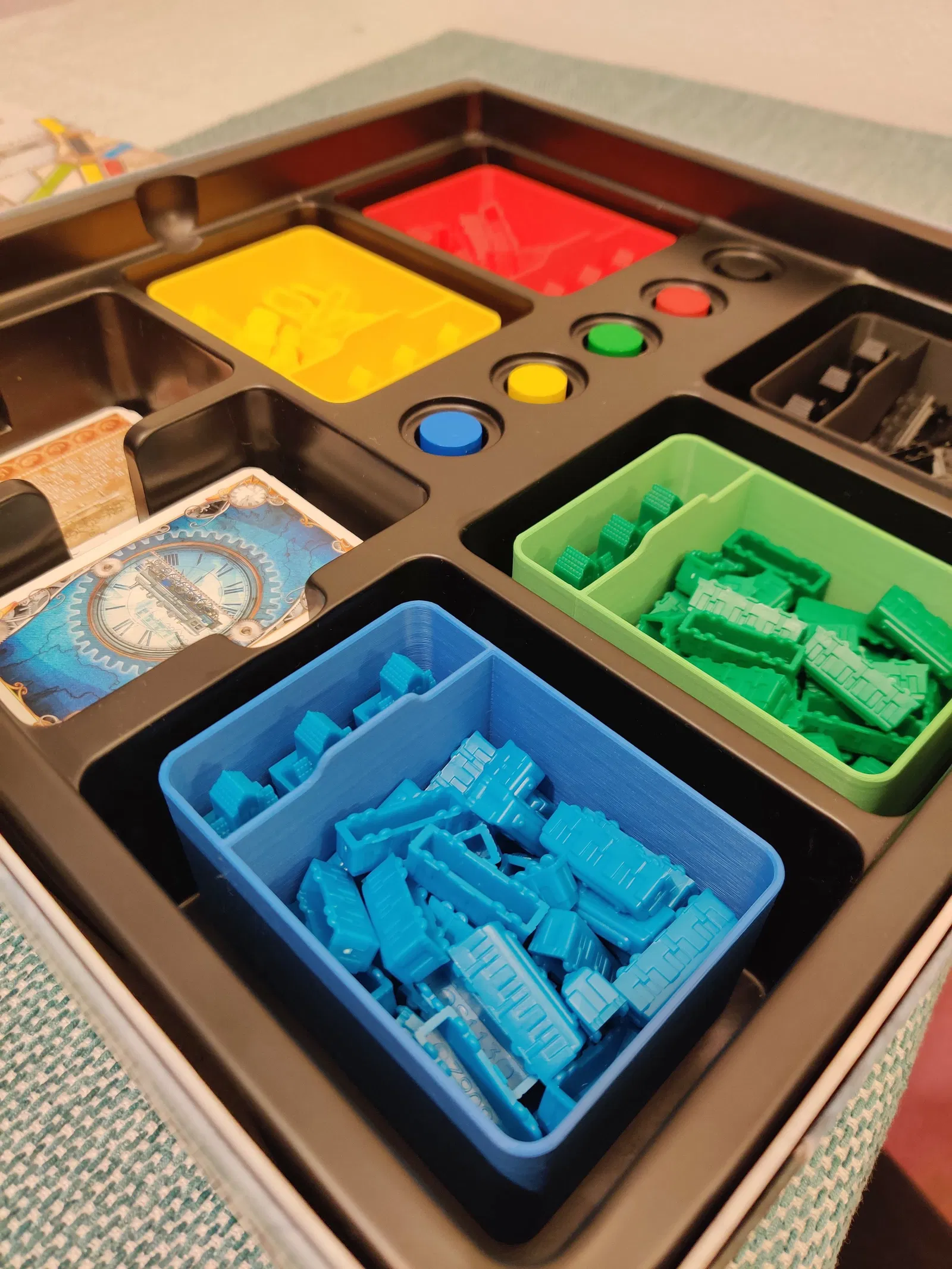 Lấy cảm hứng từ thiết kế này tại đây, nhưng được làm lại hoàn toàn để phù hợp với các đoàn tàu (carriages) và 3 nhà ga cho mỗi người chơi. Tôi đã in của mình bằng các màu PLA mờ tương ứng, nhưng bạn cũng có thể sử dụng một màu duy nhất.