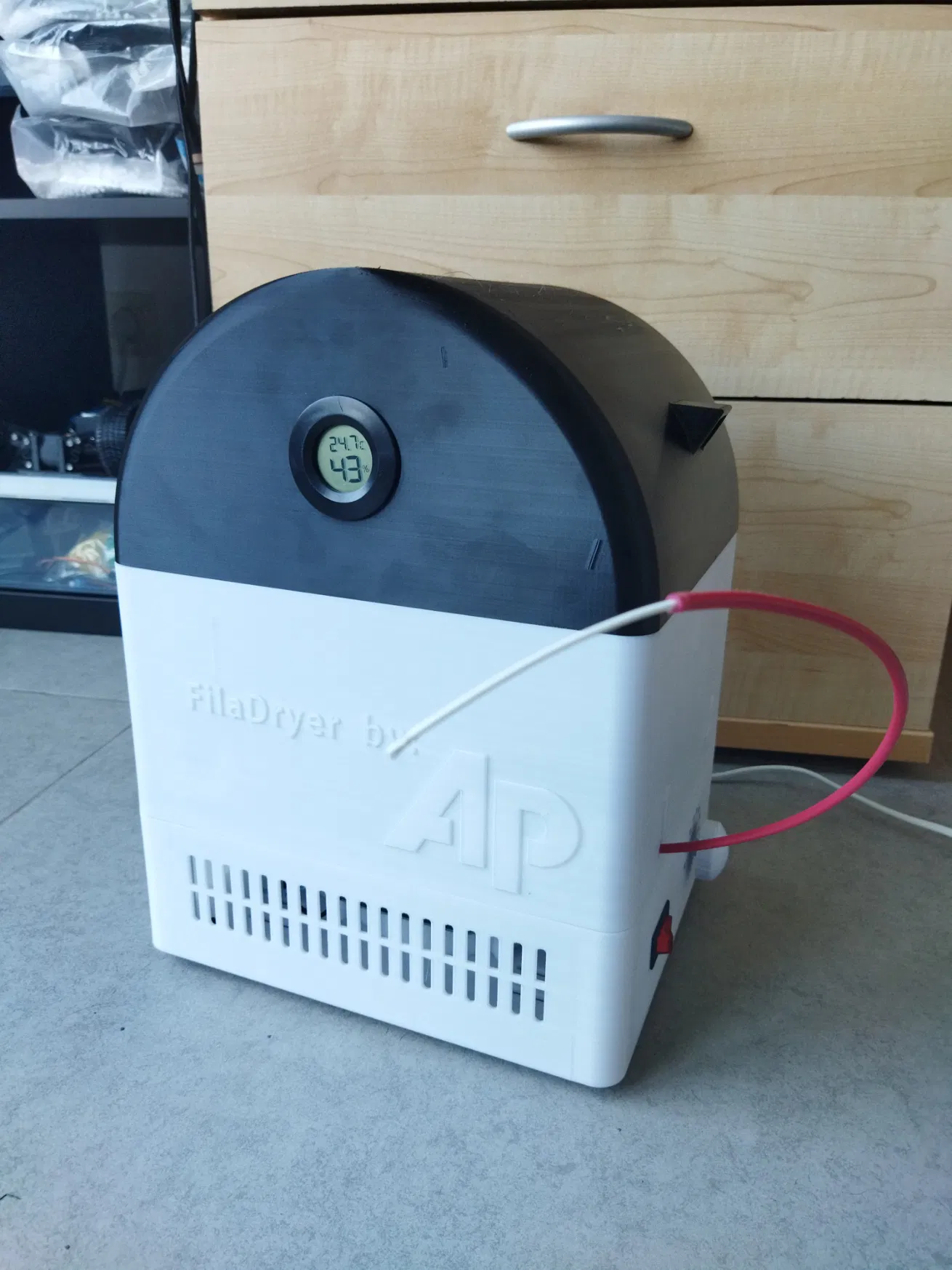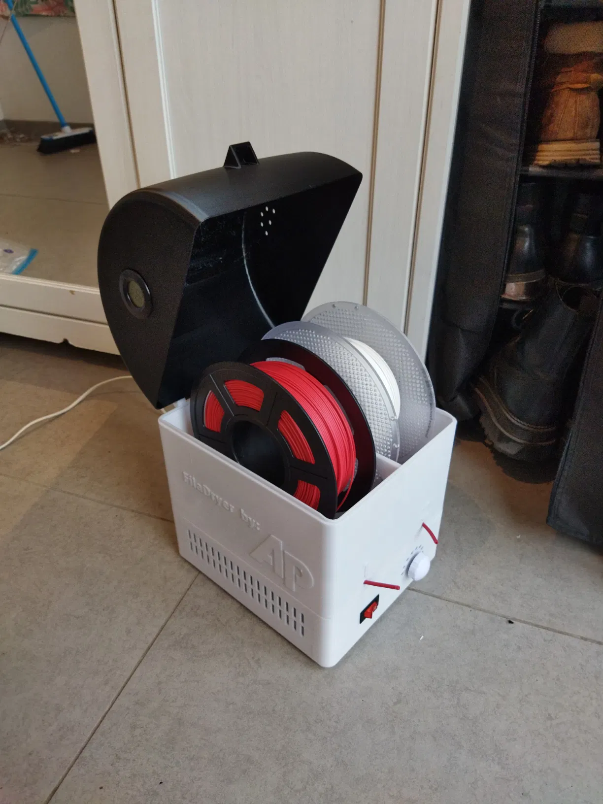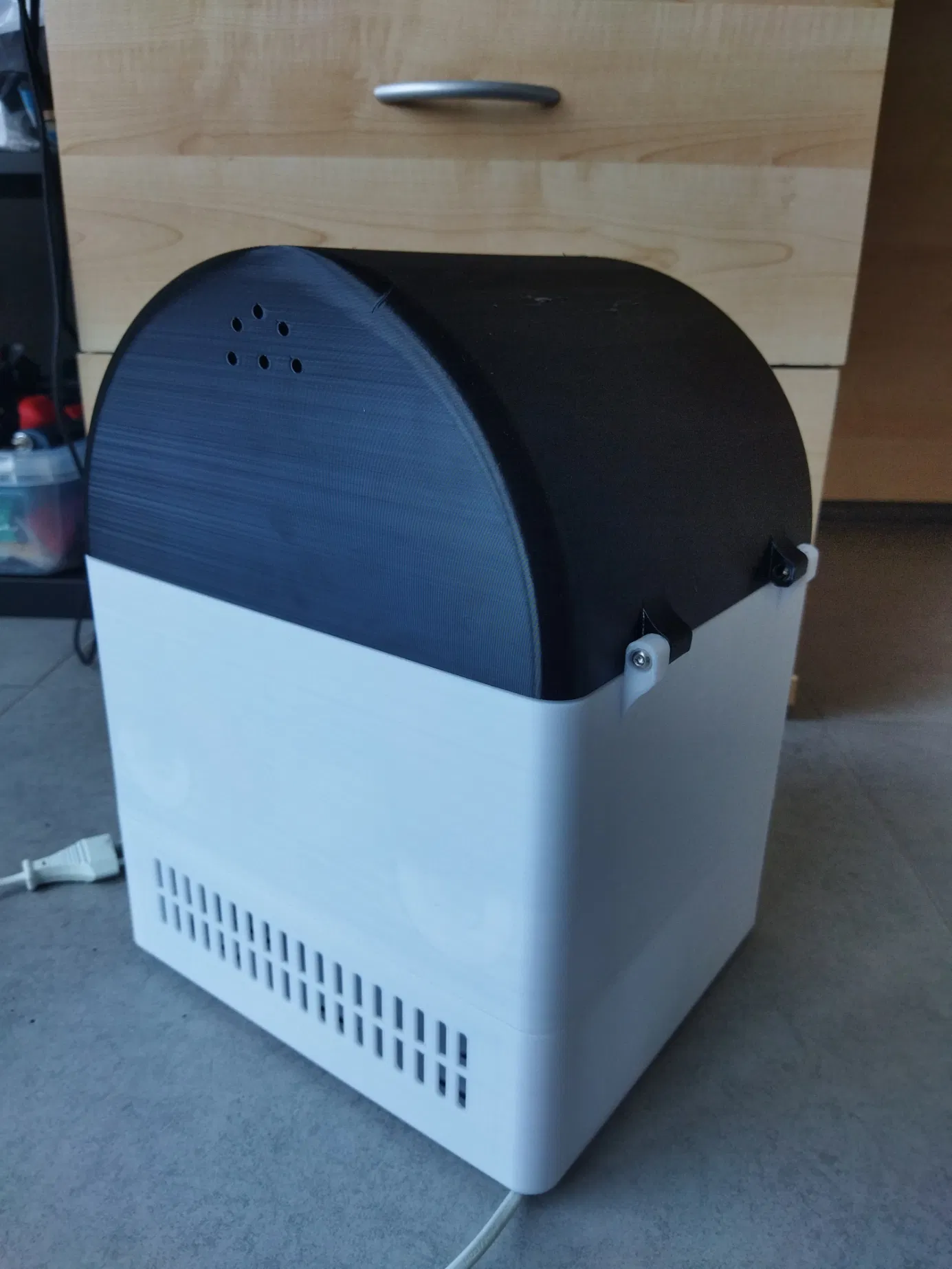 - Máy sấy thực phẩm MisterChef® Professional, 250W: 16/05/2023: Đã thêm Hướng dẫn Lắp ráp để hỗ trợ việc lắp ráp. Tôi đã sử dụng một máy sấy thực phẩm thông thường làm máy sấy filament (Muhler DHY-500T). Việc sấy filament khá bất tiện vì cuộn dây đặt nghiêng, khó đặt vào và lấy ra, và tôi chỉ có thể sấy một cuộn tại một thời điểm, không tiết kiệm năng lượng. Vì vậy, tôi đã lấy các bộ phận điện tử ra khỏi máy sấy và thiết kế một chiếc hộp mới hoàn toàn. Đây là một máy sấy thực phẩm hoạt động hoàn chỉnh với 2 cuộn dây và động cơ 250W (trong trường hợp của tôi là 250W, nhưng có các máy sấy thực phẩm công suất từ 150W đến 450W). Như mong đợi, hãy sử dụng PETG trở lên (ABS, ASA, v.v.) để in tất cả các bộ phận vì nhiệt độ nên trên 50 độ C. Đối với chân đế, bạn có thể in bằng PLA, nhưng tôi khuyên dùng TPU để có cảm giác tốt hơn. Tôi cũng đã tích hợp bộ phận khóa dây nguồn ở phía sau, vì vậy ngay cả khi bạn giật mạnh, nó cũng sẽ không làm hỏng bất cứ thứ gì. Nắp phía trên mở bằng hai bản lề ở phía sau, cần có vít M4 và bộ phận chèn đồng thau gia nhiệt, nhưng nếu bạn không có bộ phận chèn đồng thau, bạn có thể sử dụng bu lông M4 dài và đai ốc M4. Tôi đã bao gồm tệp STEP để phòng trường hợp các bộ phận điện tử của máy sấy thực phẩm của bạn không vừa với các lỗ này, bạn có thể dễ dàng sửa đổi để phù hợp với bộ phận điện tử của mình. Máy sấy filament này tương thích với cuộn dây filament có đường kính ngoài lên đến 21.5cm & dày 8.5cm! Vì vậy, nó sẽ tương thích với bất kỳ cuộn dây filament nào có sẵn. Ngoài ra còn có đủ không gian để đặt một số túi silica để giảm độ ẩm. Danh sách Vật tư: Bắt buộc: * Máy sấy thực phẩm (thường là loại thông thường) - Bạn có thể mua đã qua sử dụng với giá tối đa 5 đến 15 đô la