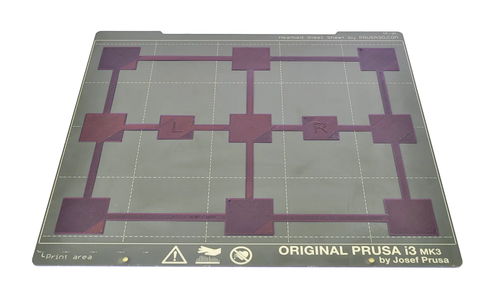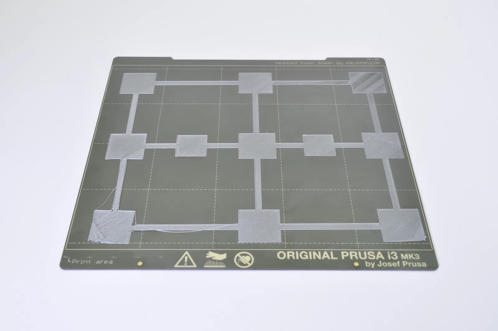 Một lưới 3 X 3 gồm các ô vuông cao 1 lớp để kiểm tra độ phẳng của bàn in. Dùng khi thực hiện Hiệu chỉnh độ phẳng bàn in như mô tả tại https://help.prusa3d.com/en/article/bed-level-correction_2267.