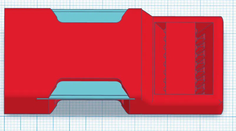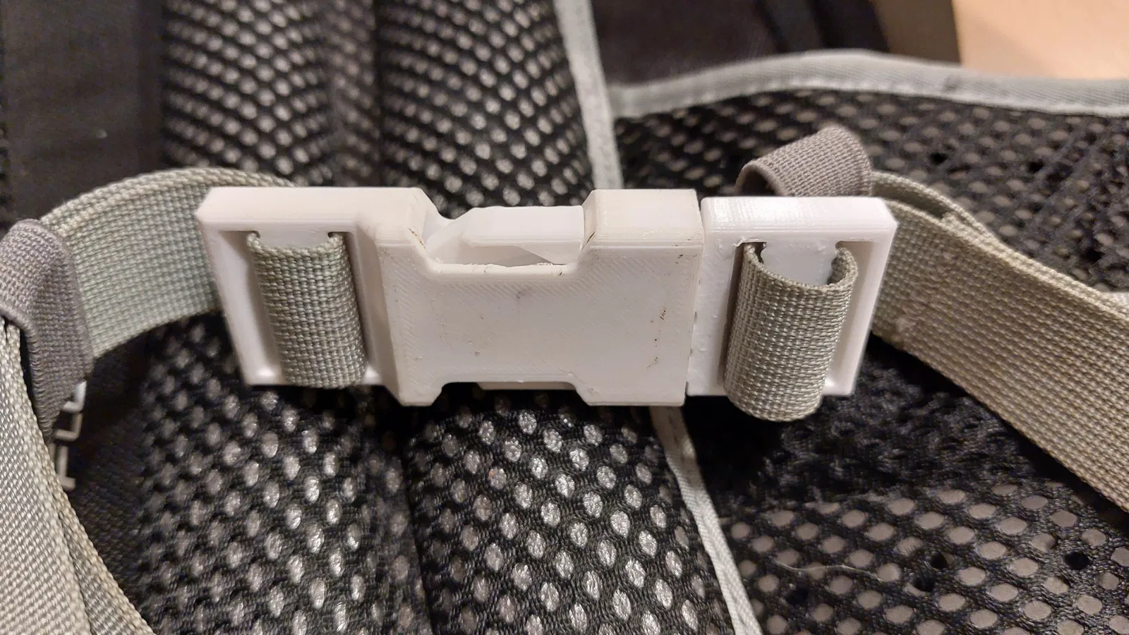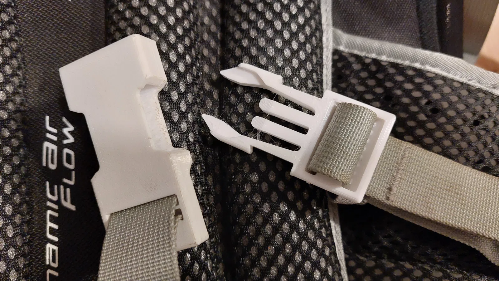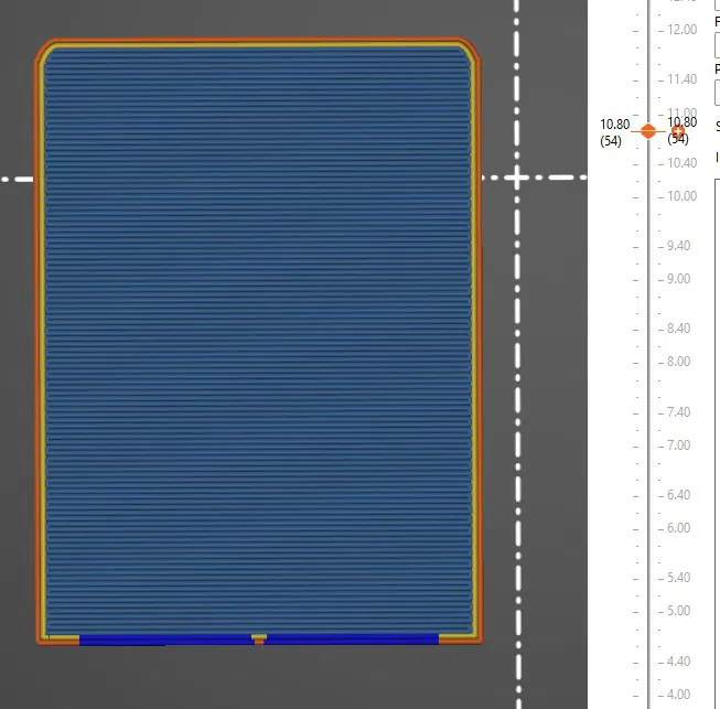 Một phiên bản khóa balo khác, được in từ PET-G với 3 lớp ngoại vi và 40% mật độ lưới gyroid. Phần "ngoài" có tích hợp sẵn phần đỡ (màu xanh) cần loại bỏ sau khi in. Kiểm tra cách cắt lớp (slicing) của chi tiết, đặc biệt là cầu nối ở lớp 10.7mm.