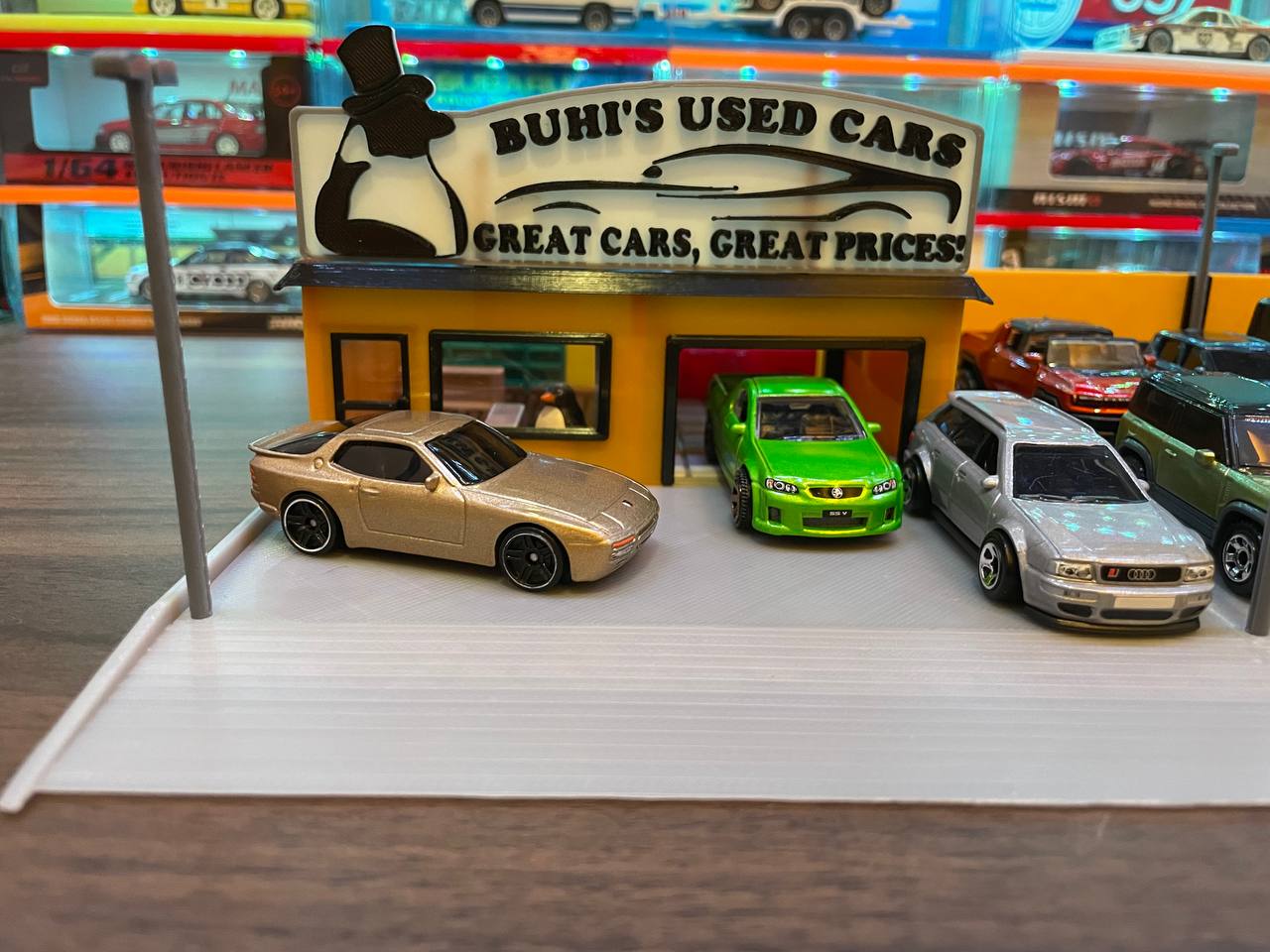 Mô hình trưng bày cửa hàng xe cũ tỉ lệ 1/64, thiết kế bãi xe lớn và văn phòng nhỏ. Mô hình chia làm 2 phần, có lỗ buộc xe và tùy chọn không lỗ. Cung cấp các bộ phận chi tiết cho tòa nhà, cửa gara, và phụ kiện trang trí. In ấn và lắp ráp dễ dàng với hướng dẫn chi tiết.