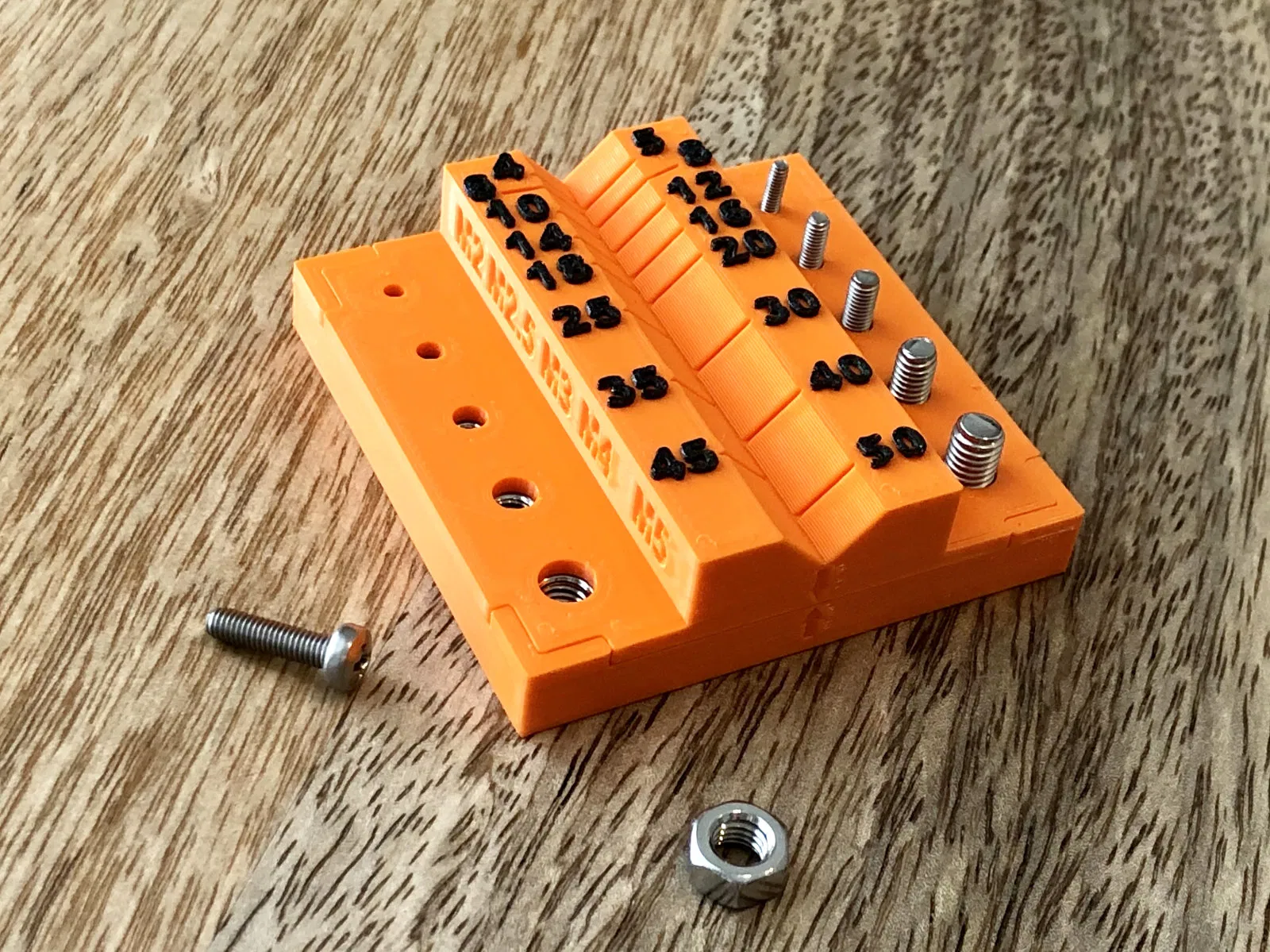Công cụ này đo vít hệ mét M2, M2.5, M3, M4, M5 và các loại đai ốc tương ứng. Được thiết kế để in không cần hỗ trợ, chỉ cần thêm phần cứng và đai ốc lục giác.