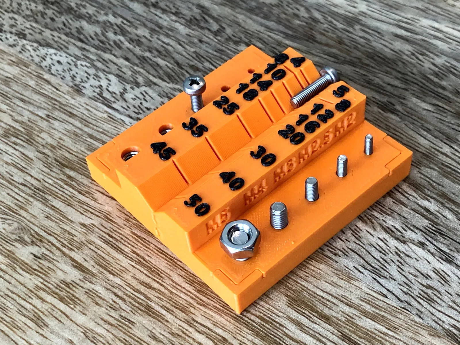 Tôi đã lấy cảm hứng từ rất nhiều công cụ đo vít tuyệt vời có sẵn để in, chẳng hạn như của Sneaks. Công cụ này đo vít hệ mét M2, M2.5, M3, M4 và M5 có chiều dài lên tới 50mm theo các độ dài tiêu chuẩn, cũng như các loại đai ốc tương ứng. Không cần phần cứng đặc biệt hay cài đặt nhiệt, chỉ cần thêm các đai ốc lục giác và vít vào đế, sau đó dùng một ít keo siêu dính để gắn phần trên vào đế. Cái này được mô hình hóa từ đầu và in mà không cần hỗ trợ. Tôi đã sử dụng phần cứng bằng thép không gỉ A2 từ Bolt Depot. Các vít này, dài 8mm Và các đai ốc lục giác này Tôi không biết liệu các phần cứng khác có vừa vặn đúng cách hay không - nếu kích thước và dung sai của đai ốc lục giác hoặc đầu vít hơi khác một chút.