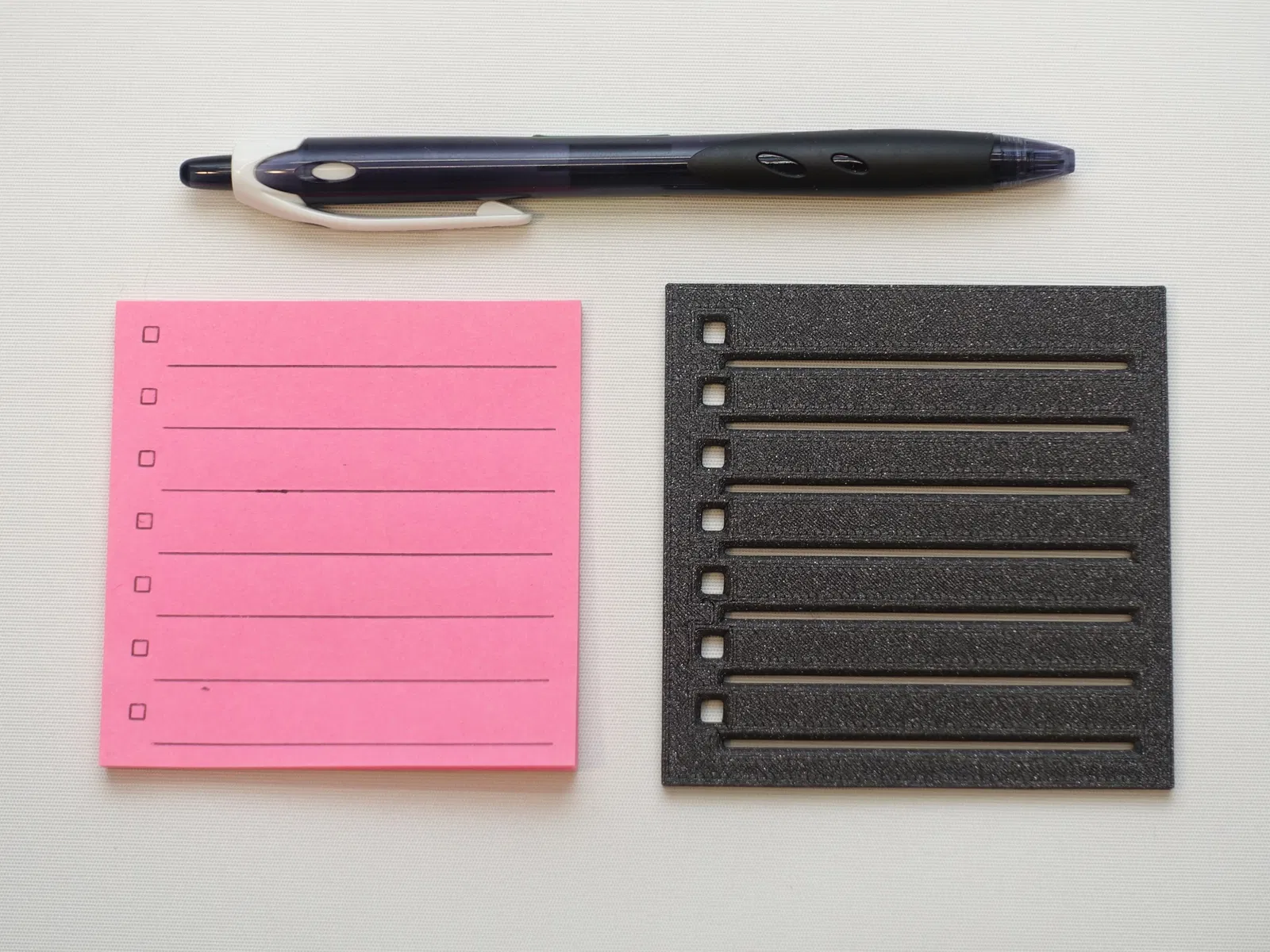 Khuôn kẻ dòng và ô vuông cho giấy ghi chú Post-it vuông (3x3 inch) và loại rộng (5x3 inch). Có phiên bản lỗ rộng hơn cho bút.