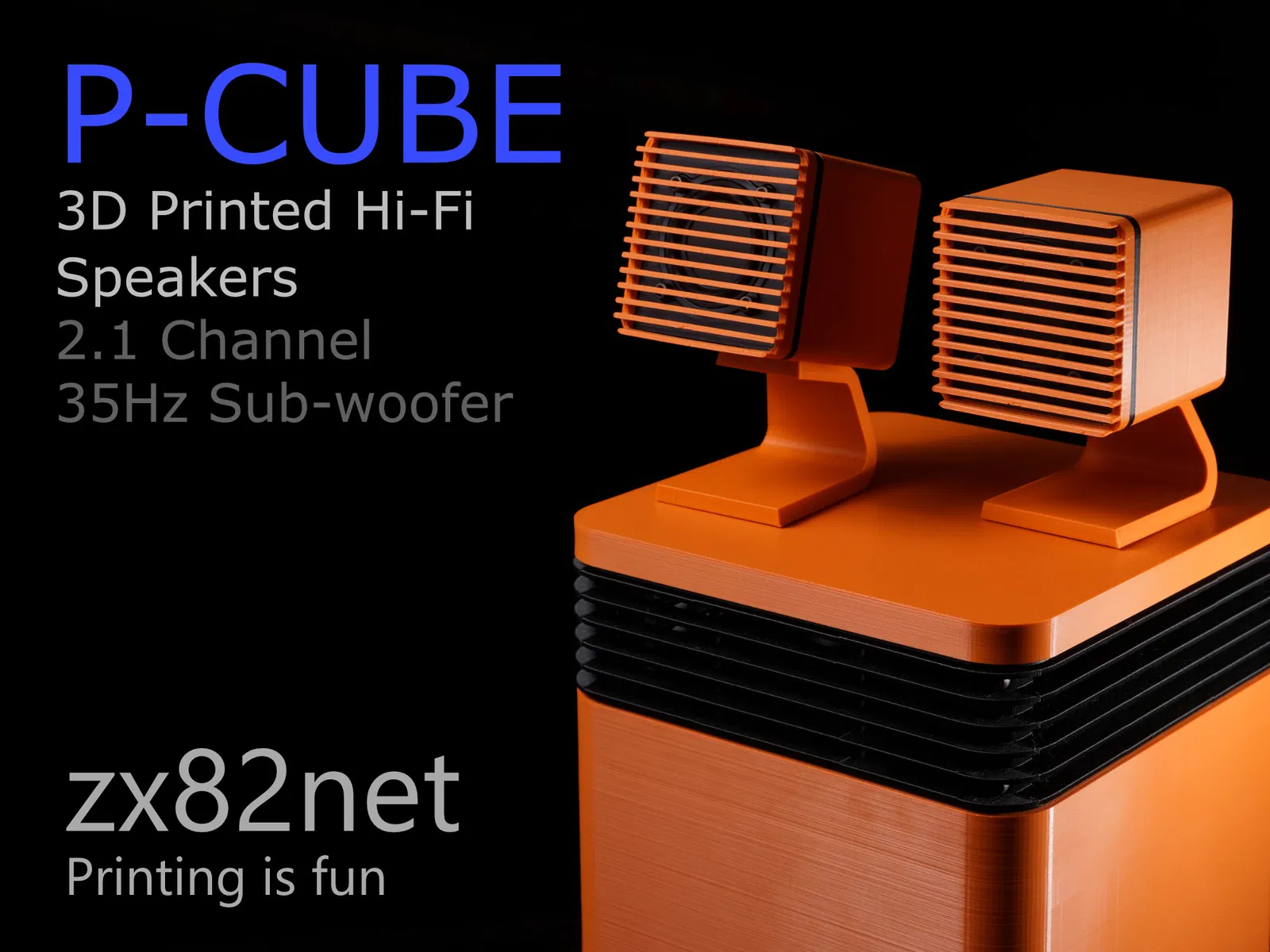 Đây là hệ thống loa mới nhất của tôi, nó là một bộ loa cao cấp được thiết kế để có thể in trên các máy in 3D có bàn in nhỏ, bao gồm cả Prusa Mini. Đây là hệ thống loa siêu trầm (sub-woofer) và loa vệ tinh có thể sử dụng như một hệ thống âm thanh nổi 2.1, hoặc một hệ thống rạp chiếu phim tại nhà.
