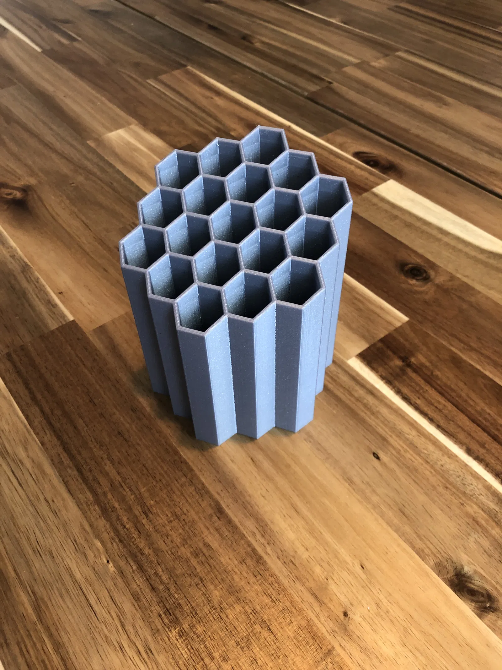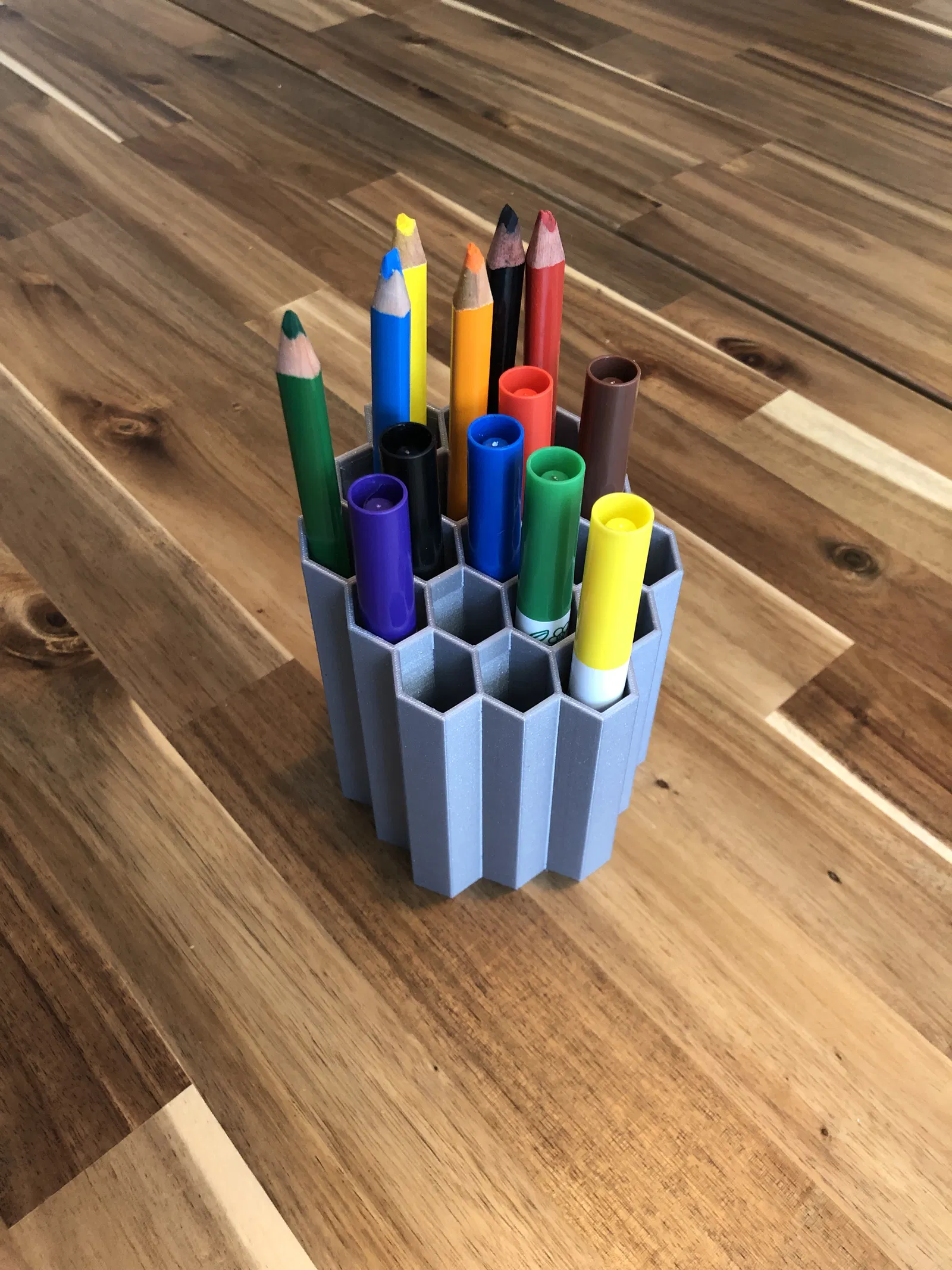 Giá đỡ bút rất đơn giản, được thiết kế trong Fusion 360 cho con gái 1 tuổi. Kích thước các ô hình tổ ong có thể dễ dàng sửa đổi trong tệp nguồn, phù hợp cho văn phòng.
