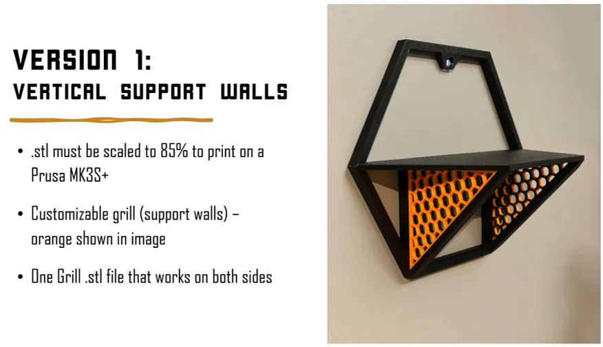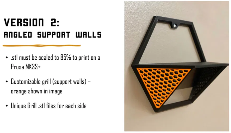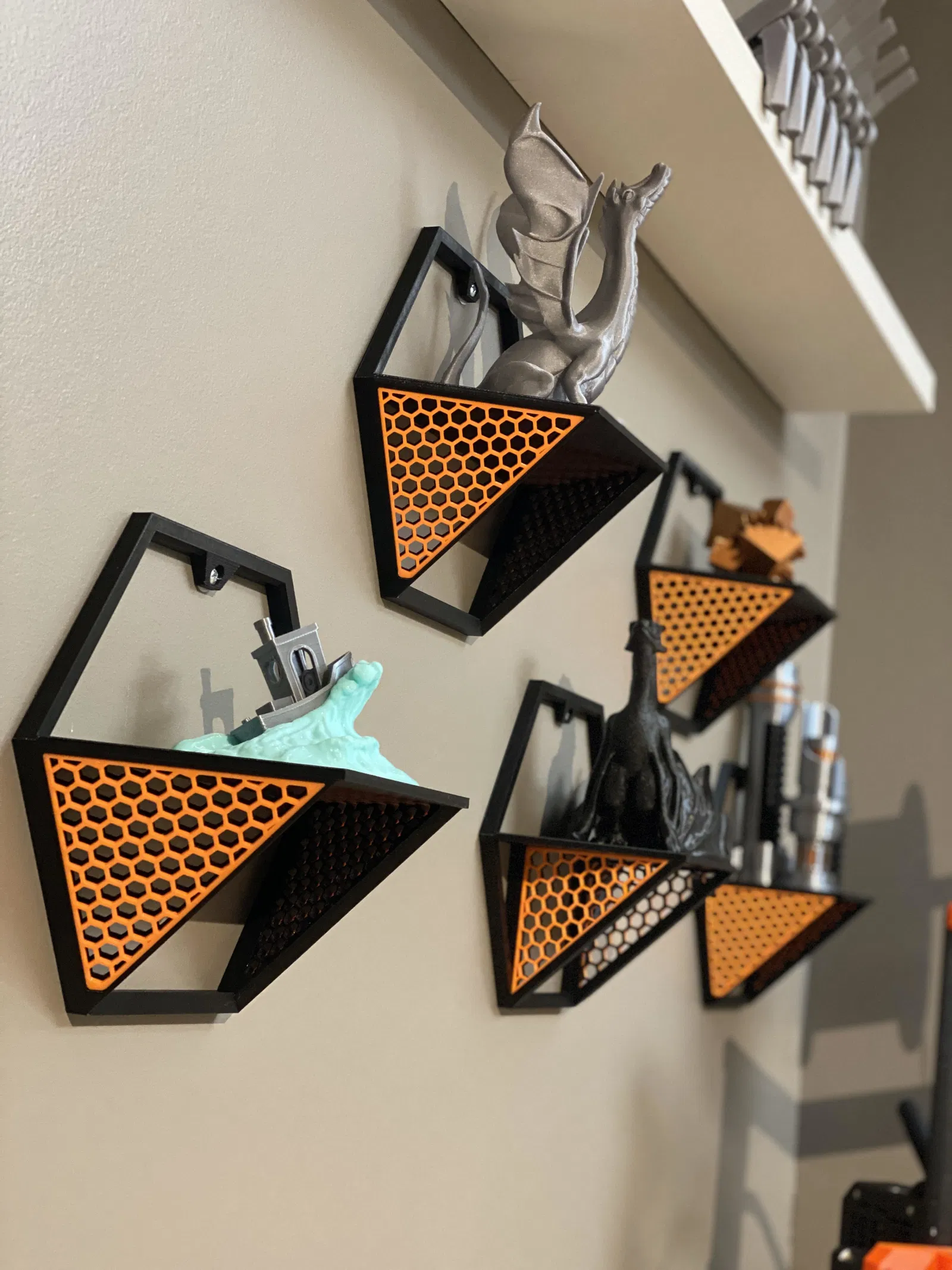 Hai phiên bản của một kệ trưng bày nhỏ để khoe những bản in yêu thích của bạn! Kệ có các lưới tổ ong tùy chỉnh có thể lắp ráp mà không cần keo, lý tưởng để che các bộ phận gia cố tường hoặc đơn giản là để trang trí.