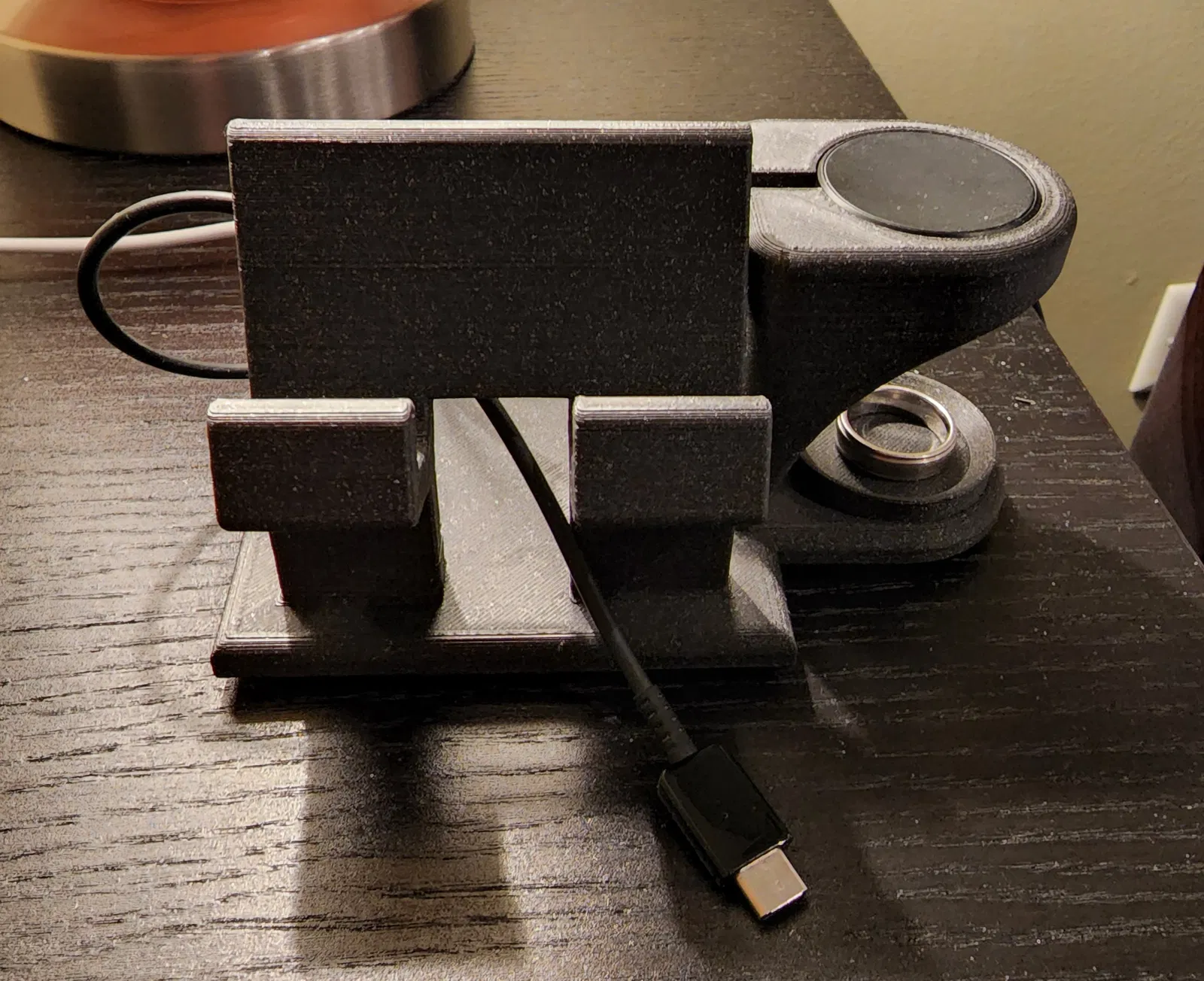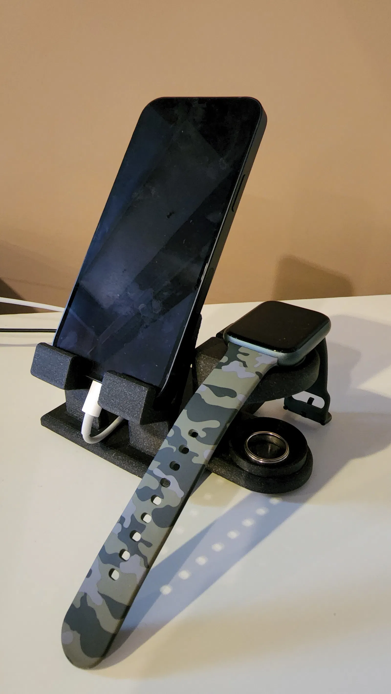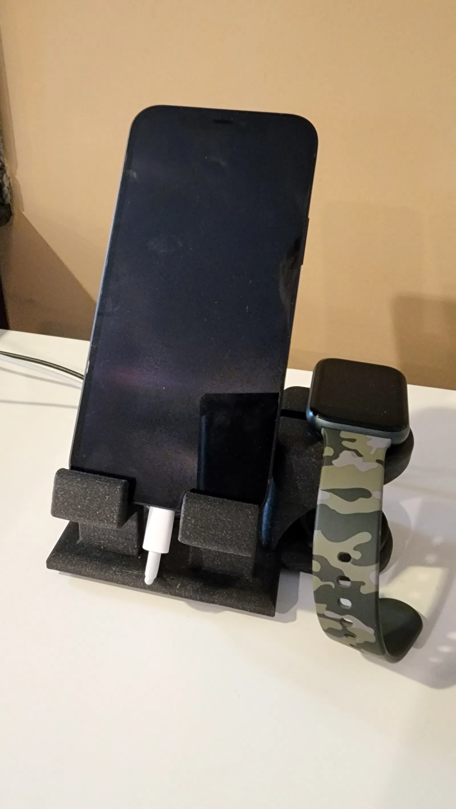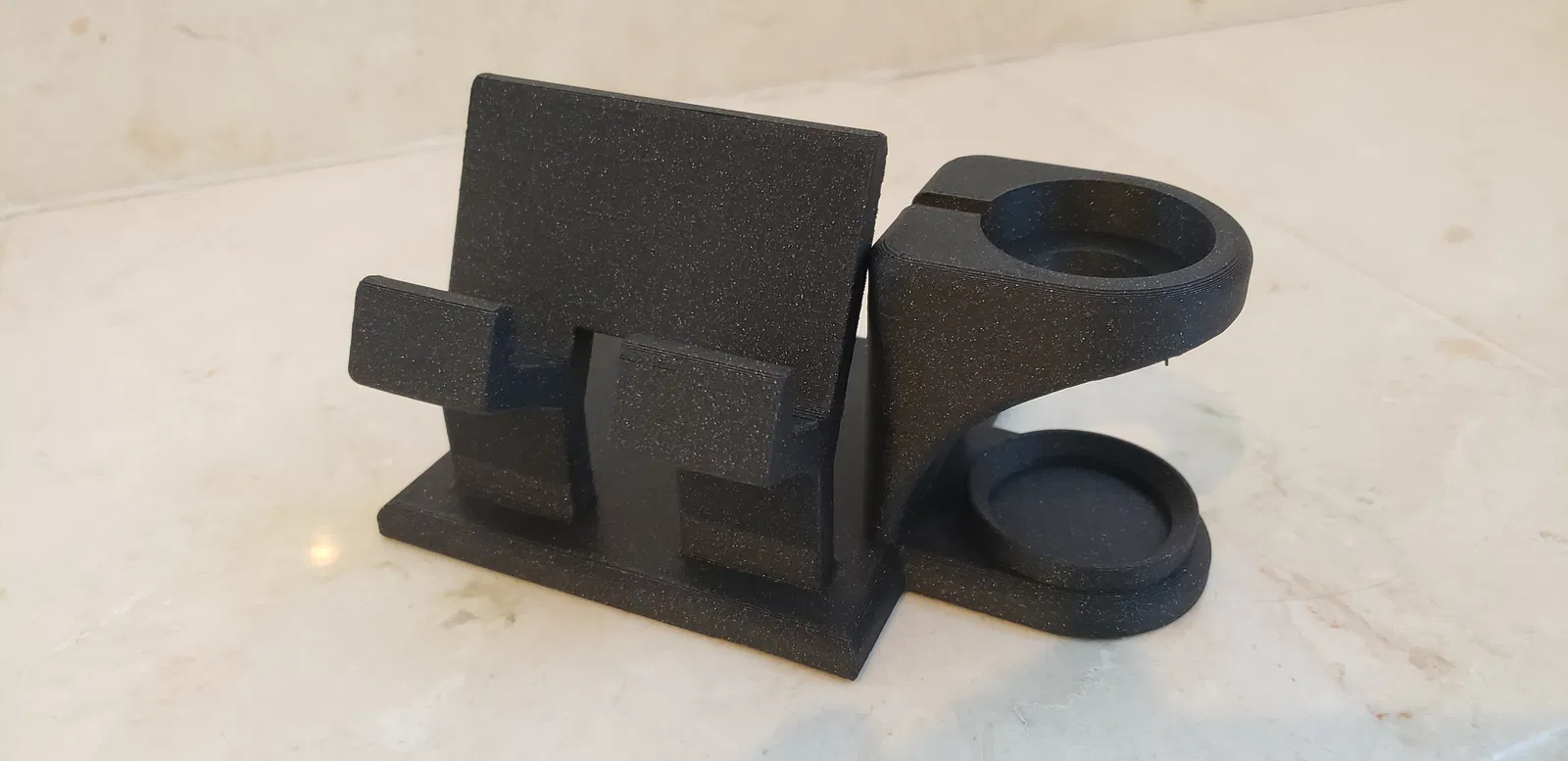 Một đế sạc được thiết kế đặc biệt cho iPhone và Apple Watch của bạn. Phiên bản này giữ bộ sạc không dây Apple Watch và có thêm không gian để đựng các vật dụng nhỏ như nhẫn. Sản phẩm in không cần hỗ trợ.