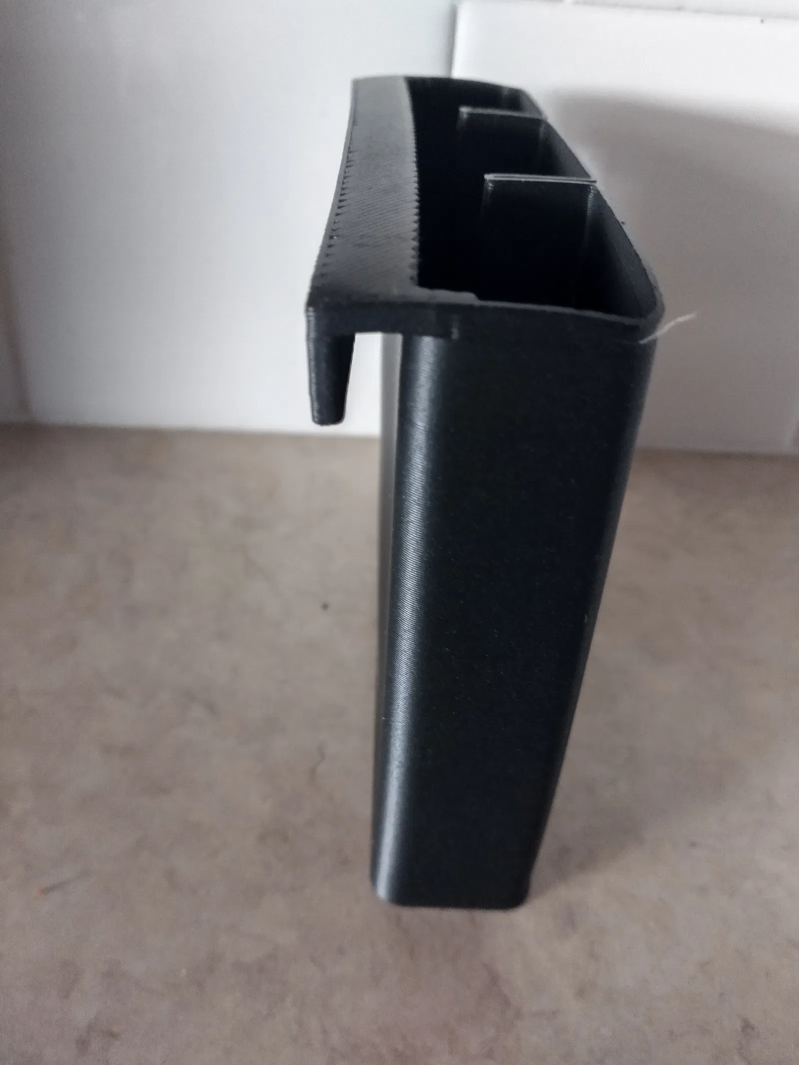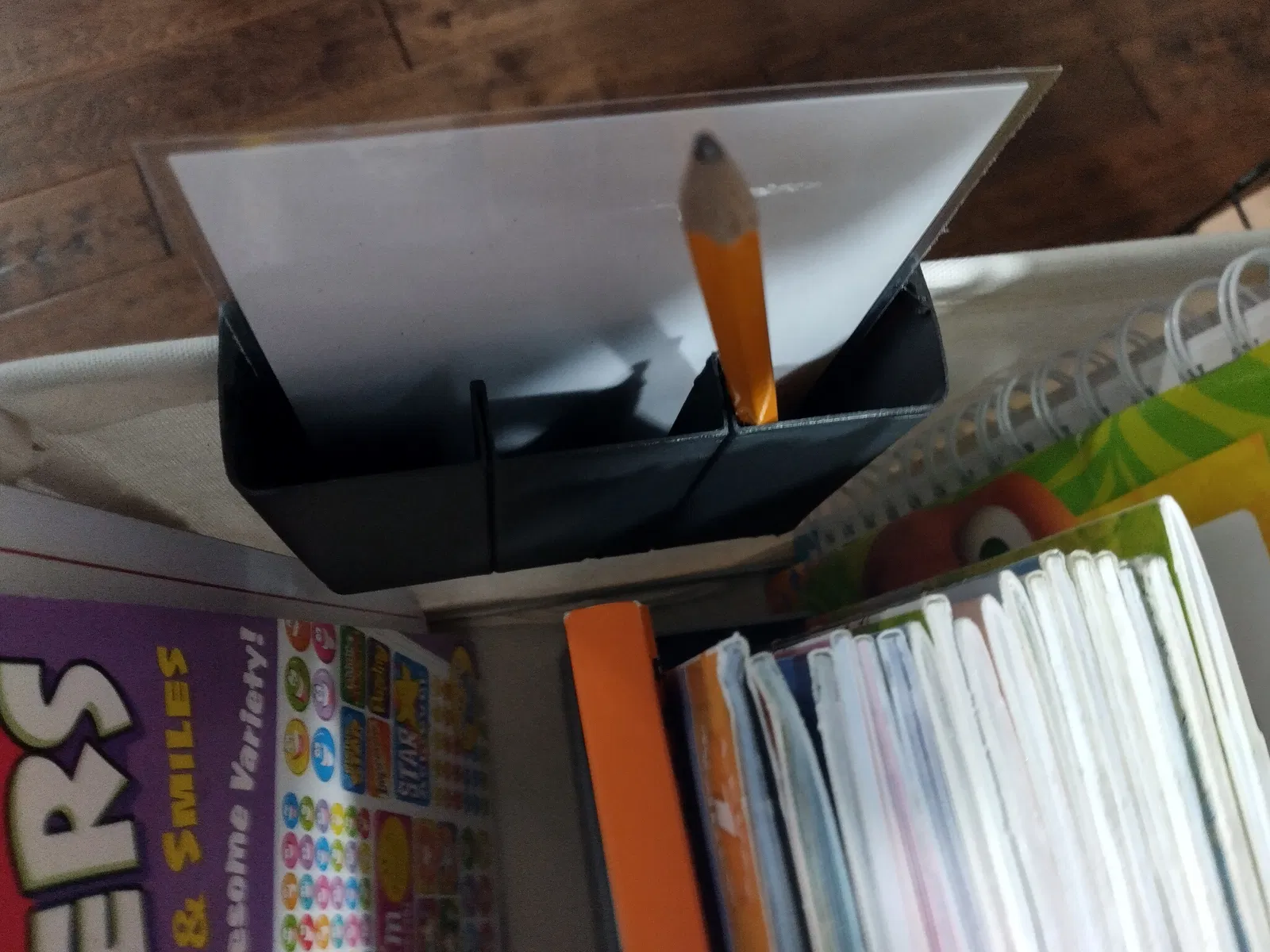 Hộp bút treo cạnh giỏ, có hai vách ngăn một phần giúp giữ dụng cụ viết không bị đổ mà không cản trở thẻ ghi chú.